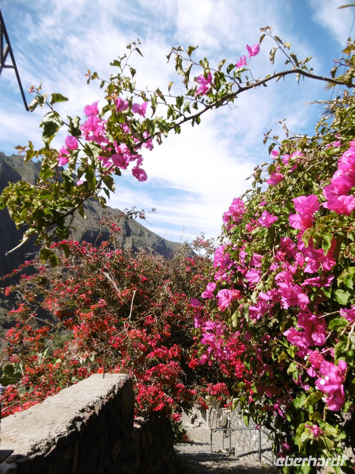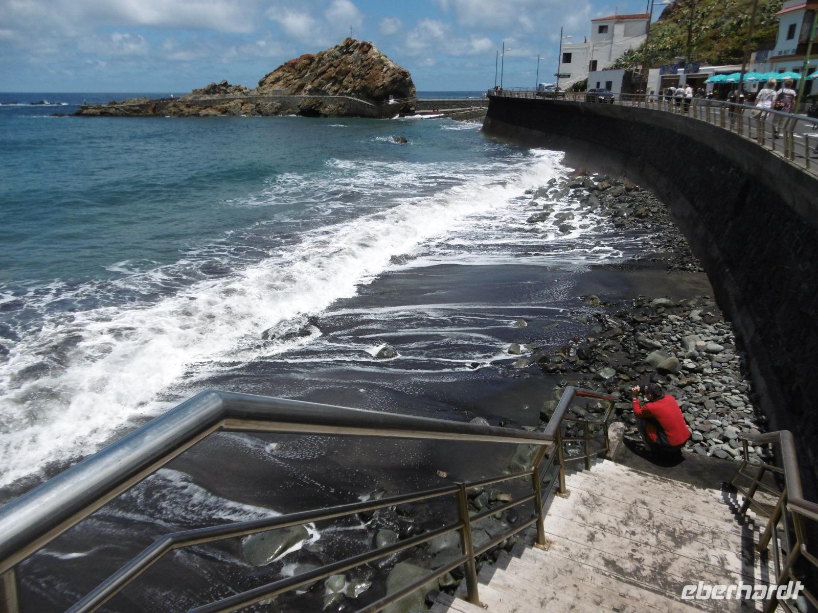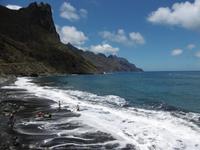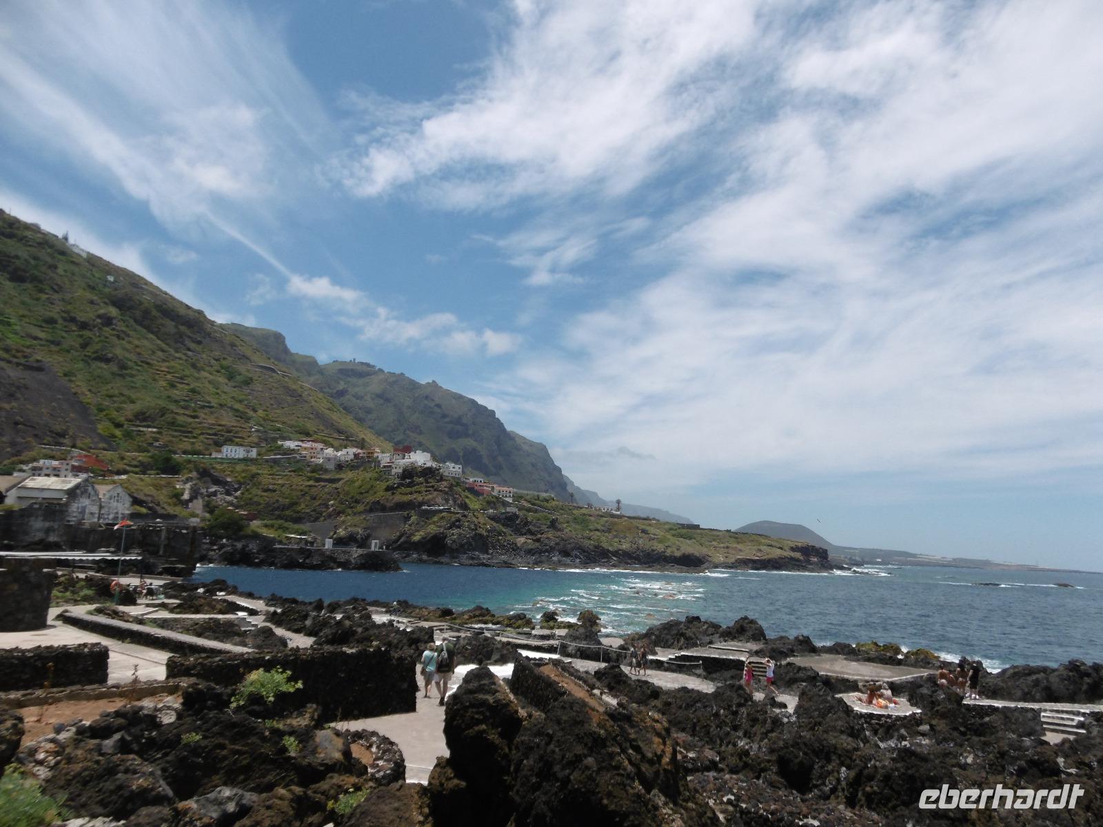 Auf dem heutigen Programm steht der Besuch der idyllischen kanarischen Dörfer mit den typischen Häuschen und den schmalen, malerischen Gassen. Wieder empfängt uns unverschämt gutes Wetter - es ist selten so konstant, schönes Wetter im Norden der Insel, wie wir es auf unserer Reise haben. Ein Glück! Gisela und unser heutiger Fahrer Canino führen uns wieder an der Westküste entlang (heute unterhalb der Autobahn) und zeigen uns die gigantischen Felsen bei Los Gigantes, die auch daher Ihren Namen erhalten haben. Ein toller Stopp für ein erstes Gruppenfoto. Dann schlengelt sich der Weg langsam ins Teno Gebirge empor und wir halten in luftiger Höhe am Mirador Cherfe und haben einen fantastischen Blick auf den Teide und die vorgelagerten Inseln La Gomera und La Palma. Diese sind hier nicht oft in voller Pracht zu sehen. Dann heißt es für uns Baucheinziehen und für Canino Augenzuunddurch ;) denn wir müssen nun auf der anderen Seite ins Tenogebirge hinab und zwar auf der berüchtigten, halsbrecherischen Serpentinenstraße von Masca. Mit unserem 10 Meter Bus ist dies schon ein richtiges Kunststück und Milimeterarbeit. In Masca angekommen regenerieren wir unsere strapazierten Nerven bei einem leckeren Ron Miel (kanarischer Honigrum) und gehen im Dörfchen spazieren, Kaktusmarmelade kosten oder Kaffee trinken. Lange Zeit lebten die Einwohner von Masca komplett abgeschieden von der Außenwelt und konnten die Schlucht nur per Esel verlassen. Seine Einzigartigkeit und tiefe Ruhe und Gelassenheit hat sich das kleine Dörfchen trotz täglich vieler Touristen bis heute bewahrt. Anschließend fahren wir auf der anderen Seite die Serpentinenstraße wieder hoch, doch diese ist im Gegensatz zur vorherigen Straße ein Kinderspiel. Nach Passieren der Wetterscheide sehen wir Buenavista del Norte mit seinem Golfplatz unter uns und fahren die Nordküste entlang bis nach Garachico. Diese Stadt war damals wichtiger Handelshafen von Teneriffa, wurde jedoch 1706 beim Ausbruch des Vulkan Montana Negra von einer Lava Lawine dem Erdboden gleichgemacht. Das Städchen ist nun auf der Lava wieder aufgebaut wurden und eine wahre Schönheit geworden. Hier kann man durch enge, kanarische Gassen oder an der Lavaküste entlang spazieren, typisch kanarische Speisen probieren, Souvenirs kaufen oder am ruhigen Pavillonplatz vor der weißen, frisch restaurierten Kirche einen Barraquito schlürfen. Nach der Mittagspause fahren wir noch ein Stückchen weiter und erreichen das ruhige Dörfchen Icod de los Vinos, bekannt für seinen angeblich tausend jährigen Drachenbaum, welchen wir ebenfalls besuchen. Über die Westküste fahren wir wieder zurück in unseren sonnigen Übernachtungsort Las Americas.