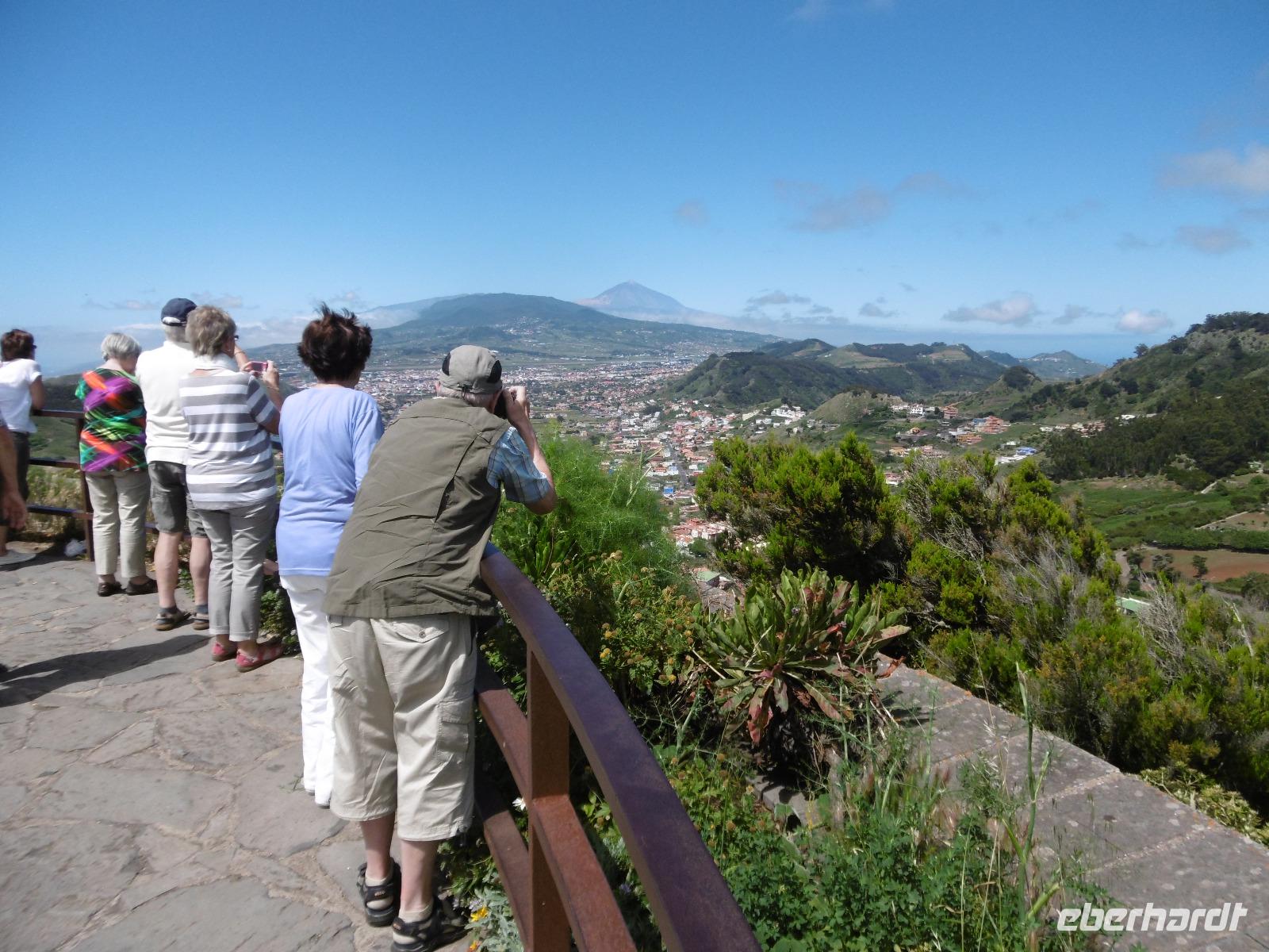 Nach dem Frühstück begeben wir uns erneut in den grünen Norden der Insel. Zunächst besichtigen wir die UNESCO Weltkulturerbestadt San Christobal de la Laguna und lernen deren historische und architektonische Schätze bei einem Stadtrundgang kennen. In der Kirche findet gerade eine Erstkommunionszeremonie statt. Weiter geht es zum samstäglichen Markt. Hier findet gerade ein Stadtfest statt. Auf dem Platz werden Adoptionsfamilien für Hunde gersucht, Judokämpfer und Trommler zeigen ihr können und für die Kleinen steht eine Hüpfburg bereit. Wir verweilen etwas bei dem bunten Treiben und besuchen auch die Markthalle, in welcher regionale Köstlichkeiten angeboten werden. Wir verabschieden uns von La Laguna und fahren weiter ins Anagagebirge. Unser erster Stopp ist der Mirador Jardin, wo wir bei strahlenden Sonnenschein einen atemberaubenden Blick auf den Teide und die im Tal unter uns liegenden Städte La Laguna und Santa Cruz genießen. Zeit für ein Erinnerungsgruppenfoto! Bei unserer Weiterfahrt, tiefer ins Gebirge hinein ziehen Nebelschwaden auf und geben dem märchenhaften Loorbeerwald vom Anagagebirge einen mystischen Anblick. Nun fahren wir wieder hinunter an die Küste, vorbei am anmutigen Bergdörfen Taganana zu den charakteristischen Felsen Roques de las Bodegas. Hier gibt ein ein bei Touristen wie Einheimischen gleichermaßen beliebtes Restaurant namens Casa Africa. Wir kosten frischen Cherne oder Pulpo Tintenfisch mit traditionellen Papas Arrugadas und den Mojosoßen. Ein kleiner Spaziergang an den Klippen schließt unseren heutigen Ausflug ab. Wir fahren zurück in den Süden und legen auf dem Weg noch einen Stopp am lagen weißen Sandstrand Playa de las Teresitas und am Opernhaus Auditorio von Santa Cruz ein. Im Meer unter den Auditorium finden wir große Felsbrocken an denen berühmte Musiker und Komponisten aus der ganzen Welt angemalt wurden.