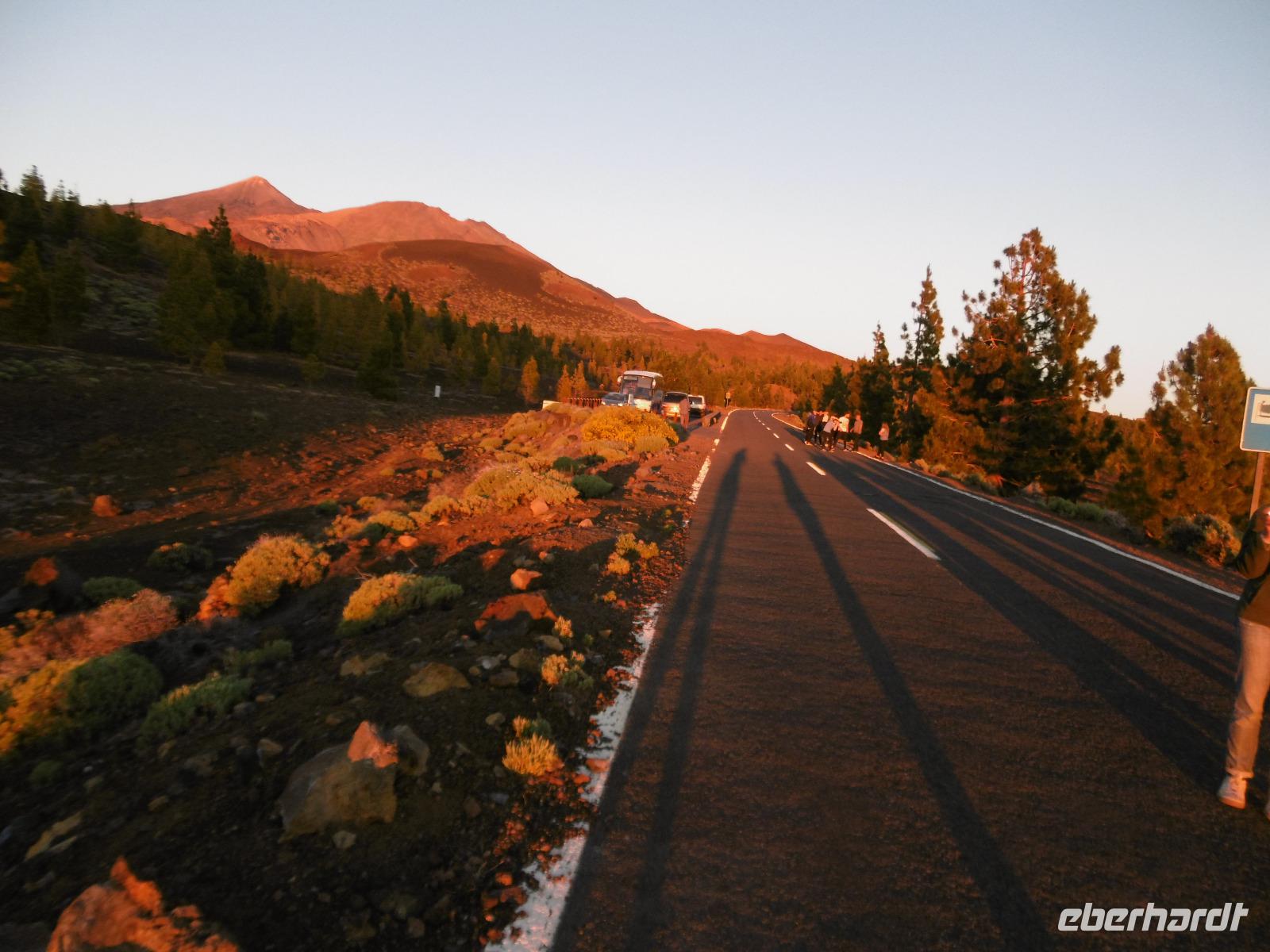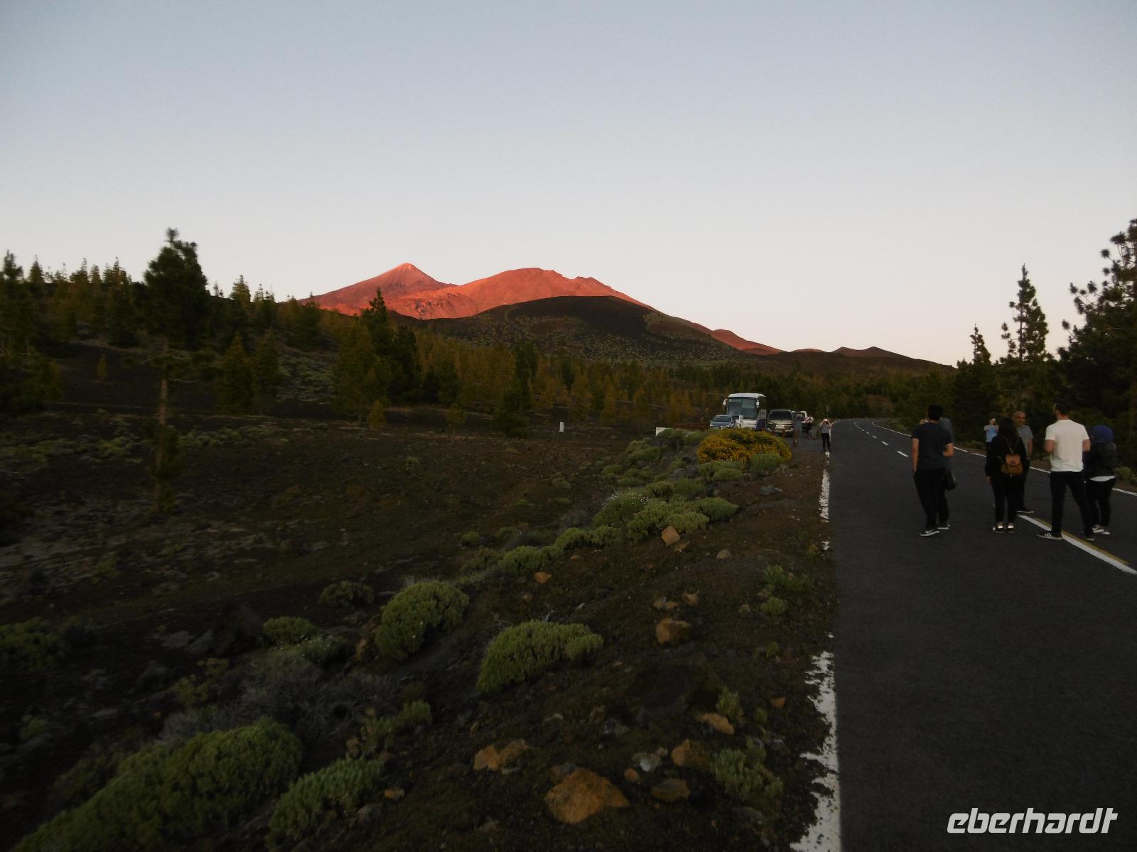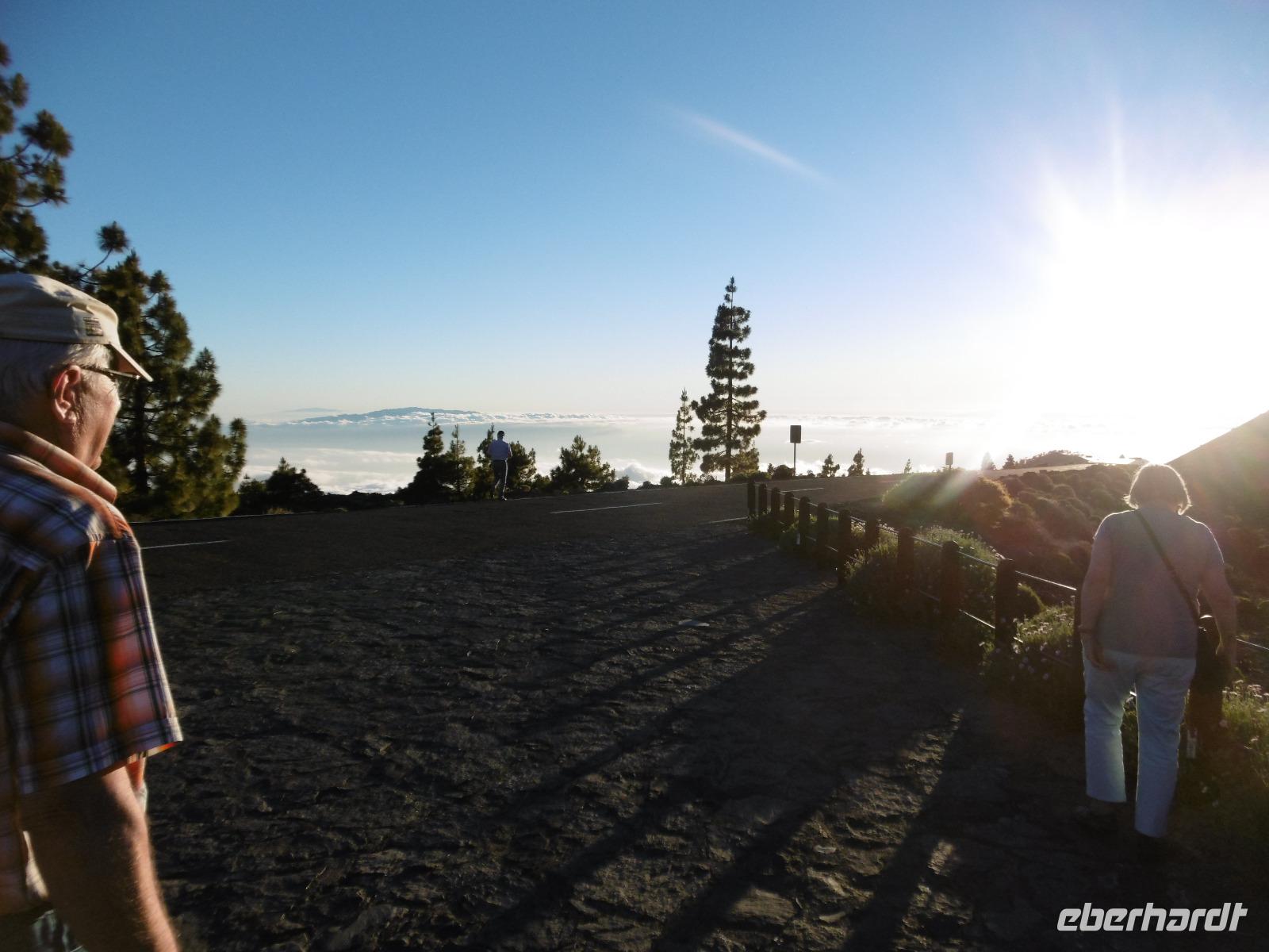 Unsere letzter Tag auf der Sonneninsel Teneriffa bricht an. Ein langer Abend steht uns bevor, daher startenn wir heute erst um 15.00 Uhr. Ein gemütlicher Morgen mit späten Frühstück und einem kleinen Strandspaziergang. Nach dem Mittagessen im Hotel brechen auf ins Gebirge und fahren die Serpentinen zum Canadas del Teide Nationalpark hoch. Erster Stopp ist das höchstgelegendste Dorf Spaniens Vilaflor. Hier machen wir eine kleine Pause uns haben Gelegenheit einen Barraquito zu trinken oder die hier typischen Mandelkekse zu kaufen. Hier in Vilaflor finden wir auch den Pino Gordo - eine riesige, uralte Kiefer. Acht Personen brauchen wir um den dicken Stamm zu umschlingen! Dann geht es weiter hinauf ins Gebirge. Der Weg beschert uns wunderschöne Ausblicke auf die unter uns liegenden Täler und die Nachbarinseln. Wir sehen auch Waldabschnitte, welche damals 2012 von einem riesigen Waldbrand verschlungen wurden und sich nun wieder langsam regeneriert haben. Gegen 17 Uhr erreichen wir den Mittelpunkt des Nationalpark und fahren am Fuße des Teide entlang. Erster Stopp ist am "Schuh der Königin", dem Zapatilla de la Reina, wo wir einen kleinen Pfad entlang gehen. Hier oben gibt es nur sehr karge Vegetation. Typisch für die hier vorherschende Flora ist der Teide Natternkopf, welcher im Frühling herrlich rot blüht. Unsere Reiseleiterin Gisela erklärt uns auf der Weiterfahrt die Verschiedenen Lavagesteinsarten, welche wir hier gut erkennen können und deren Entstehung. Wir halten am Mirador Tabonal Negro uns sehen in auf einem mondlandschaftähnlichen Feld Glaslava. Weiter geht es zu den Roques, wo wir einen postkartentauglichen Blick auf den Teide und die charakteristischen Felsen, darunter dem "Finger Gottes" haben. Hier gibt es - Überraschung - ein kleines Picknick mit kanarischen Spezialitäten für alle. Ziegenkäse, Gofioteig, "kanarische Hochzeit", Jamon, Turron und Wein. Uns das alles bei einem tollen Blick auf den Teide. Bei Parador, einem exklusiven Berghotel direkt am Teide gibt es eine weitere kleine Überraschung. Wir verweilen gemütlich im Kaminzimmer des Hotels und stoßen bei einem Glas Sekt auf die hinter uns liegende Reise an. Bald geht die Sonne unter, der Hauptgrund unseres Ausfluges in diese Höhenlandschaft - denn der Sonnenuntergang ist hier vom Nationalpark aus gesehen ein ganz besonderes Highlight. Wir fahren zum Mirador Samara und suchen uns einen gute Sicht auf die unter uns liegenden Inseln El Hierro, La Palma und La Gomera, welche allmählich in ein magisches Licht getaucht werden. Dazu gibt es Schokolade und kanarischen Honigrum Ron Miel für alle und wir sehen entspannt dem Tagesende entgegen. Als die Sonne untergeht färbt sich der Teide hinter uns hellrot! Auf der Rückfahrt in den Süden erzählen wir uns lustige Geschichten und lauschen der Legende vom bösen Koyoten im Vulkan Teide. Ein gelungener Reiseabschluss!