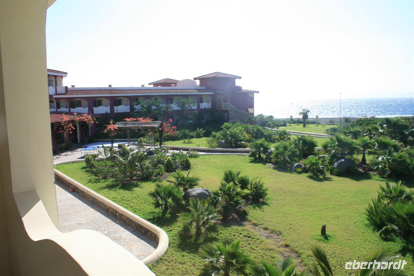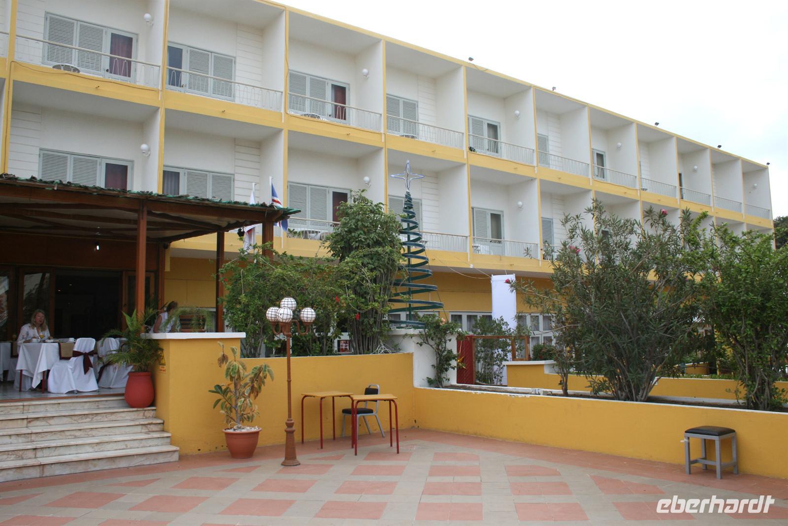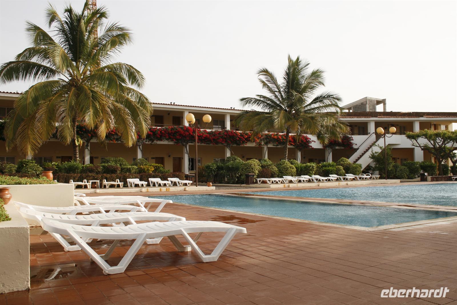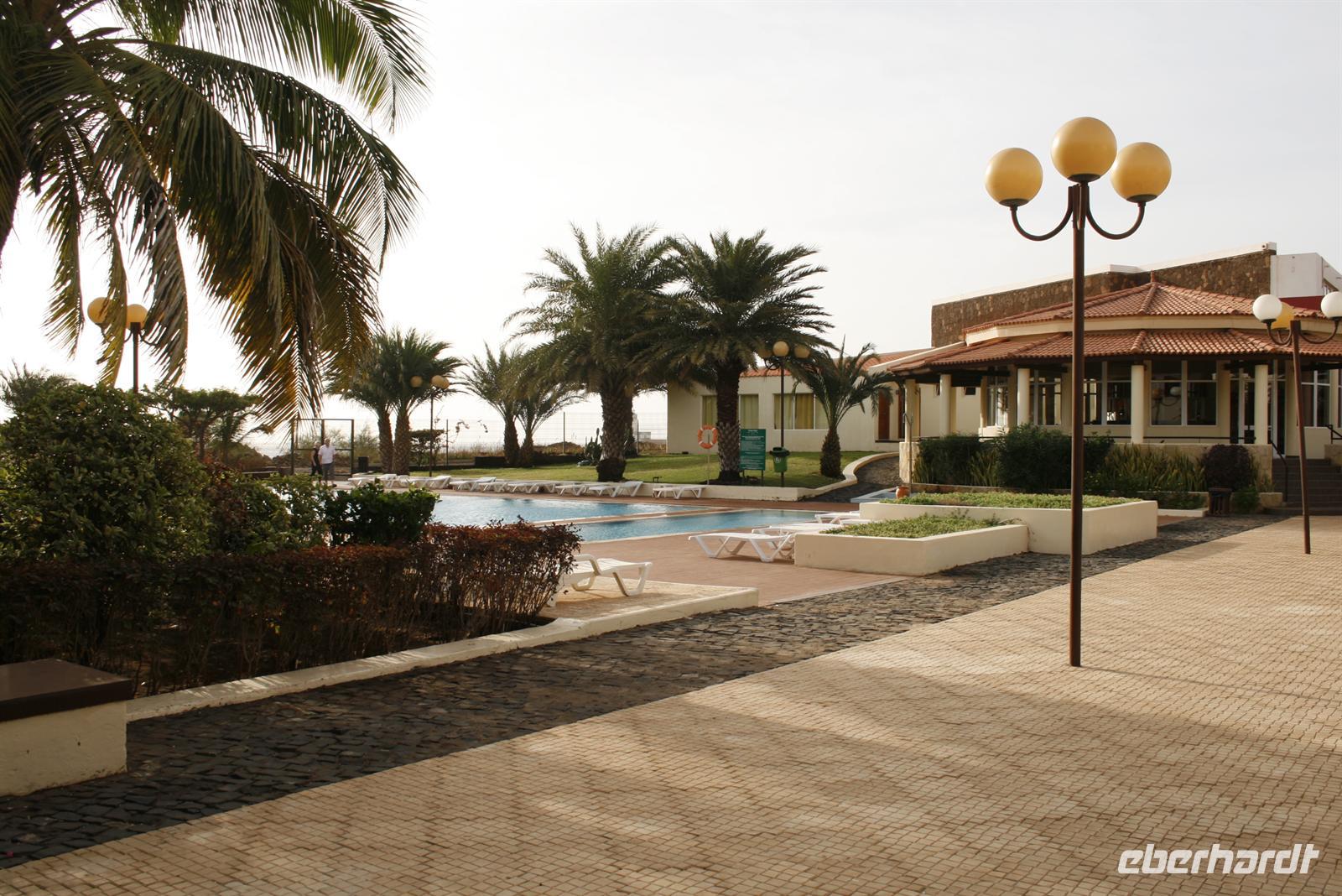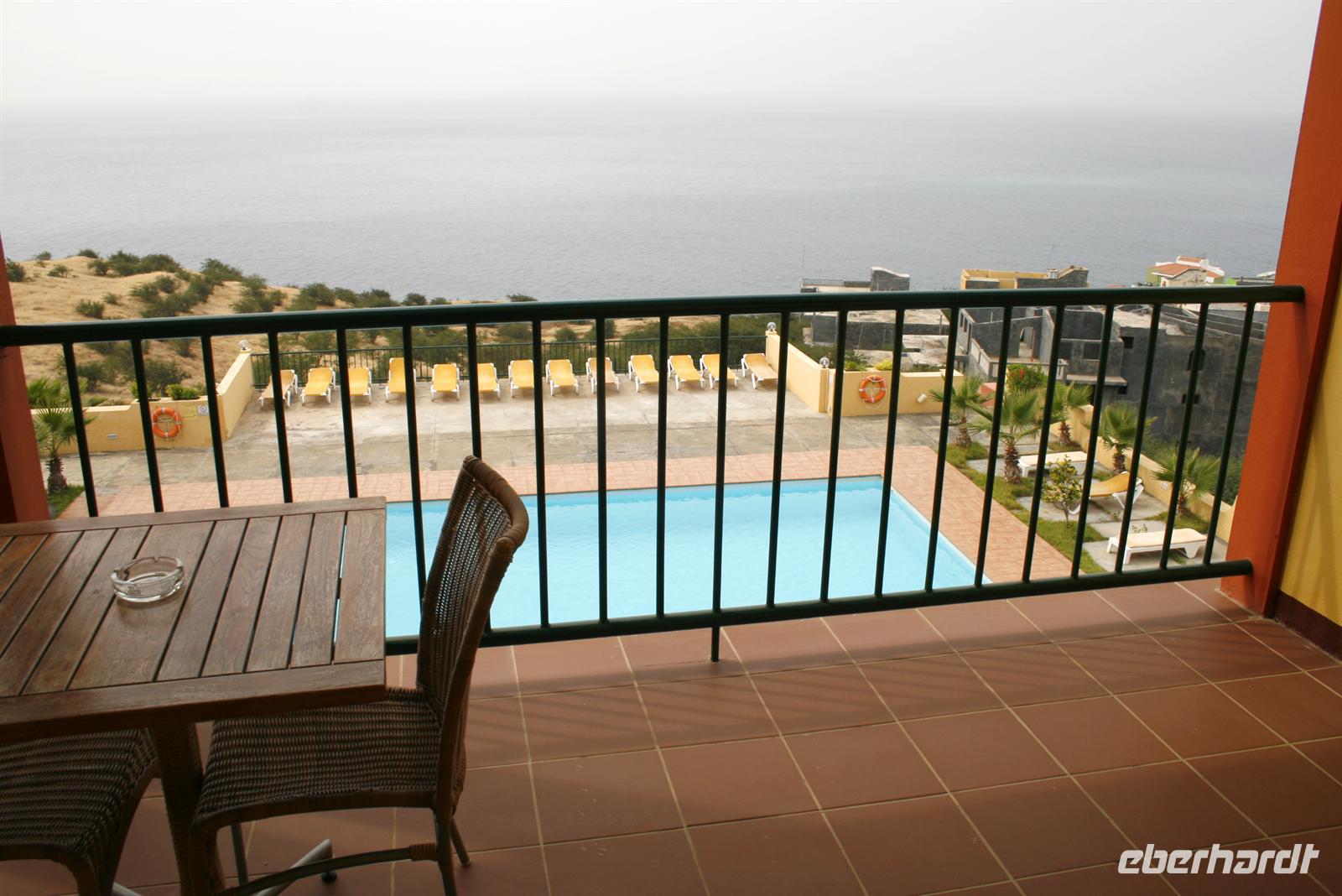 Der Flughafen von Fogo ist noch kleiner als der in Praia. Das Kofferband ist nur etwa 5 Meter lang und es geht etwas chaotisch zu, bis jeder seinen Koffer hat. Am Ausgang wartet schon unsere örtliche Reiseleiterin Annica auf uns. Mit zwei Kleinbussen fahren wir zu unserem Hotel "Xaguate" in Sao Filipe, der Hauptstadt von Fogo. Wir beziehen unsere Zimmer in dem kleinen, gemütlichen Hotel direkt oberhalb der Atlantikküste. Es gibt einen großen Meerwasser-Swimmingpool mit Sonnenliegen und Poolbar, ein kleines Restaurant und einen Aufenthaltsraum neben der Lobby. Die obere Etage ist bequem per Lift erreichbar. Die Zimmer verfügen über einen großen Balkon, Bad mit Dusche und WC, Zimmersafe, TV und Telefon.