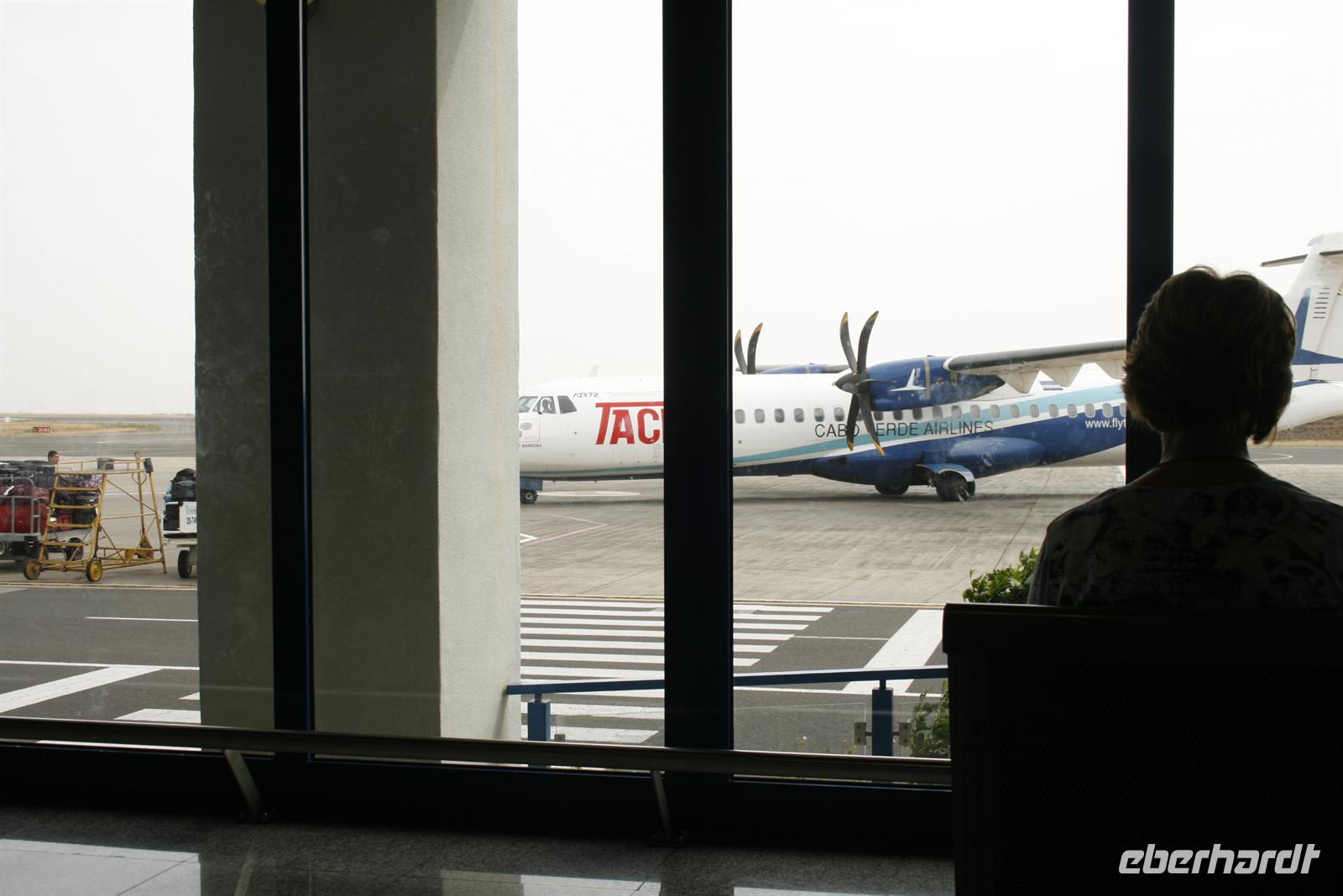 Nach nur wenigen Stunden Schlaf treffen wir uns zum Frühstück im Hotel. Das Frühstücksbuffet ist sehr gut und wir stärken uns kräftig. Dann geht es im Kleinbus zum Flughafen. Kofferträger und Fahrer helfen gegen ein wenig Trinkgeld beim Transport der Koffer. Check In der Abflughalle des Flughafens Praia. Hier muss man seinen Pass zeigen und kann zum Schalter vor gehen. Wir bekommen die Bordkarten. Dann gehen wir zur Abflughalle für die Inlandsflüge (domestic departures). Hier zeigen wir die Bordkarte und den Pass und werden hinein gelassen. Getränke kann man übrigens mitnehmen, auch eine Taschen- und Sicherheitskontrolle gibt es nicht. Vor der Halle gibt es einen Kiosk, an dem man Getränke holen kann. In der kleinen Transferhalle gibt es Sitzmöglichkeiten und Toiletten sowie einen Getränkeautomaten, für den man allerdings einheimische Münzen braucht. Unser Flugzeug nach Fogo hat etwa eine Stunde Verspätung.
