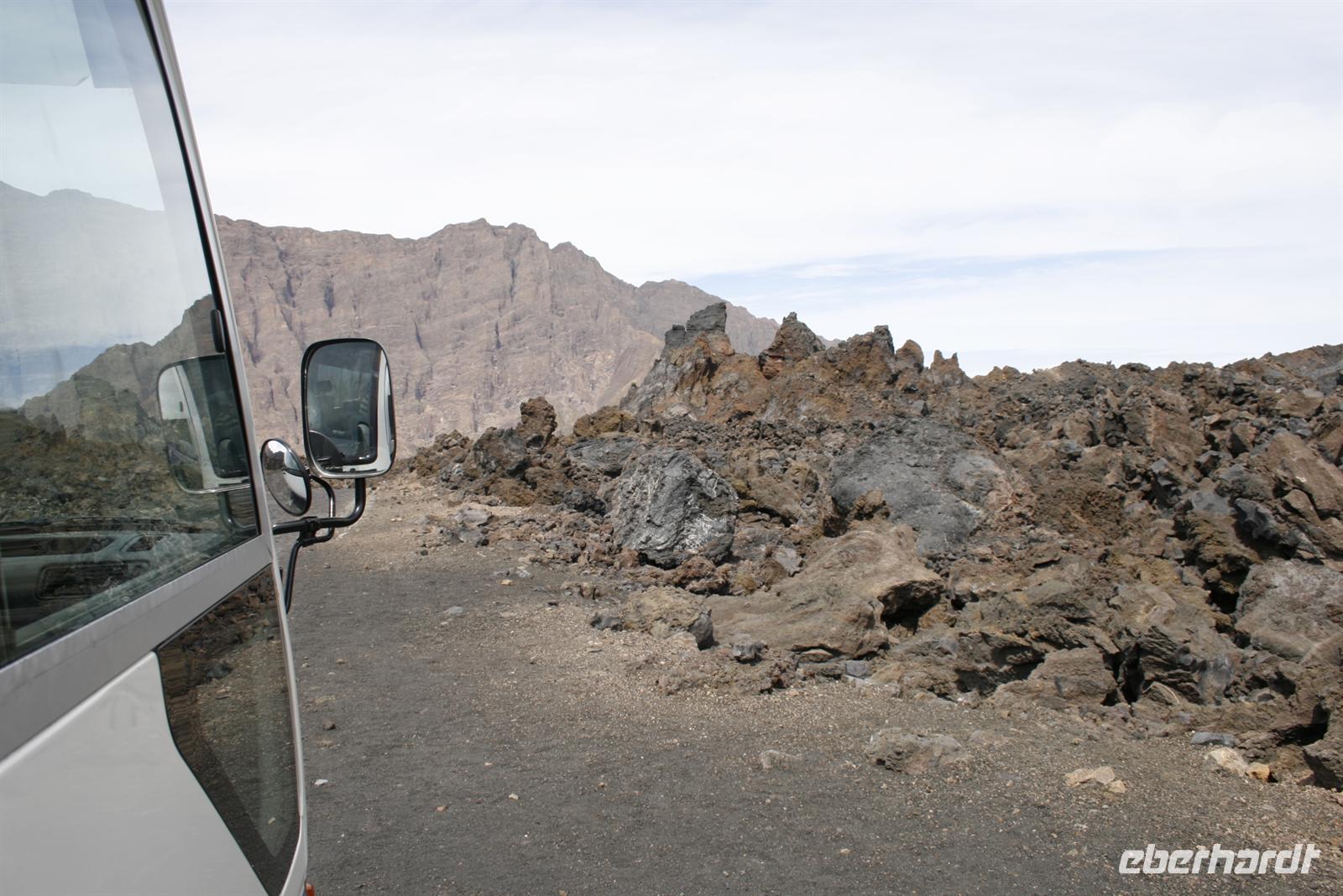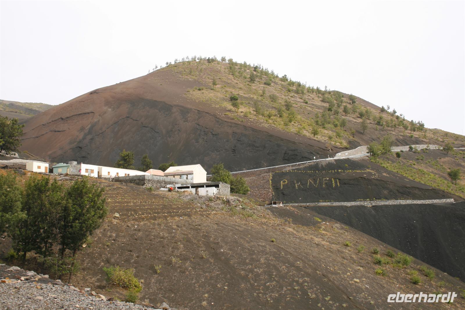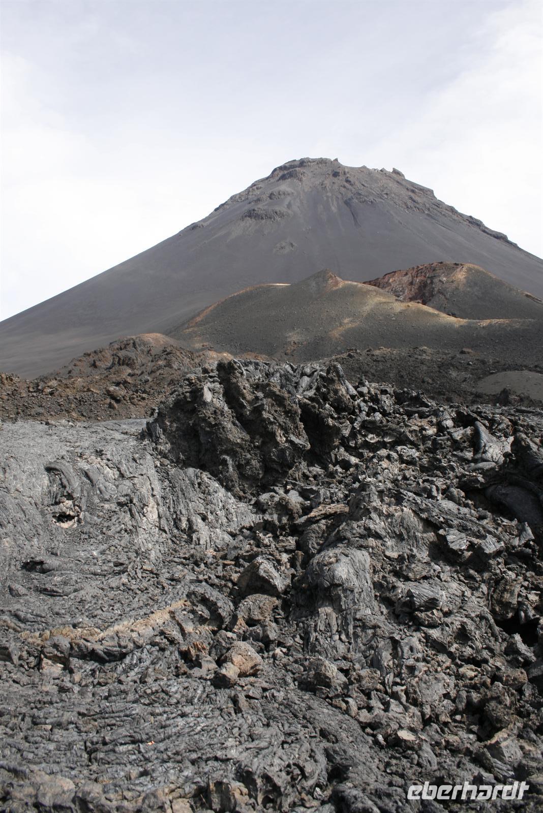Weiterfahrt durch die Lavalandschaft am Fuße des Pico und der Bordeira, der Krater-Steilwand, die die Hochebene begrenzt und die nur auf der Westseite der Insel Fogo noch erhalten ist. Wir sind in der Caldeira auf einer Höhe von 1400 bis 1600 Metern. Die Bordeira ist etwa 2600 Meter hoch, der Pico 2829 Meter. Er ist neben dem Teide auf Teneriffa der zweithöchste Berg der Atlantischen Inseln. Zelito zeigt uns die zwei verschiedenen Lava-Arten: eine schnellfließende und damit gefährlichere AA-Lava und eine langsamere B-Lava. Wir machen mehrere Fotostopps in der vulkanischen Mondlandschaft und am Pico Pequeno, dem kleinen Pico, der 1995 das letzte Mal ausgebrochen ist. Seine Lavamassen blieben innerhalb der Caldeira. Damals gab es hier schon keine Einwohner mehr direkt an den Vulkanen. Beim Ausbruch 1951 wurden mehrere Häuser unter der Lava begraben und die Einwohner flüchteten in die nebenliegenden Dörfer Portela und Baghueira. Diese besuchen wir als nächstes.