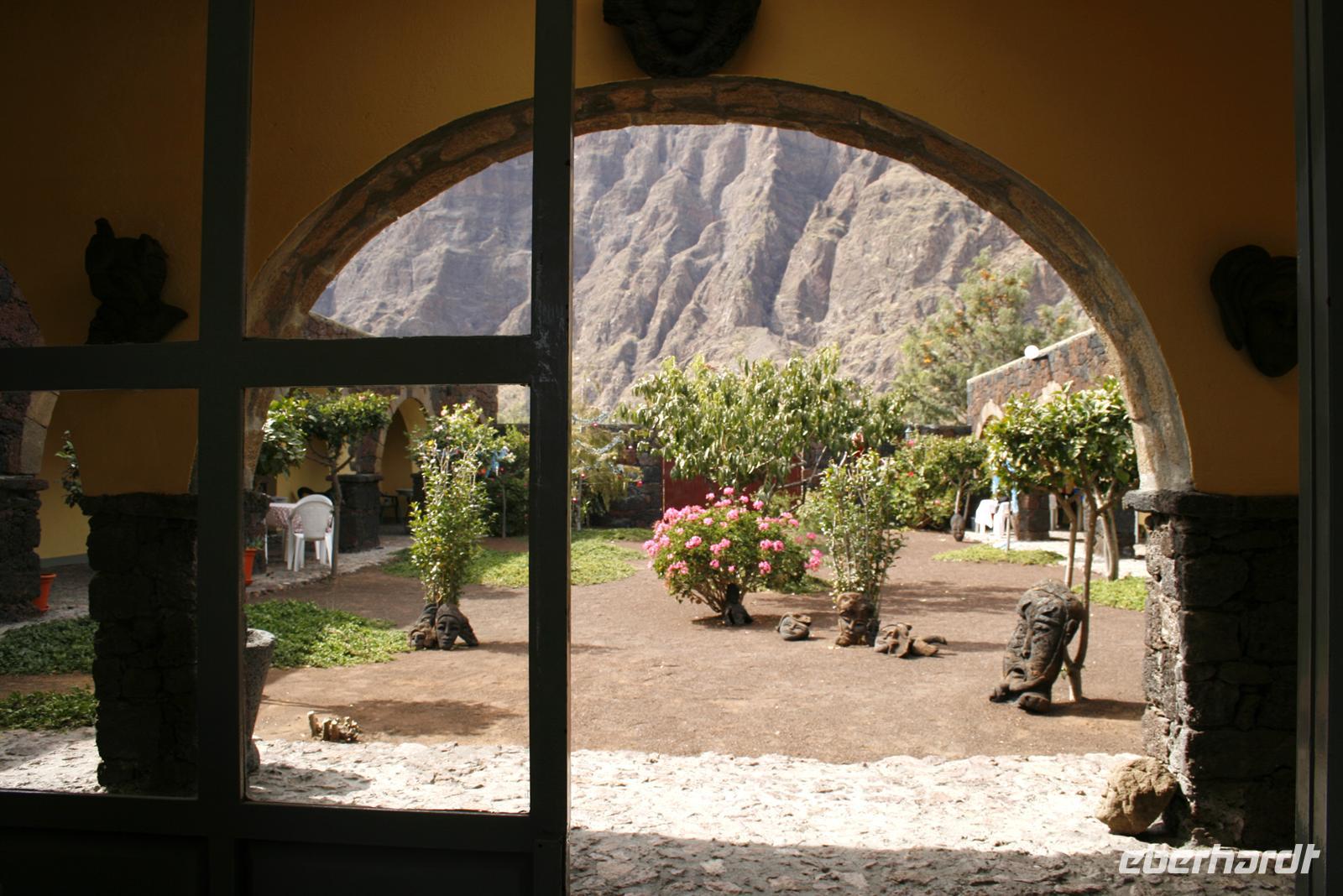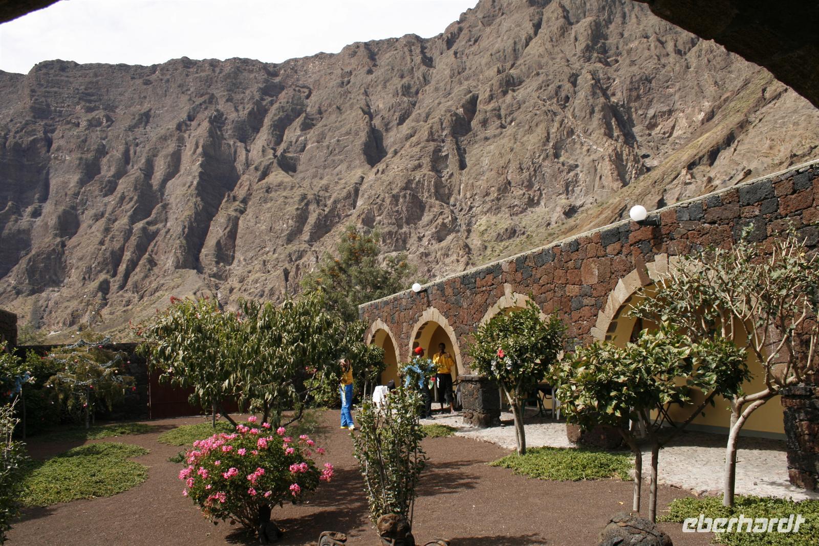 Im flachen Krater des erloschenen Vulkans wird heute Landwirtschaft betrieben. Wir haben Glück, denn wir können einen Blick in den Krater von oben werfen. Sonst ist es hier oft neblig und die Wolken ziehen bis hinunter in den Krater. Wir fahren die kleine Straße hinein in den Krater und unternehmen einen kleinen Spaziergang. Da es nun langsam dunkel wird, ist es Zeit für unsere Rückfahrt zum Hotel. Vom Cova-Krater fahren wir etwa eine Stunde das Bergland hinab bis zur Küste an der Südseite der Insel. Gegen 18.00 Uhr erreichen wir unser Hotel "Santantao Art Resort".