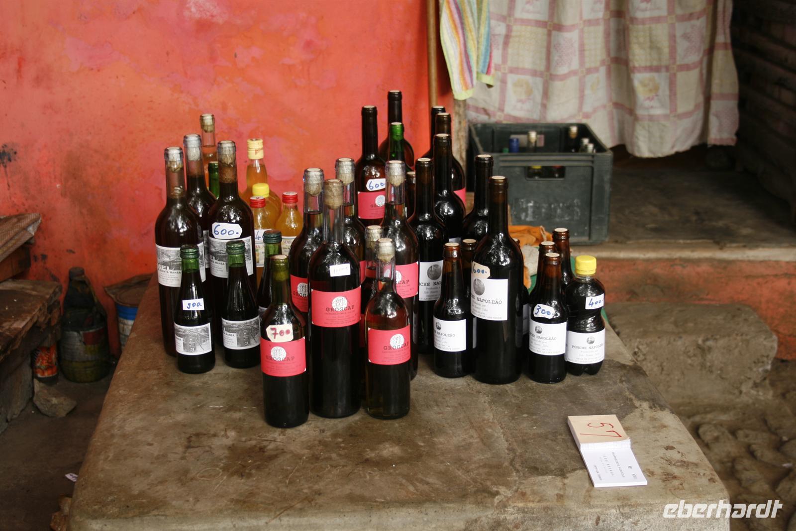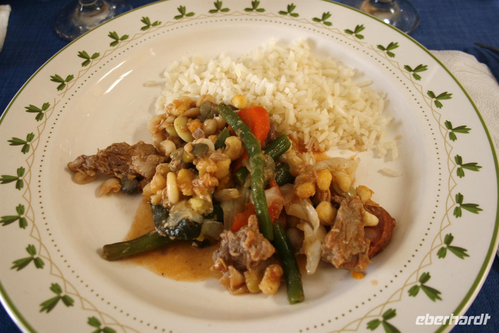 In Portelo kehren wir gegen 13.00 Uhr zur Mittagpause in das kleine Hotel Pedra Brabo ein und genießen ein Mittagessen und den berühmten Fogo-Wein. Es gibt Cachupa, das Nationalgericht der Kapverden mit Mais, Bohnen, anderem Gemüse, Schweinefleisch, Fisch und Chourico-Wurst (rich cachupa). Außerdem gibt es gebratenes Hühnchen, Reis und Gemüse. Wir bekommen je zwei Flaschen roten und weißen Fogo-Wein und Wasser dazu. Hier ist auch die Möglichkeit zur Toilette zu gehen. Den übrigen Wein nehmen wir kurzerhand mit. Es wäre ja schade um den schönen Fogo-Wein!