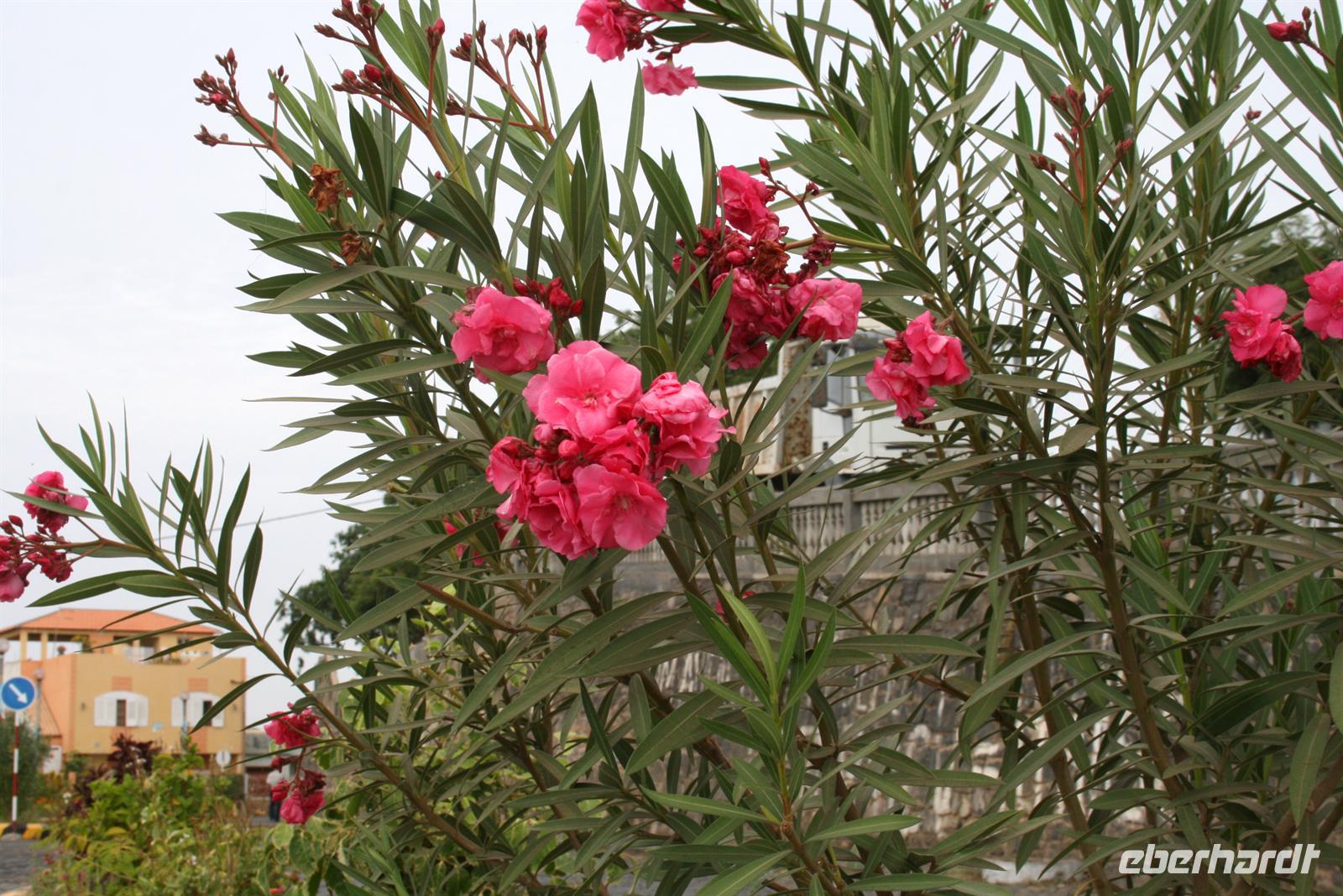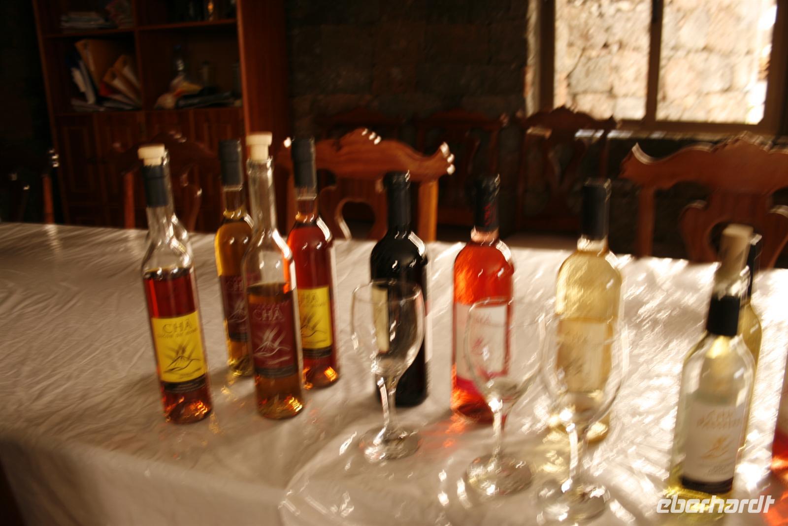 Wir besuchen das Weingeschäft eines kleinen Weinkellers. Der Weinkeller selbst hat heute natürlich geschlossen. Im Geschäft bekommen wir auf Nachfrage sogar eine kleine Kostprobe der Fogo-Weine und Liköre. Wir kosten nun auch den Roséwein „Rosé de Fogo“, einen Granatapfel- und einen Kräuter-Likör auf Grappa-Basis und einen süßen Dessertwein. Einige kaufen sich ein oder zwei Flaschen für Zuhause. Der Wein kostet 600 CVE, der Schnaps 900 CVE. Dann fahren wir noch ein Stück hinunter zum Dorf Baghueira. Hier gibt es keine größeren Sehenswürdigkeiten. Wir drehen also um und fahren Zurück durch die Caldeira und die Serpentinenstraße hinunter in Richtung Sao Filipe. Unterwegs erzählt Zelito noch einiges Wissenswertes zur Tier- und Pflanzenwelt. Gegen 16.30 Uhr sind wir zurück am Hotel „Xaguate“. Wir setzen uns an den Pool und trinken einen Tee oder unseren Fogo-Wein. Ein erfrischendes Bad im Pool darf natürlich auch nicht fehlen.