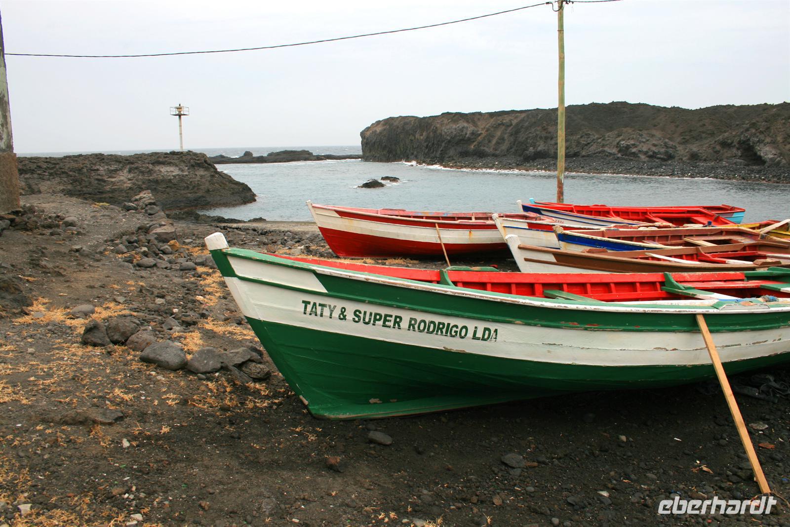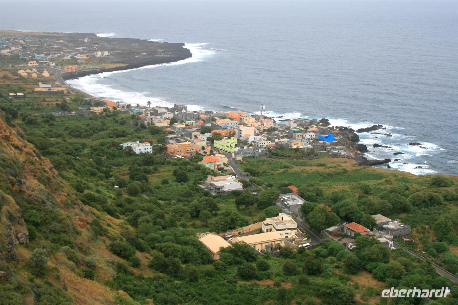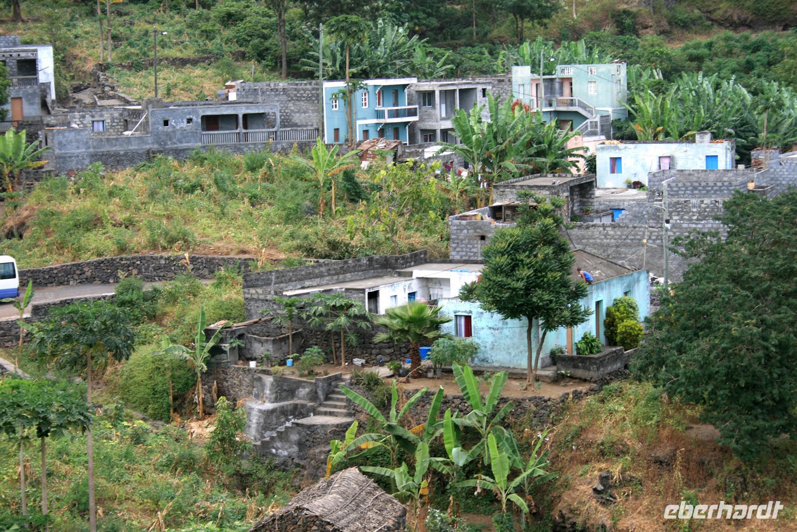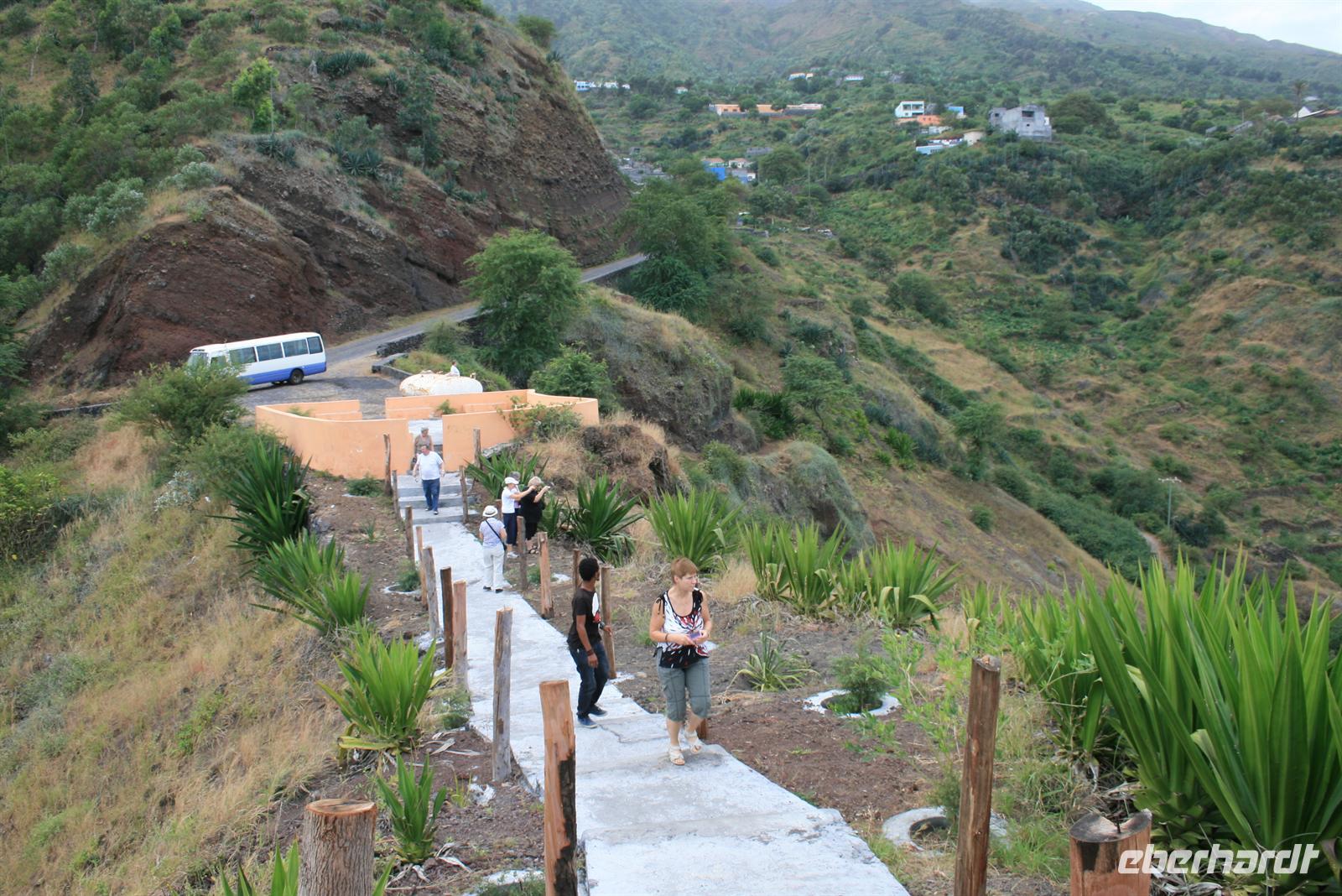 Das Regenwasser wird in der Regenzeit (Juli, August, September) in großen Auffangbecken gesammelt und das ganze Jahr zur Bewässerung genutzt. Angebaut werden Mais, Kohl, Süßkartoffeln, Maniok, Bananen, Papaya, Guaven, Mango, Bohnen, Feigen. Es kommen sofort zahlreiche Kinder an den Bus und wollen teilweise kleine gebastelte Lavahäuser als Souvenir verkaufen (200-500 CVE). Wir kaufen Ihnen auch zum Teil etwas ab. Zelito erklärt die verschiedenen Obstsorten und die Pflanzen, die hier wachsen. Er zeigt uns auch den Graukopfliest, einen Verwandten des Eisvogels, der hier auch als Eisvogel bezeichnet wird.