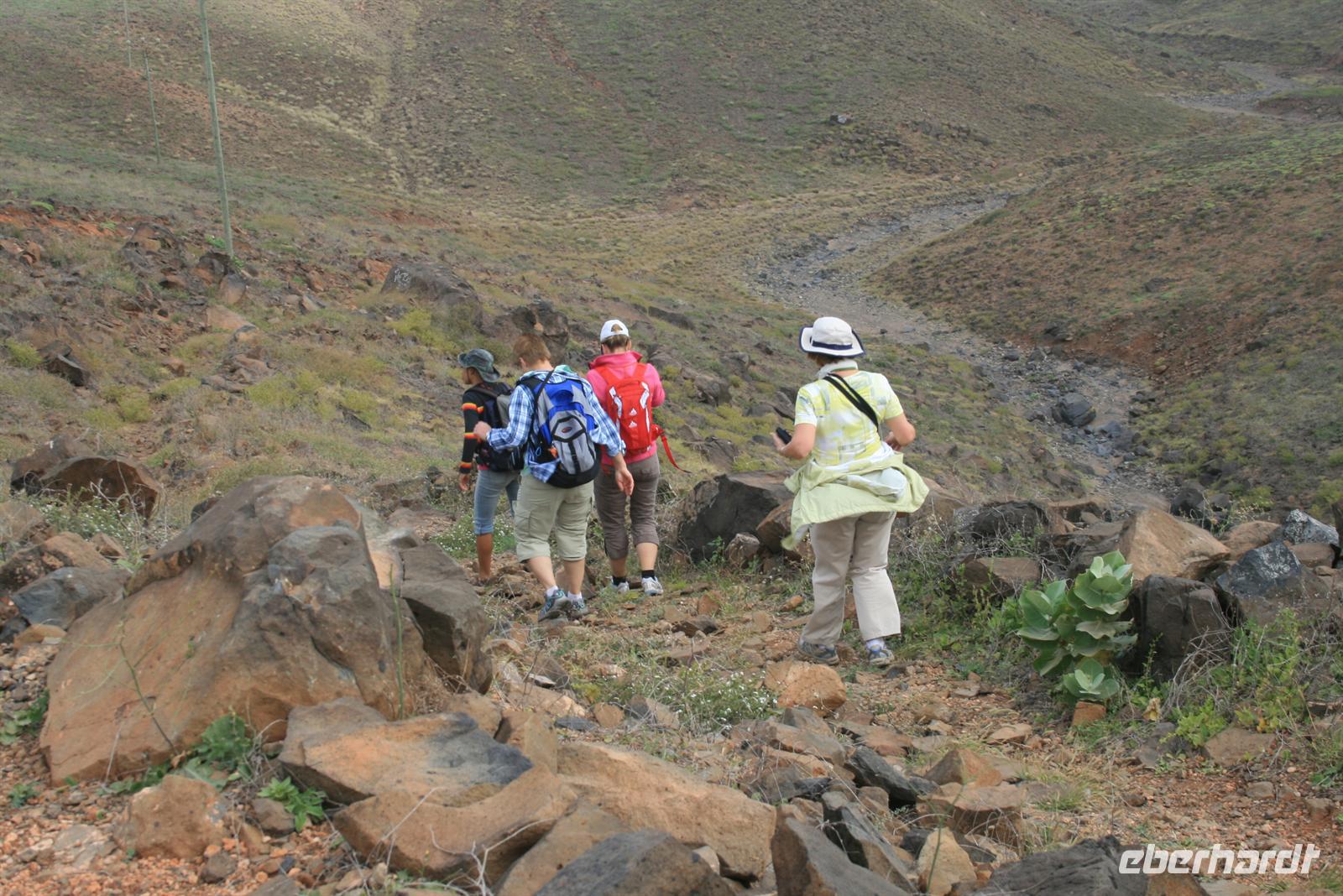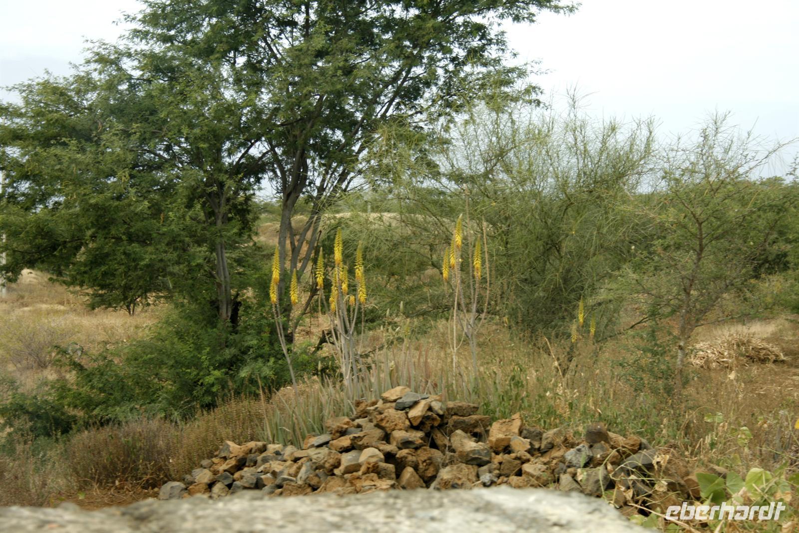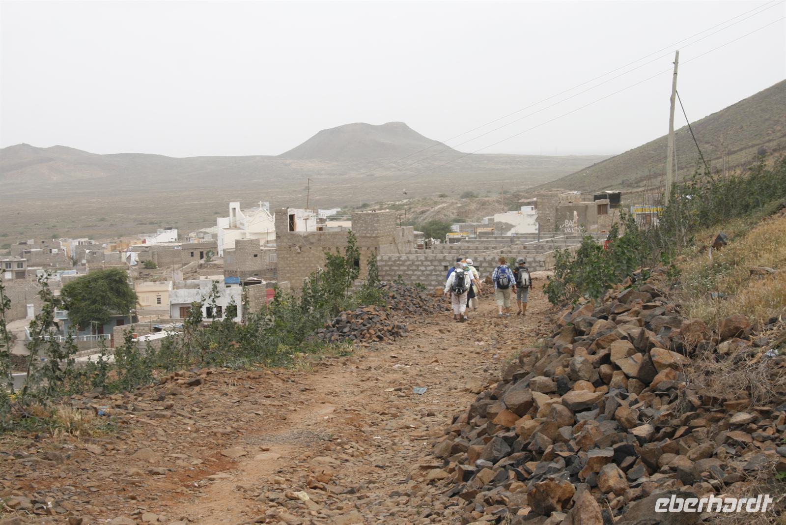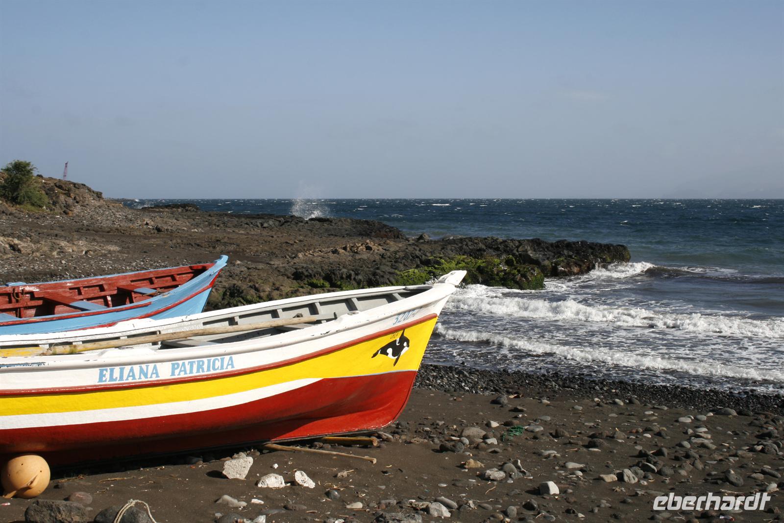 Das Regenwasser wird in der Regenzeit (Juli, August, September) in großen Auffangbecken gesammelt und das ganze Jahr zur Bewässerung genutzt. Angebaut werden Mais, Kohl, Süßkartoffeln, Maniok, Bananen, Papaya, Guaven, Mango, Bohnen, Feigen. Es kommen sofort zahlreiche Kinder an den Bus und wollen teilweise kleine gebastelte Lavahäuser als Souvenir verkaufen (200-500 CVE). Wir kaufen Ihnen auch zum Teil etwas ab. Zelito erklärt die verschiedenen Obstsorten und die Pflanzen, die hier wachsen. Er zeigt uns auch den Graukopfliest, einen Verwandten des Eisvogels, der hier auch als Eisvogel bezeichnet wird.