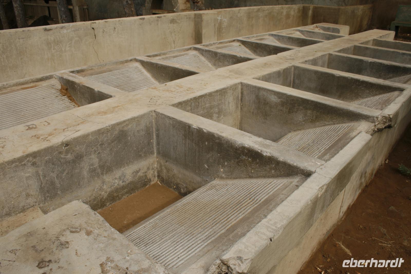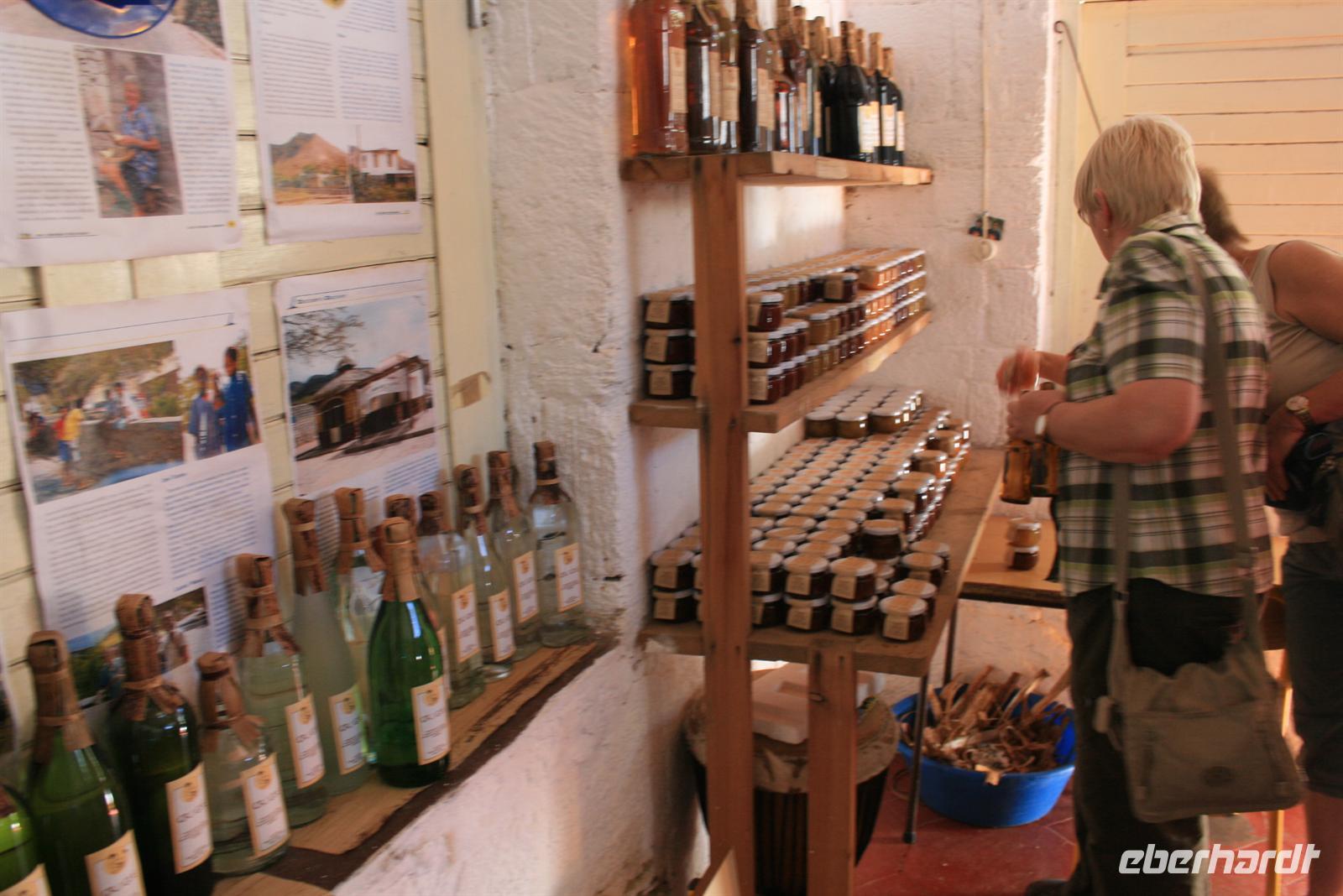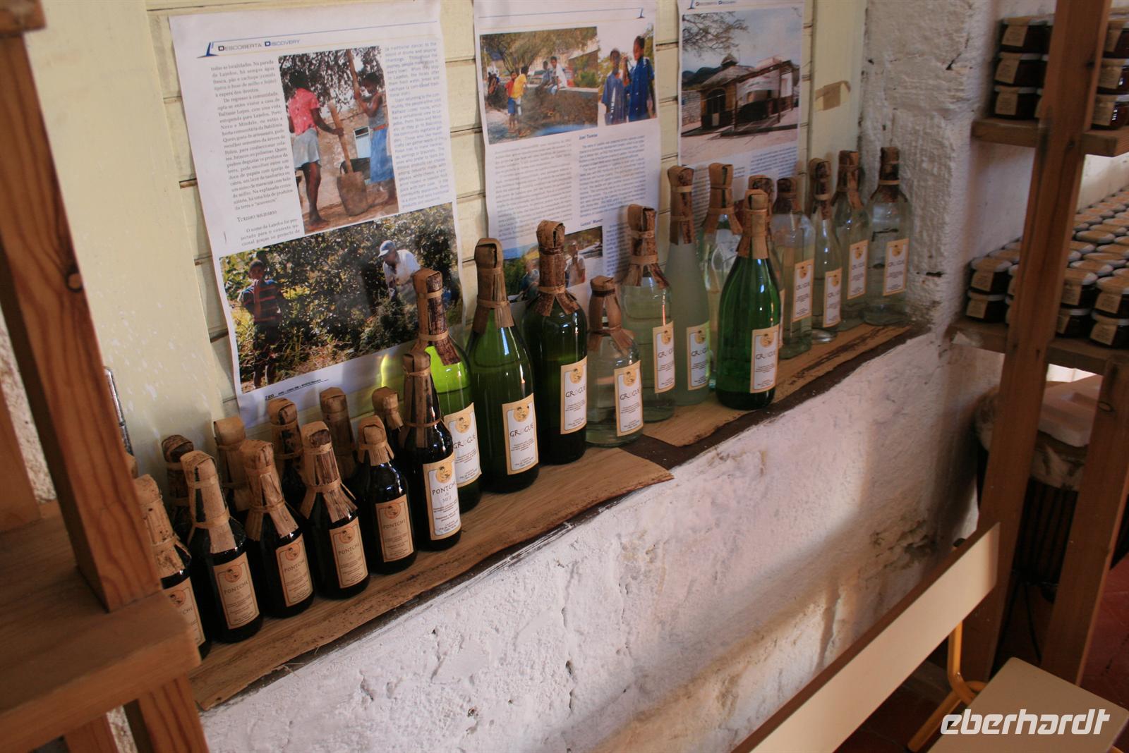 Dann geht es zurück nach Lagedos. Wir besuchen eine sogenannte Kooperative. Hier haben sich etwa 800 Bauern zusammengeschlossen und vertreiben ihre Waren gemeinsam. Es gibt einen kleinen Laden, in dem wir regionale Produkte kaufen: Grogue (Zuckerrohrschnaps), Ponche (Grogue mit Zuckerrohrsaft, ab 160 CVE), verschiedene Liköre, Marmeladen und Tees. Max zeigt uns auch die kleine Grundschule, die ebenfalls zur Kooperative gehört. Es sind allerdings gerade Ferien. Außerdem sehen wir eine kleine Werkstatt, in der Pflastersteine aus Beton gefertigt und in Holzöfen gebrannt werden. Diese werden auch auf andere Inseln der Kapverden exportiert.