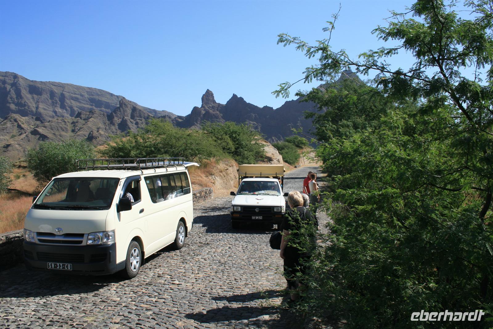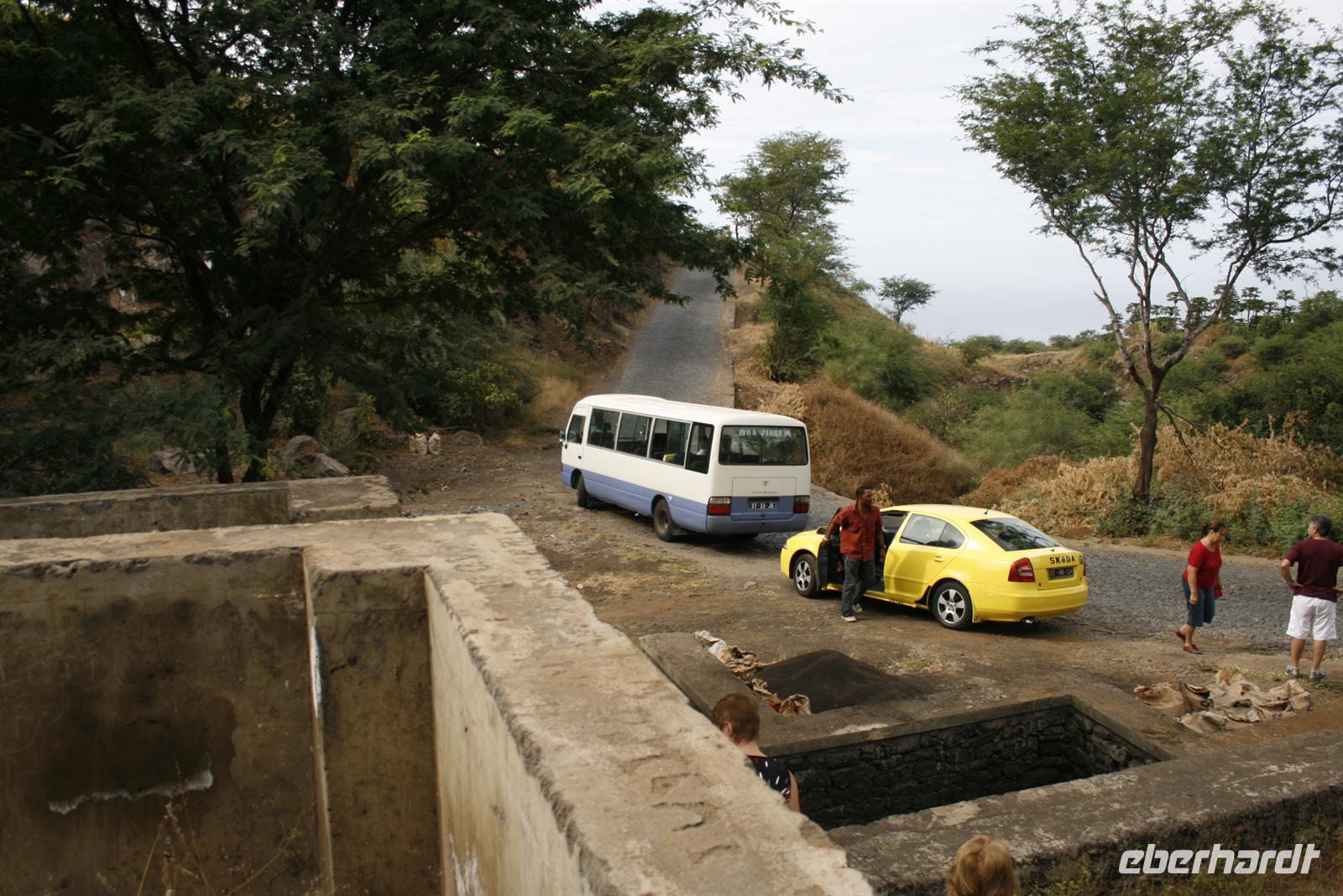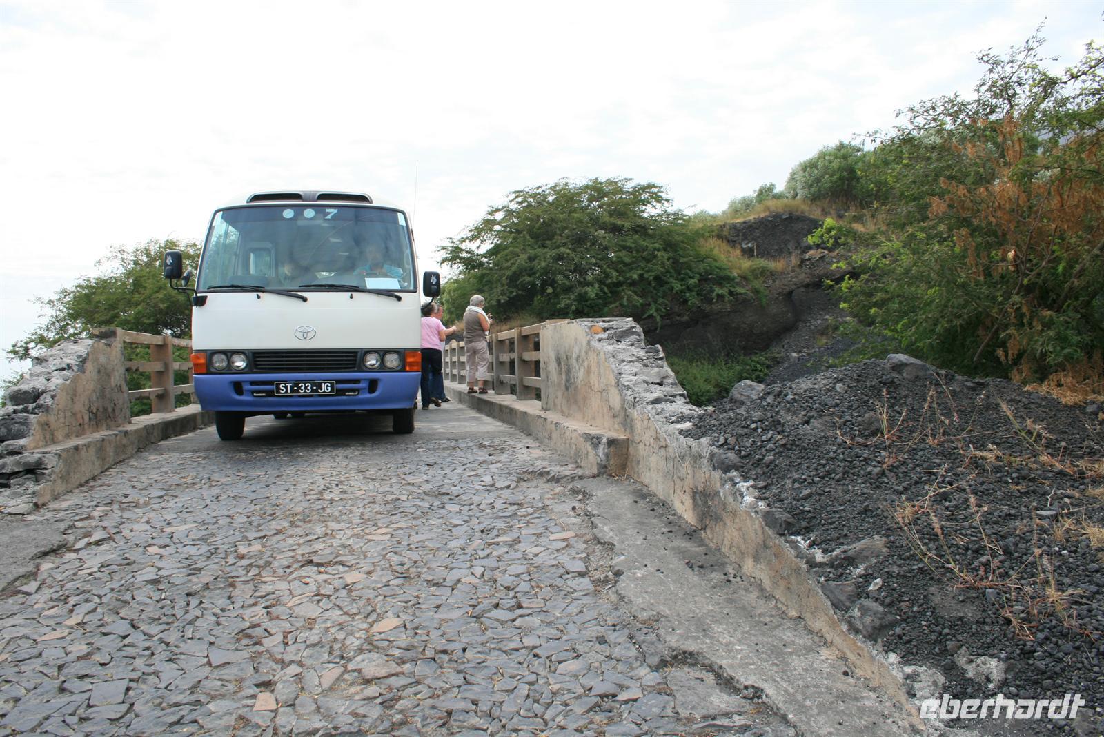 8.30 Uhr treffen wir uns zum Frühstück im Hotelrestaurant und 10.00 Uhr mit unserem örtlichen Guide Zelito (Englisch) und Fahrer Arlindo (Portugiesisch) zur Abfahrt im örtlichen Kleinbus (ca. 20 Sitze, ohne Toilette, Fenster zum Öffnen, sehr einfaches Fahrzeug, nicht besonders modern)zu unserem Ausflug in den Vulkankrater Cha das Caldeiras. Die Fahrt führt über einfache Pflasterstraßen aus der Kolonialzeit, die damals von Sklaven erbaut wurden. Ein Teil ist sogar asphaltierte Straße, die vor wenigen Jahren mit Kooperation der Italiener gebaut wurde.