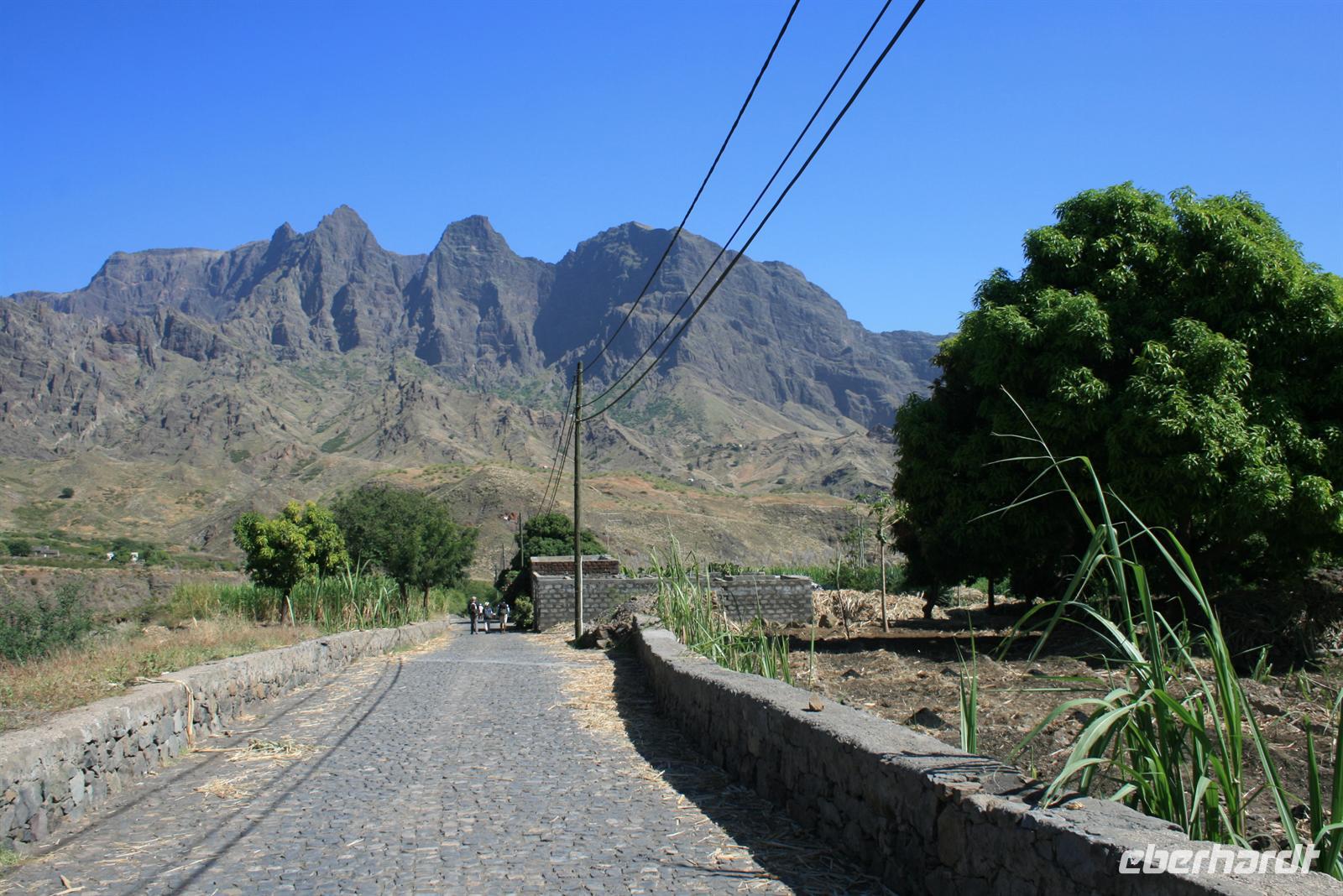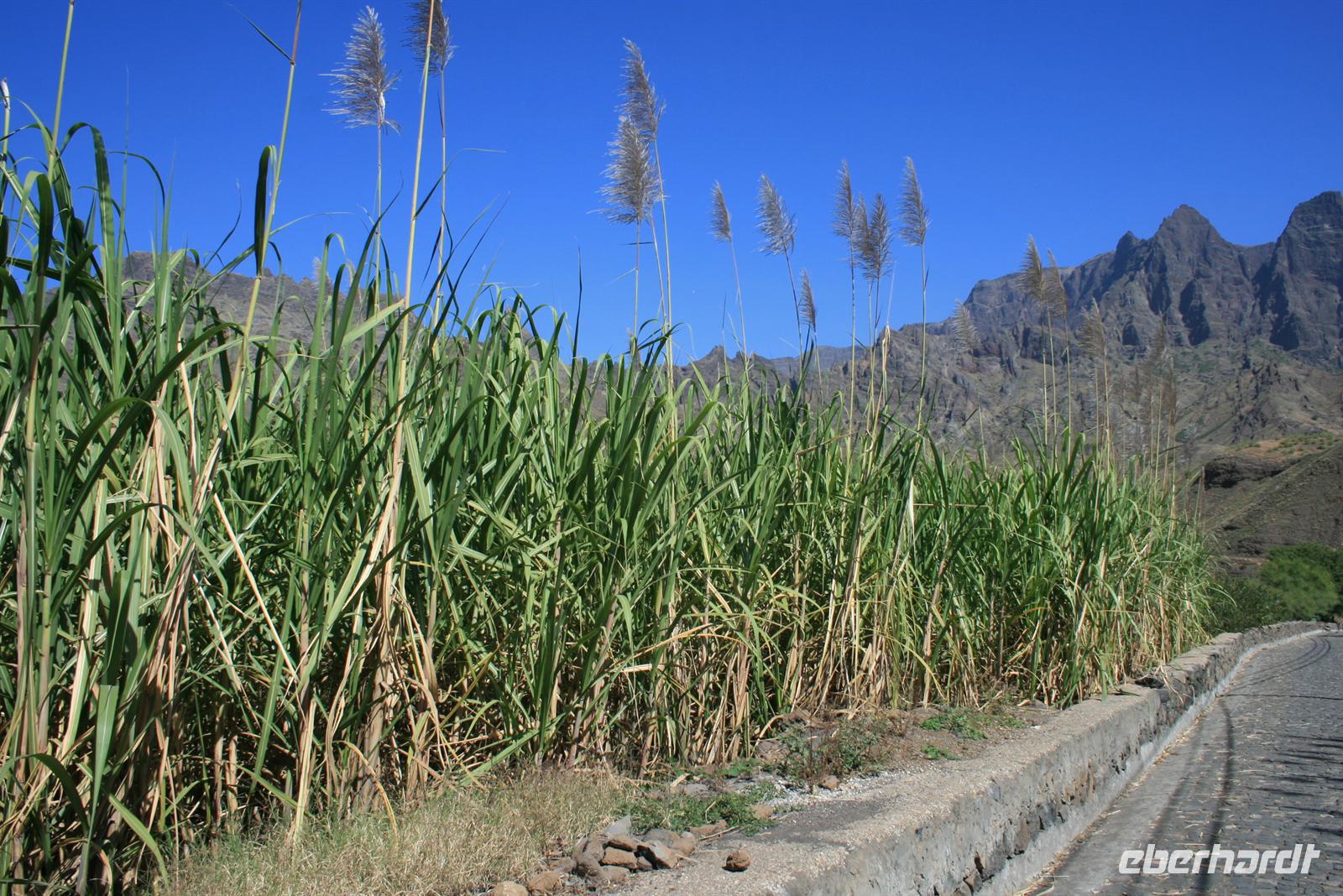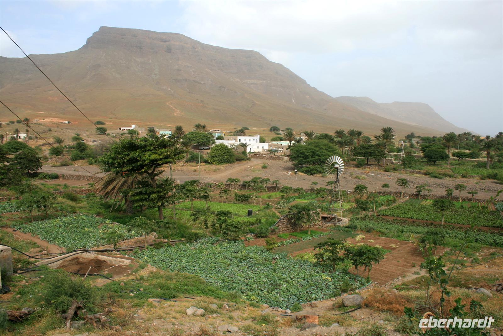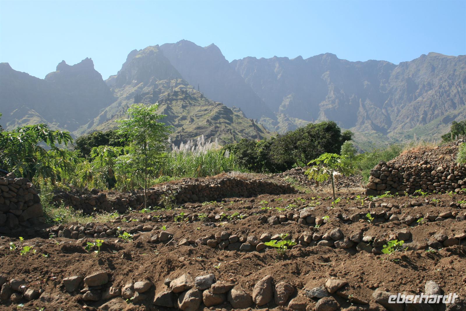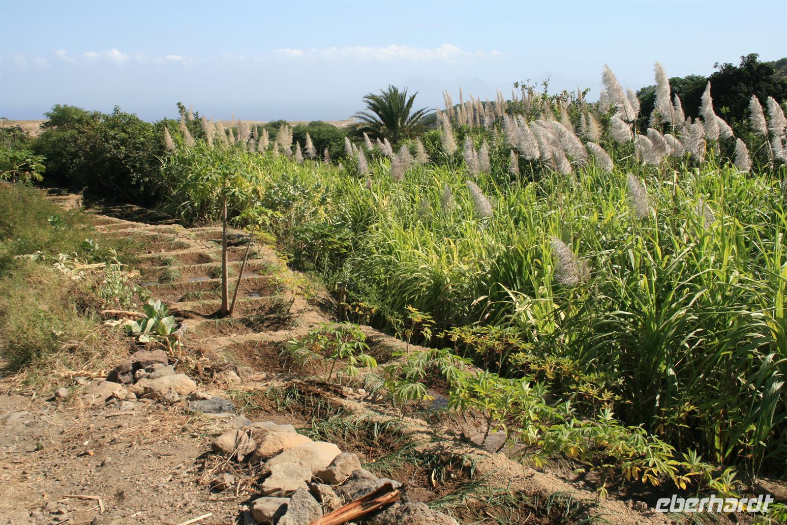 Die Landschaft ist sehr karg und trocken. Die Asphaltstraße wandelt sich in eine Pflasterstraße, wie wir sie schon von Fogo kennen. Unterwegs machen wir ein paar Fotostopps und sehen die etwa 1400 Meter hohen Berge, tief eingeschnittene steile Täler und einige Landwirtschaftsflächen. Durch Lagedos fahren wir weiter in den Norden nach Cha do Morto, einem kleinen Bergdorf. Hier unternehmen wir einen kleinen Spaziergang (ca. 20 Minuten) entlang der Zuckerrohr-, Gemüse- und Obstfelder. Die privaten Bauernfamilien haben hier ein karges Leben und scheinen nur vom eigenen Anbau zu leben. Es ist ziemlich heiß heute, um die 30 °C, weil hier im Süden von Santo Antao die Sonne fat immer scheint und es sehr trocken ist. Die Felder werden mit Quellwasser bewässert, das mit Pumpen herauf befördert wird.