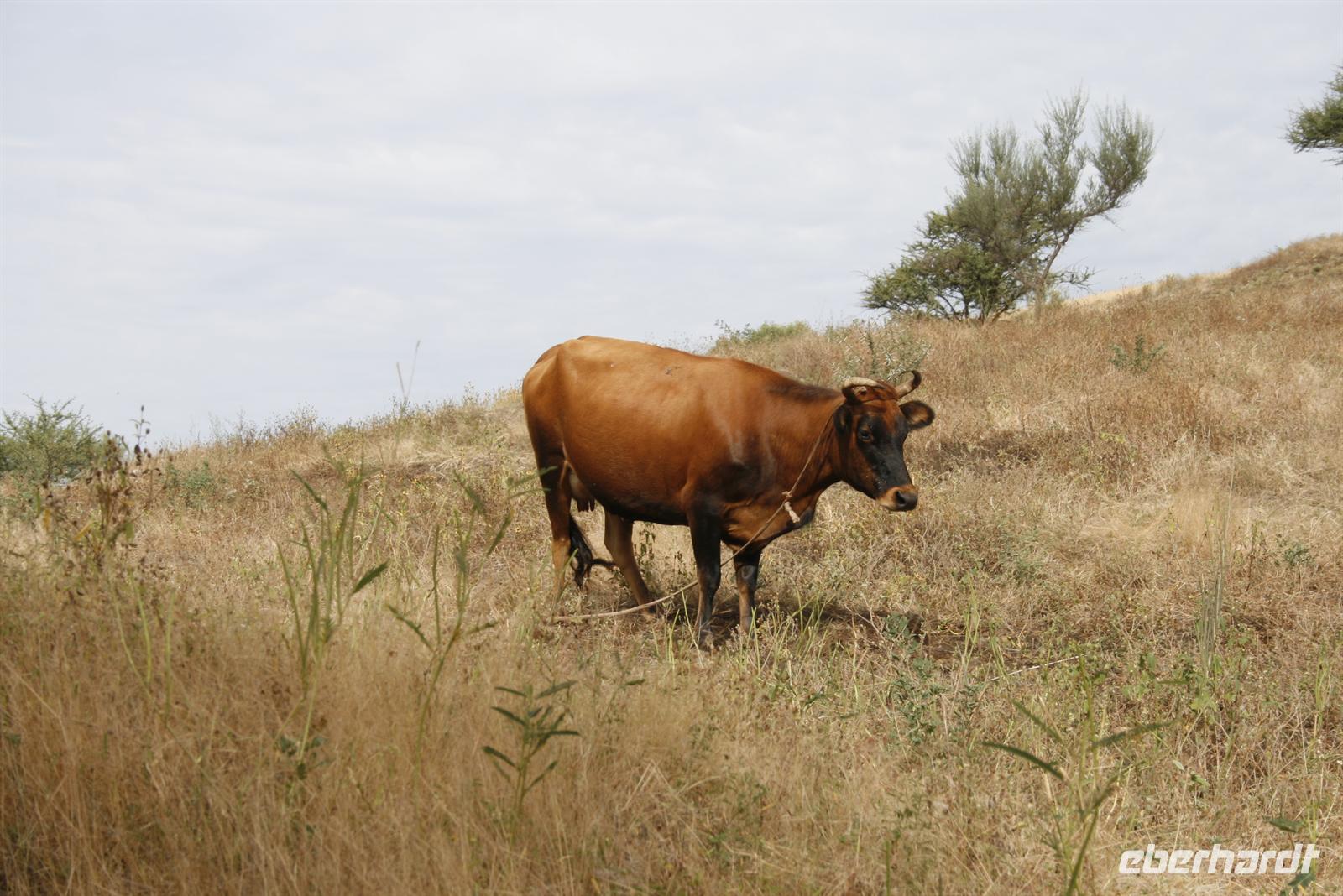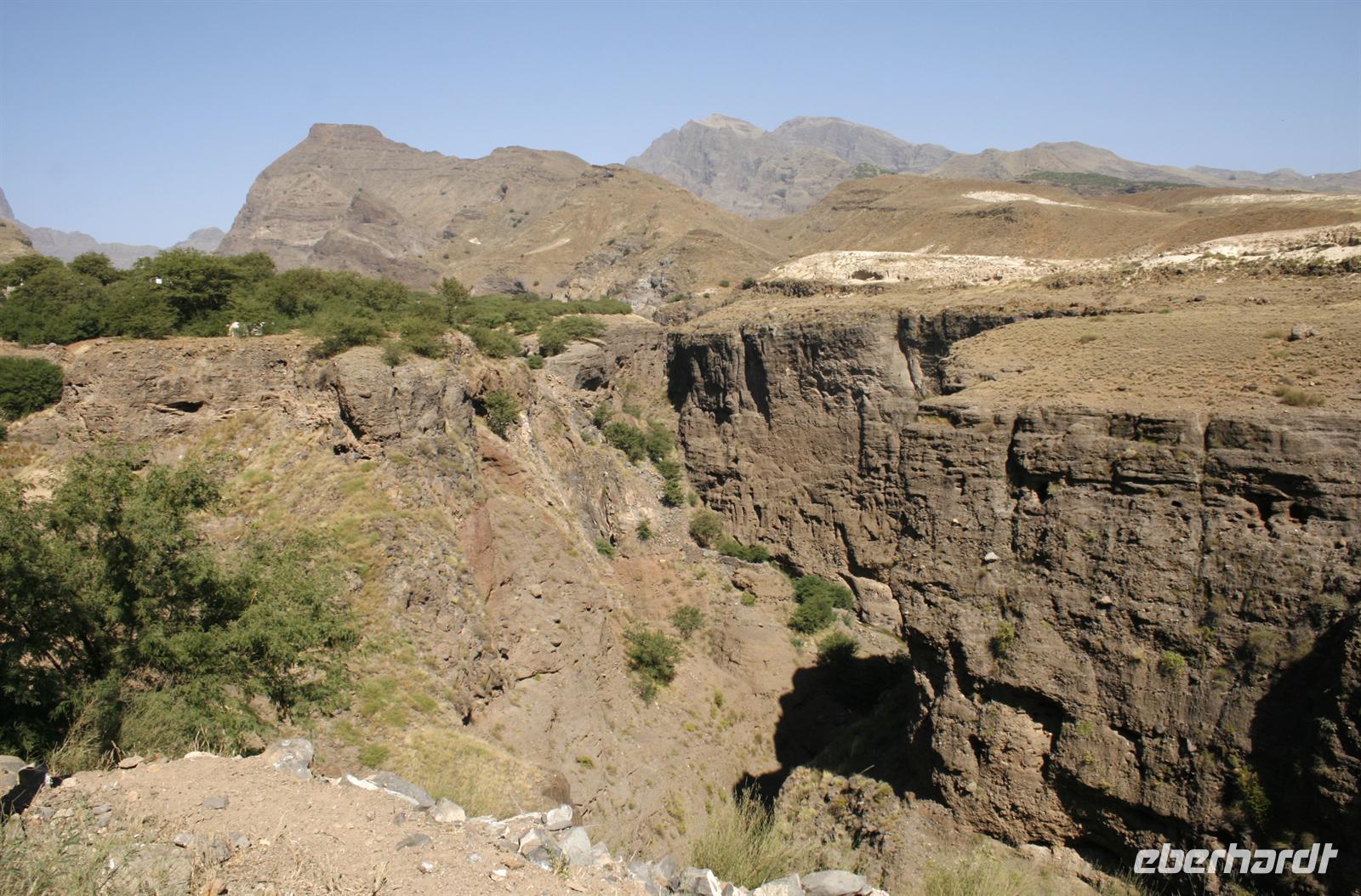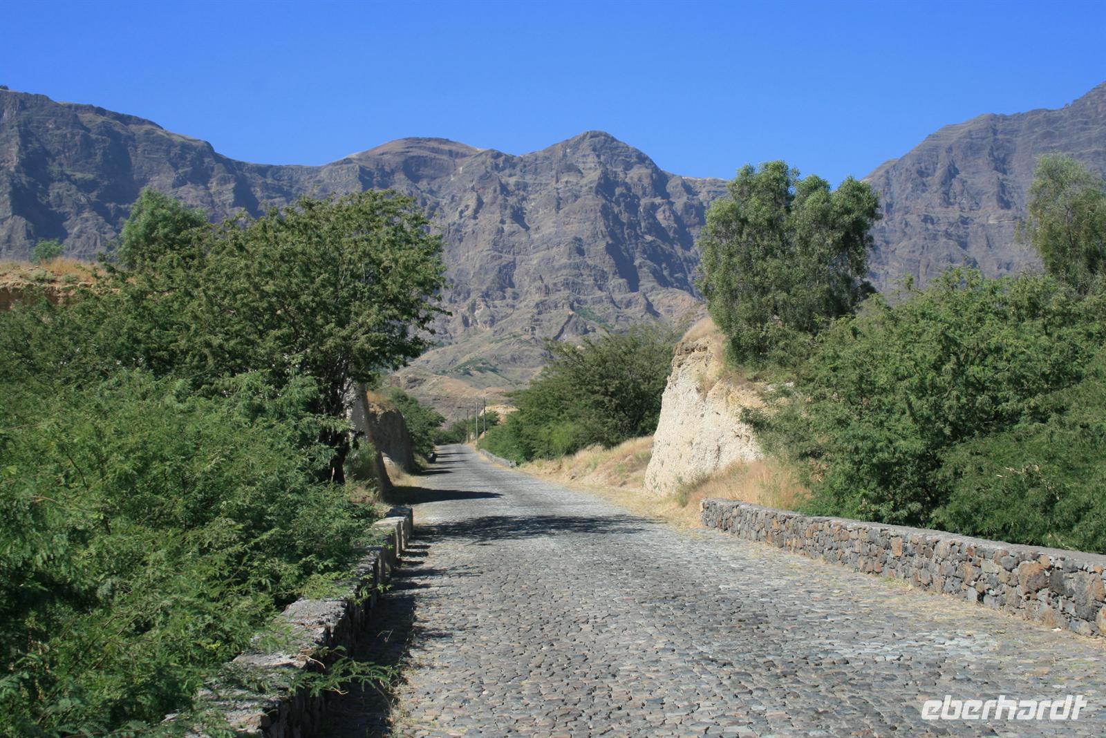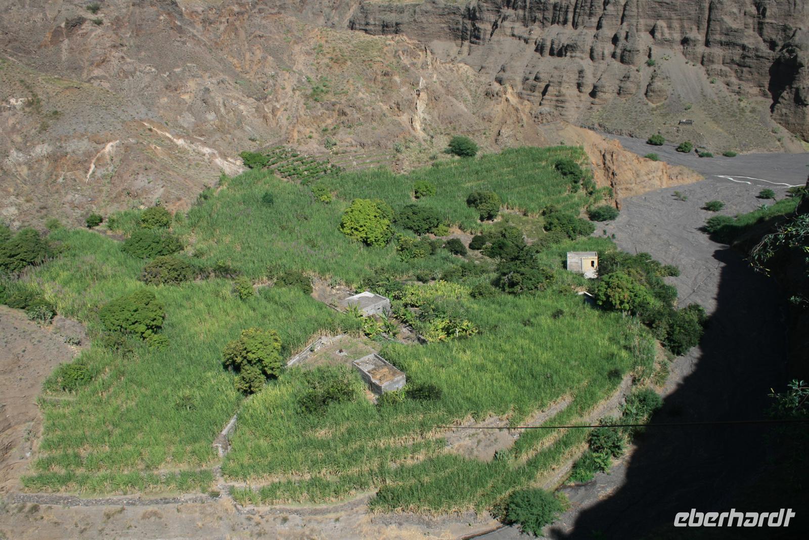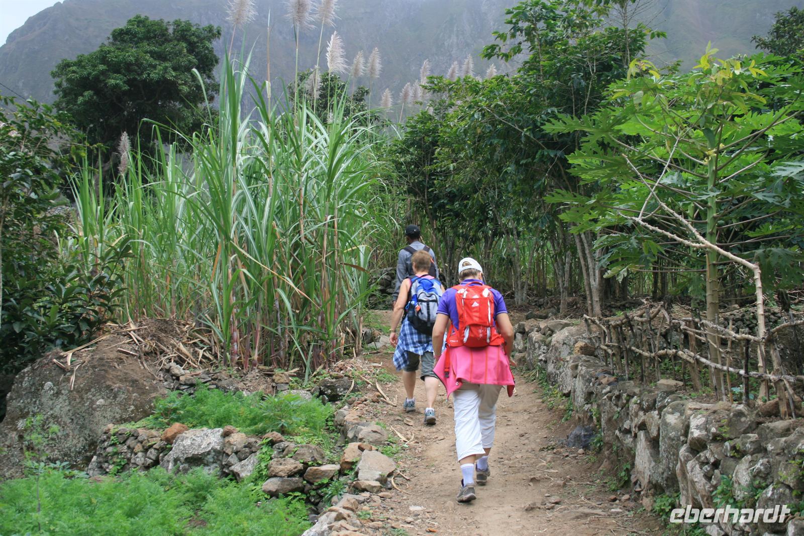Die Landschaft ist sehr karg und trocken. Die Asphaltstraße wandelt sich in eine Pflasterstraße, wie wir sie schon von Fogo kennen. Unterwegs machen wir ein paar Fotostopps und sehen die etwa 1400 Meter hohen Berge, tief eingeschnittene steile Täler und einige Landwirtschaftsflächen. Durch Lagedos fahren wir weiter in den Norden nach Cha do Morto, einem kleinen Bergdorf. Hier unternehmen wir einen kleinen Spaziergang (ca. 20 Minuten) entlang der Zuckerrohr-, Gemüse- und Obstfelder. Die privaten Bauernfamilien haben hier ein karges Leben und scheinen nur vom eigenen Anbau zu leben. Es ist ziemlich heiß heute, um die 30 °C, weil hier im Süden von Santo Antao die Sonne fat immer scheint und es sehr trocken ist. Die Felder werden mit Quellwasser bewässert, das mit Pumpen herauf befördert wird.