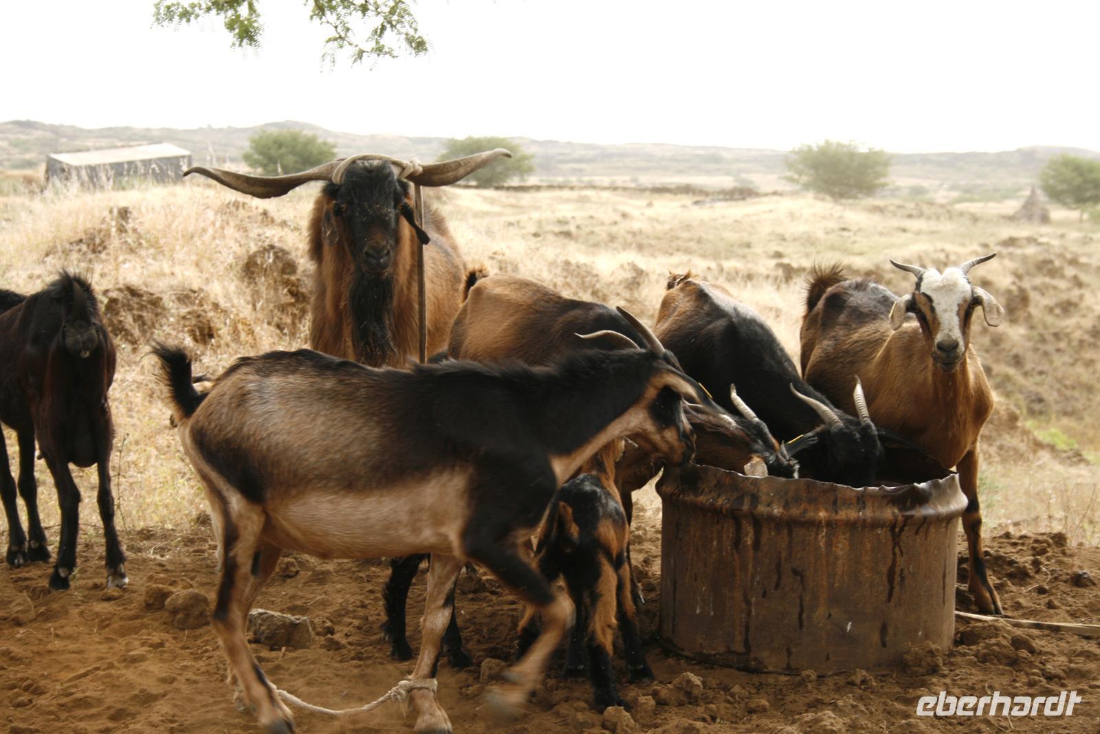 Nach dem Fühstück im Hotelrestaurant und einem Geburtstagskuchen treffen wir uns um 9.30 Uhr wieder mit Reiseleiter Zelito und Busfahrer Arlindo und fahren los zur Inselrundfahrt auf Fogo. Wir umrunden die ganze Insel heute entgegen dem Uhrzeigersinn. Zunächst geht es die gleiche Straße entlang wie am Vortag. Unterwegs halten wir bei einer Bauernfamilie, die gerade ein Schwein geschlachtet hat und an einem Waschplatz, wo die Frauen des Dorfes manchmal ihre Wäsche waschen. Hier ist ein großes Wasserbecken mit Waschbrettern aus Beton gegossen. Daneben befindet sich der Regenwasser-Speicher des Dorfes. Unterwegs fotografieren wir auch örtliche Bauern, Kühe, Esel und Ziegen. Hier sieht man wirklich noch das ursprüngliche Leben! Die Kinder kommen immer zum Bus. Allgemein lassen sich die Menschen gern fotografieren, wenn man ihnen mit einem Lächeln begegnet.