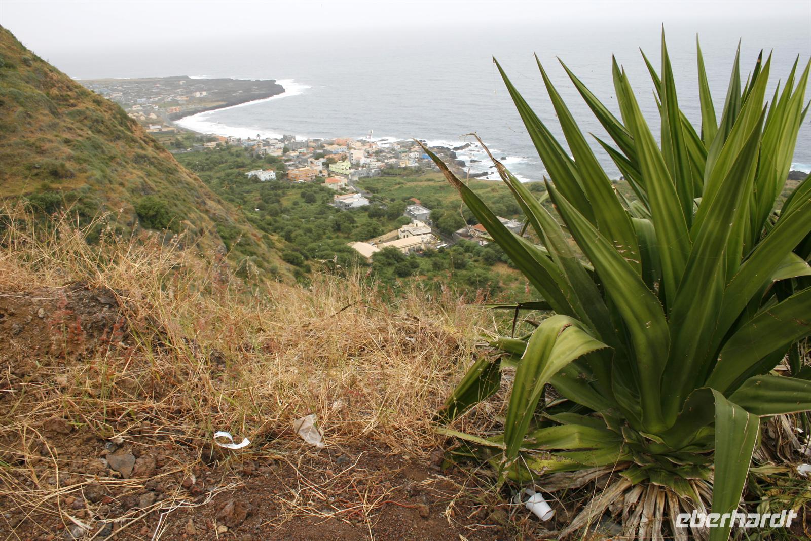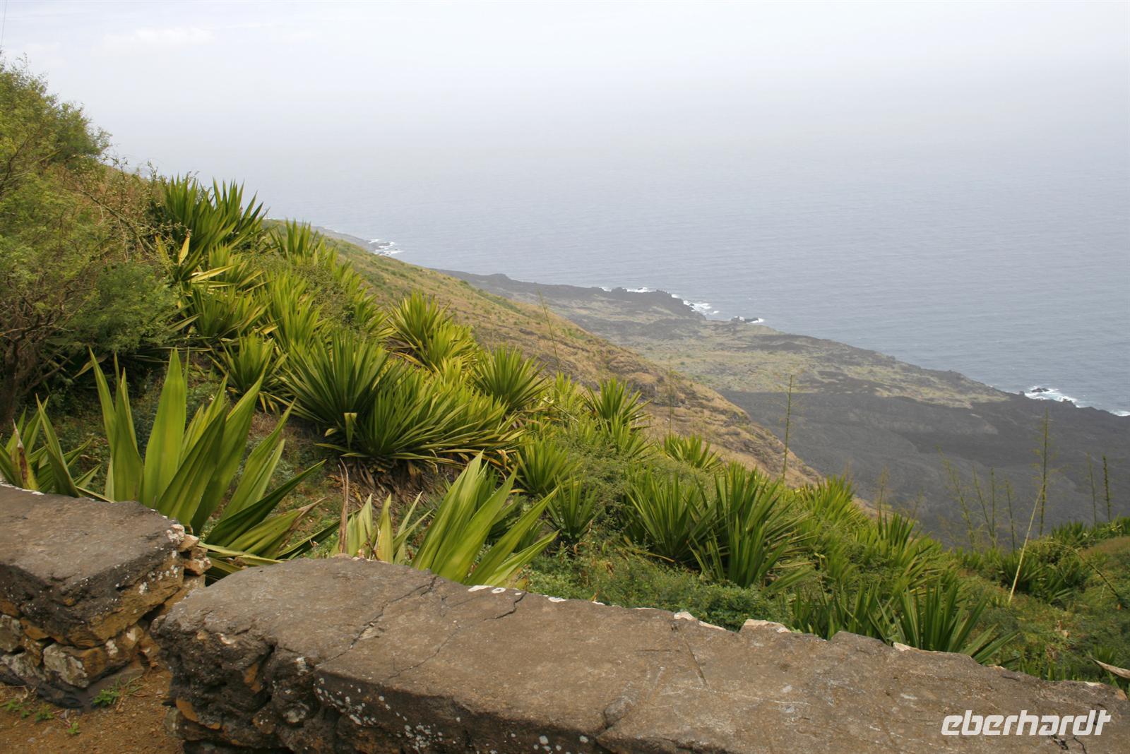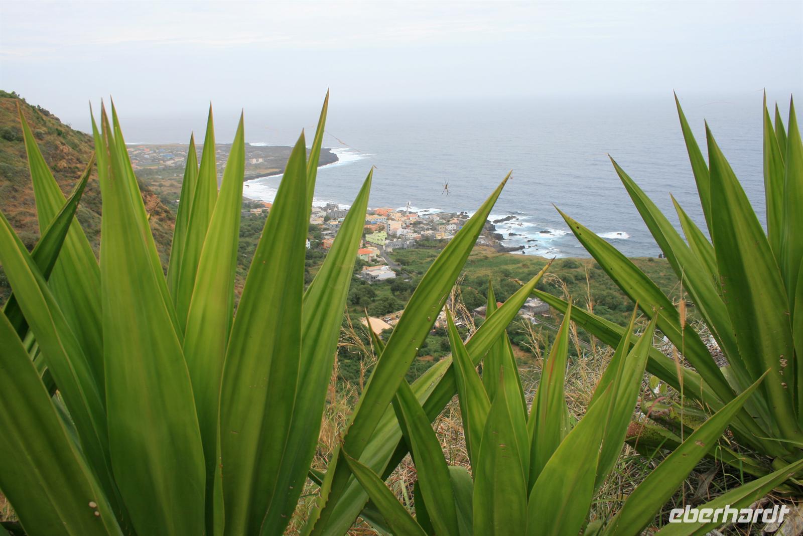 Hier ist durch den sogenannten Nebelwald mehr Feuchtigkeit vorhanden und an den Berghängen wachsen üppige Obstbäume. Die großen Kaffeeplantagen befinden sich allerdings weiter oben in den Bergen. Dort kommt man zum Beispiel durch, wenn man vom Pico ca. 4 Stunden hinunter wandert nach Mosteiros, wo wir uns gerade befinden. Wir fahren wieder bergab und halten an einem Aussichtspunkt, wo wir Mosteiros und die schwarze Lava-Küste gut überblicken. Wir sehen den Stadtkern von Mosteiros, den Fußballplatz und die kleine Landebahn des ehemaligen Flughafens.
