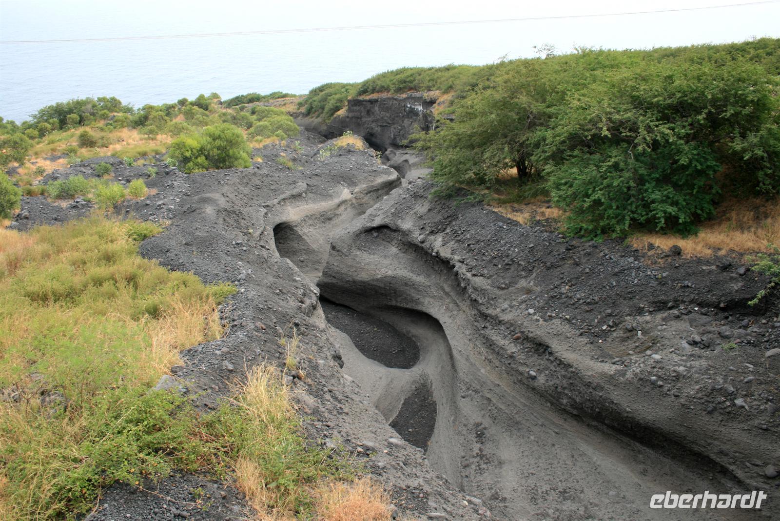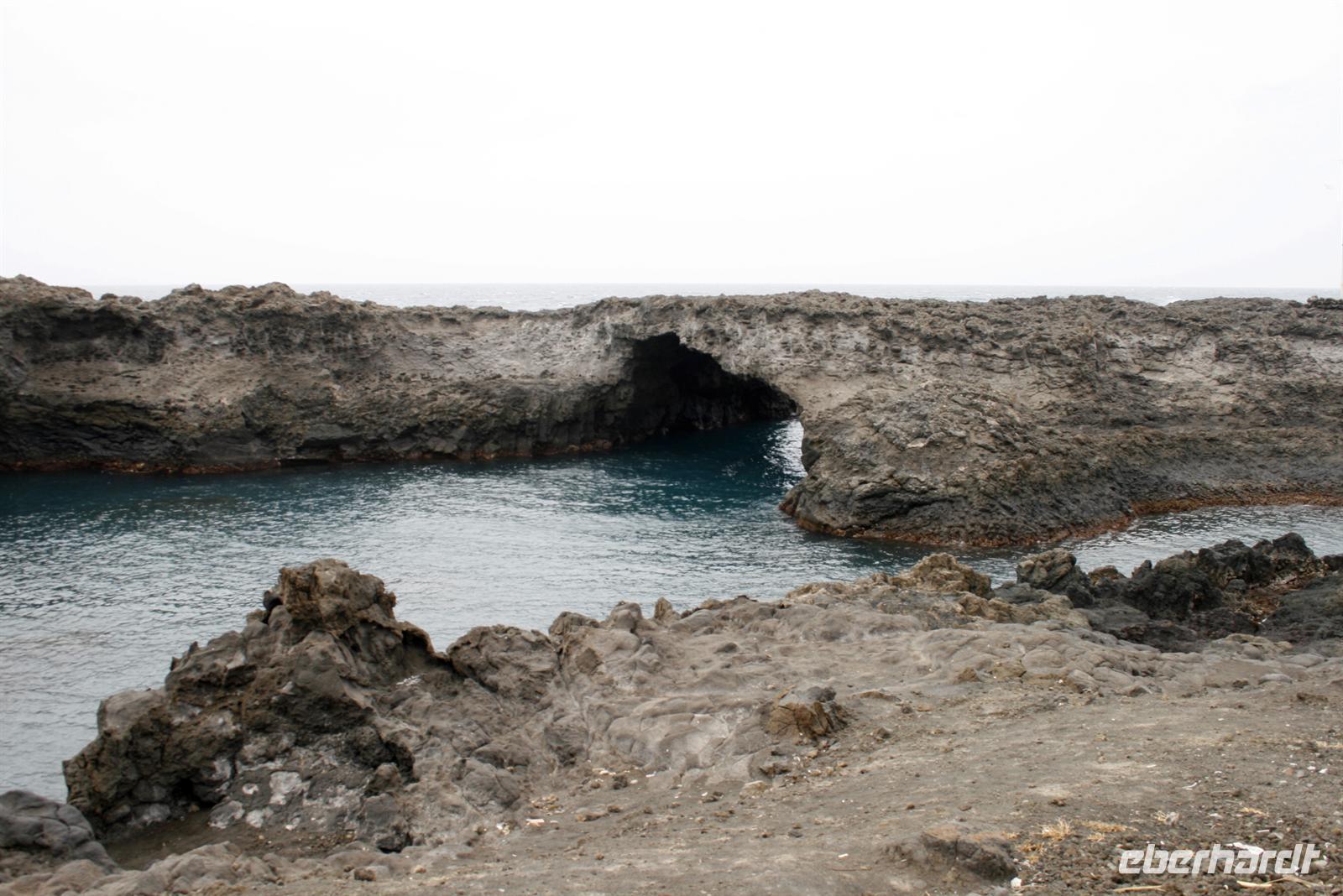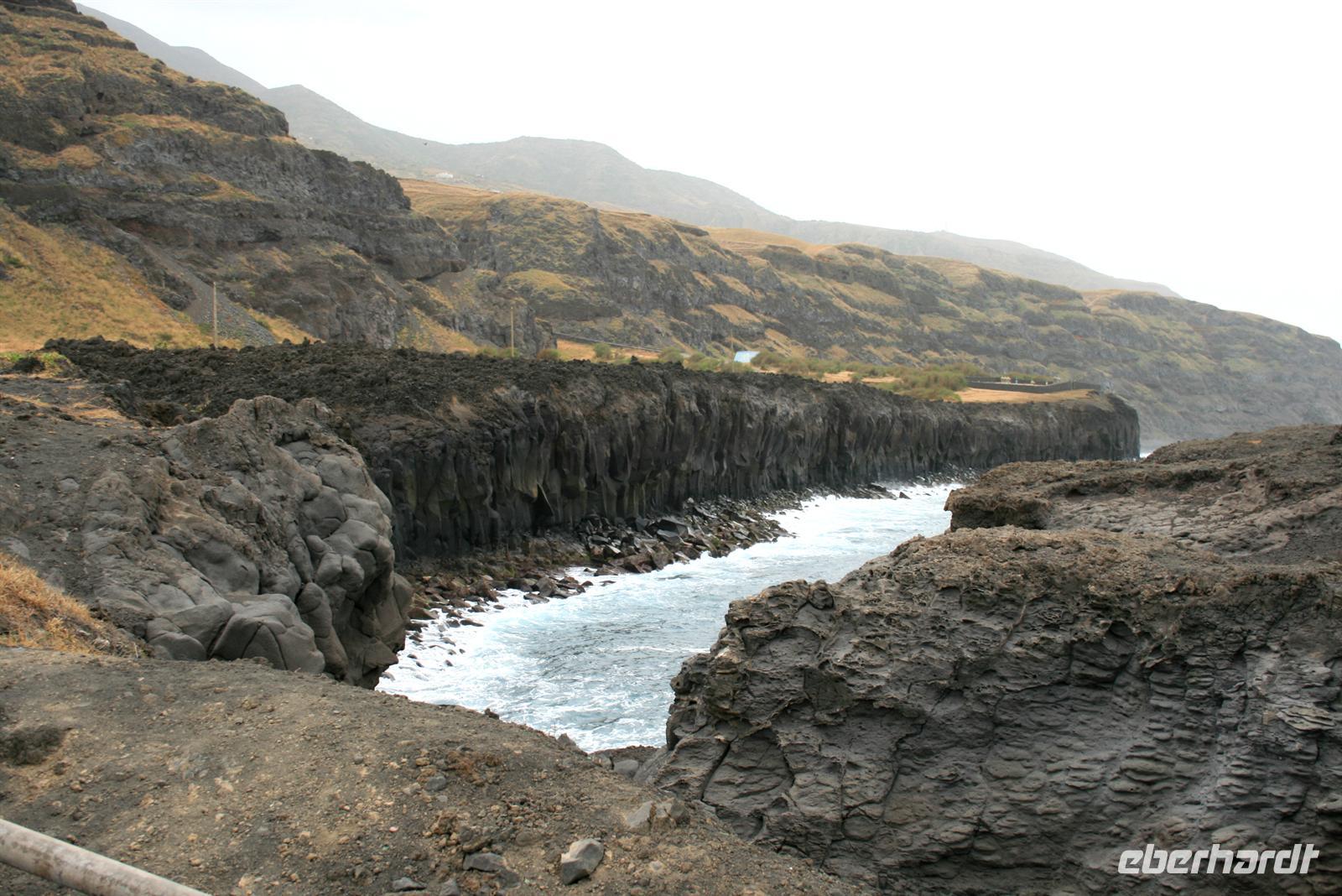 Gegen 14.30 Uhr fahren wir wieder los in Richtung West-Fogo. Um 15.15 Uhr erreichen wir die Salinas de Sao Jorge, den einzigen kleinen Badestrand von Fogo. Hier ist eine kleine Bucht vom offenen Meer abgeteilt. Hier gab es vor vielen Jahren einen Vulkanausbruch oberhalb der Küste. Der Berg wird Black Mountain genannt und sein Lavastrom floss bis hinunter ans Meer und bildete die Bucht und die bizzaren Küstenfelsen. In den Höhlen und Felsenlöchern hört man die Brandung rauschen. Das Wetter ist gerade nicht so schön, weil ohne Sonnenschein. Dennoch gehe ich mit den Füßen ins Wasser und zwei nehmen sogar ein richtiges Bad im Atlantik. Der Strand ist natürlich schwarz, weil Lavasand, und es ist ein wenig steinig. Man sollte vielleicht Badeschuhe mitnehmen. Auch ein paar Seeigel gibt es hier.