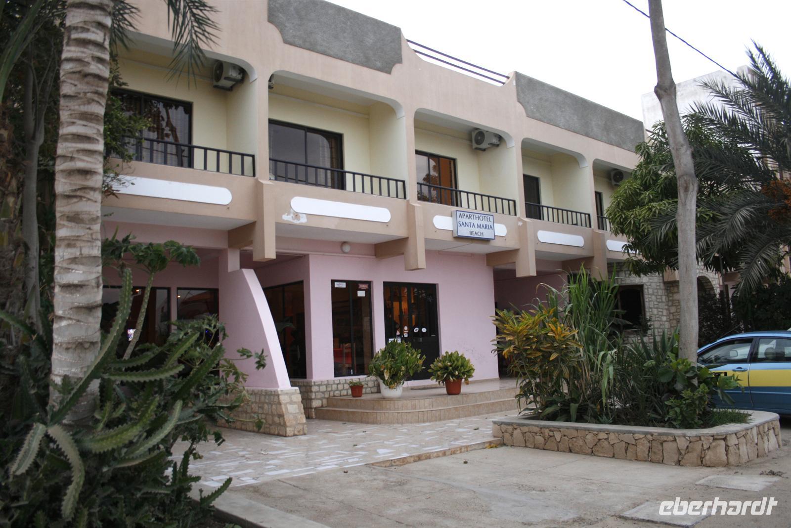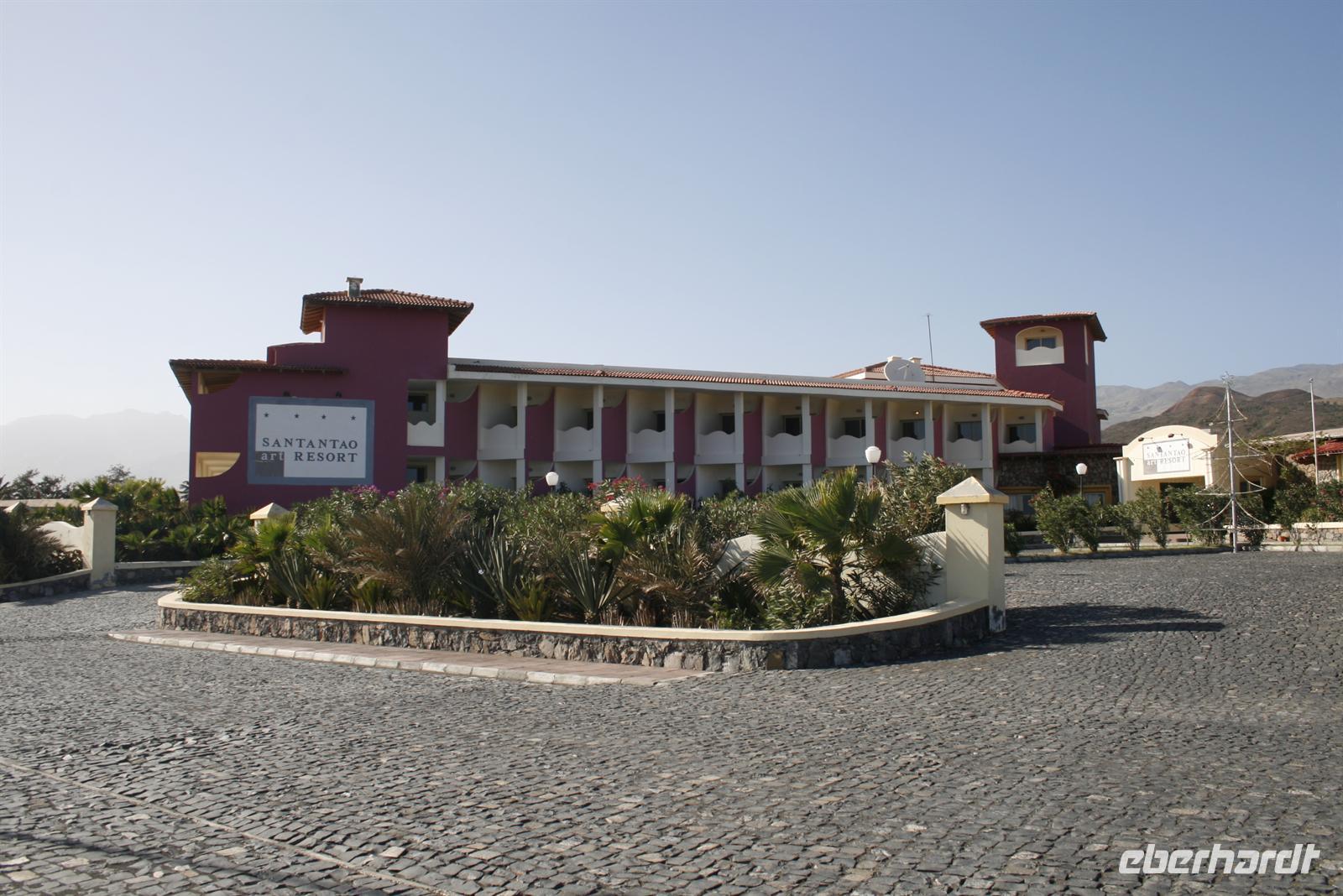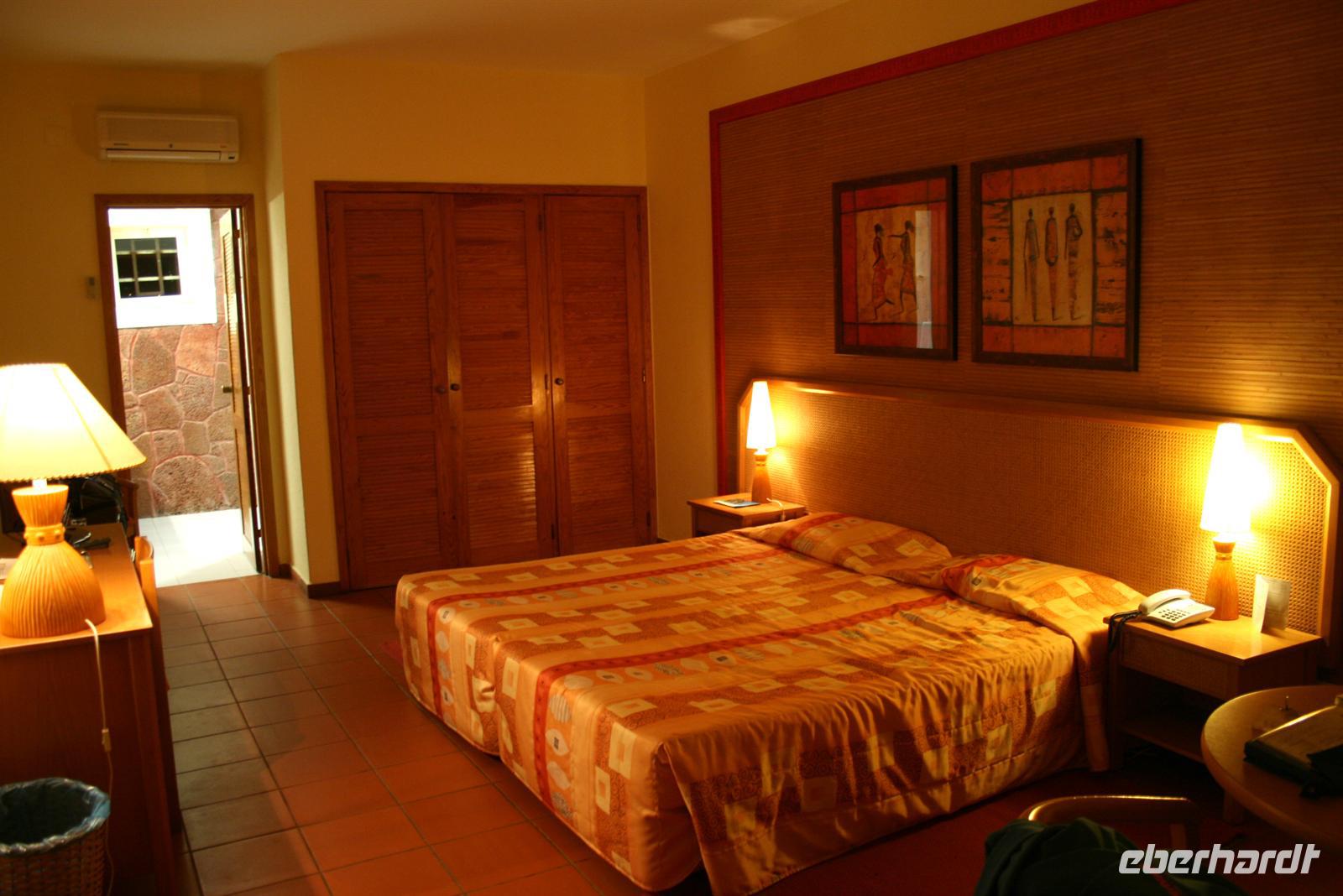 Das Gepäck wird von Max und dem Fahrer auf das Dach des Kleinbusses geladen. Dann zwängen wir uns hinein (es sind gerade 10 Sitze) und fahren zum Hotel Santantao Art Resort. Die Zimmer sind schon bereit und wir können einchecken. Wir müssen die Pässe abgeben und bekommen Zimmerschlüssel und Fernbedienungen für TV und Klimaanlage. Der Fahrstuhl ist defekt. Also lassen wir die Koffer vom Personal herauf tragen.