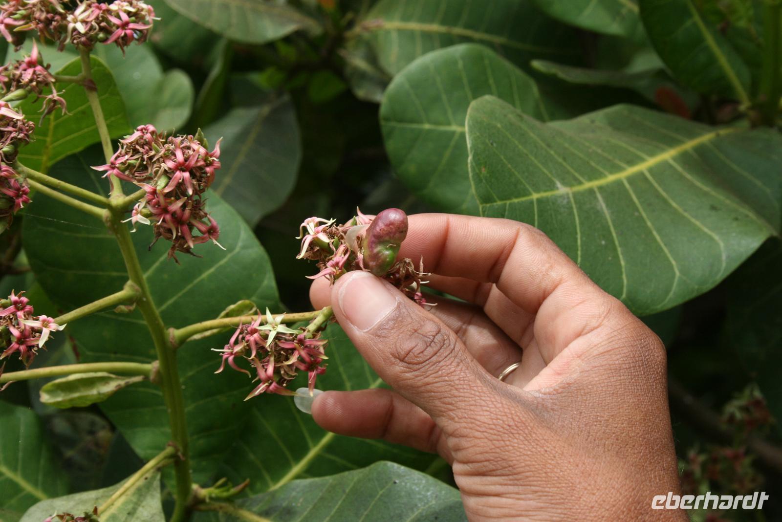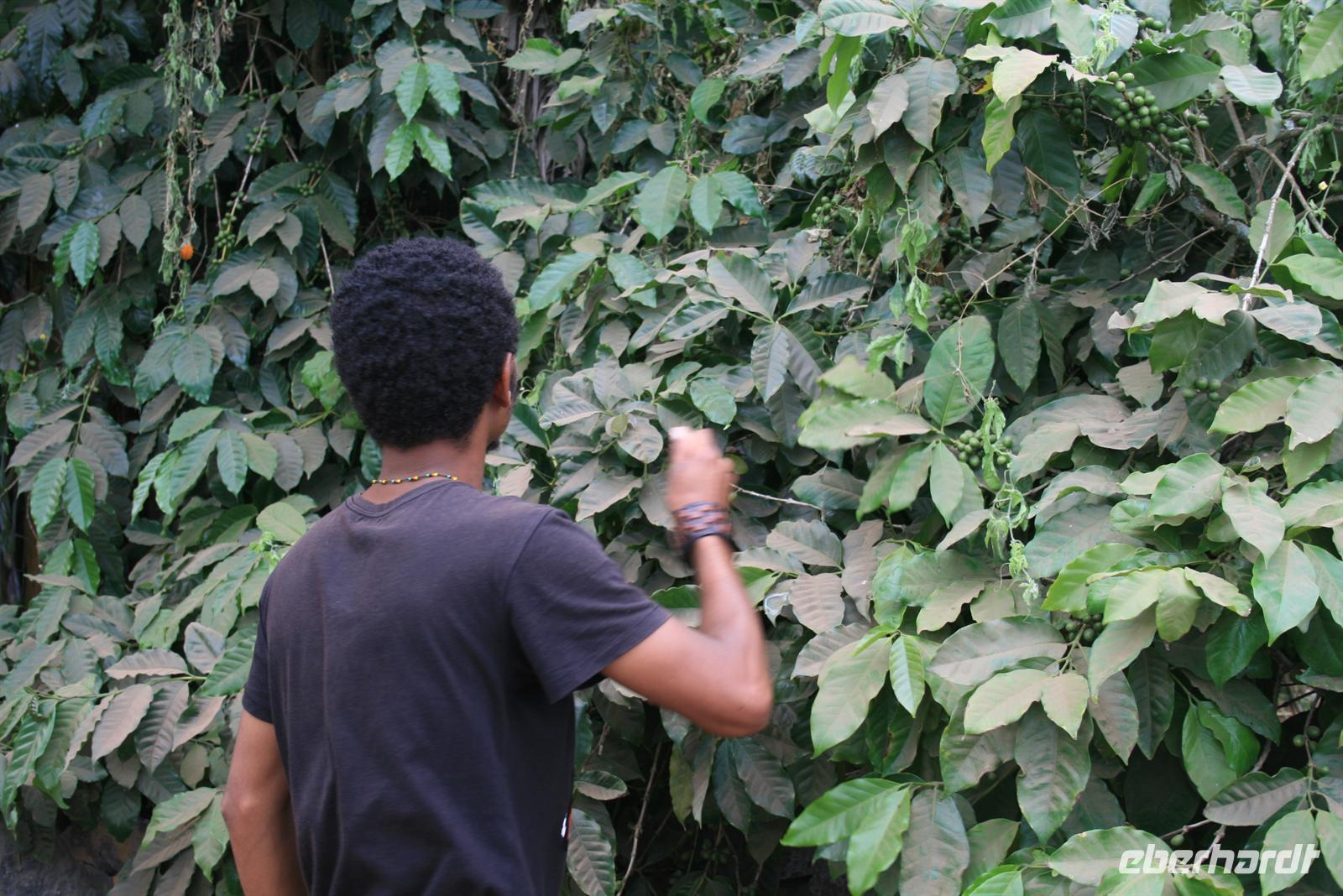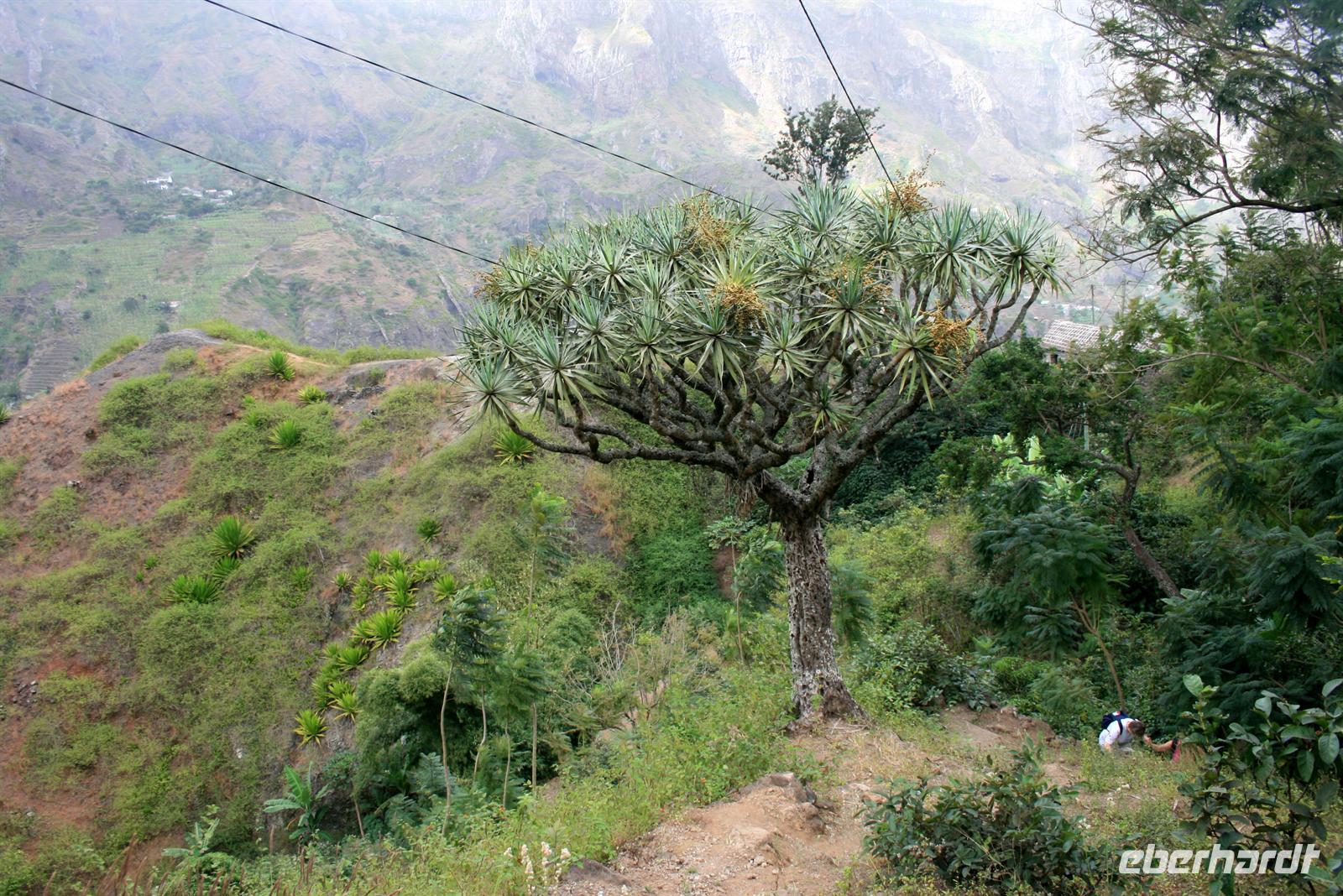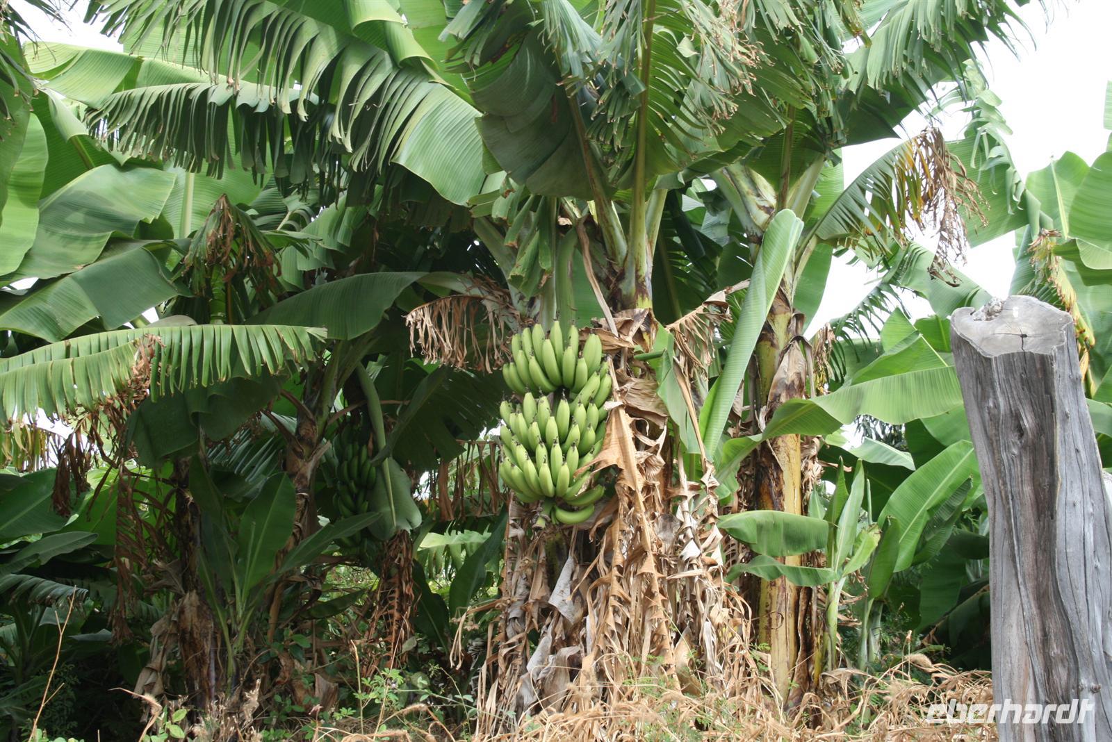In Mosteiros Tras verlassen wir die Ringstraße und fahren ein Stück bergauf zu einigen Obst- und Kaffeeplantagen. Zelito zeigt uns einen Baobab-Baum mit Früchten, einige Kaffeesträucher mit grünen Kaffeebohnen und wir machen einen kleinen Spaziergang (200m) durch einige Bananenplantagen.