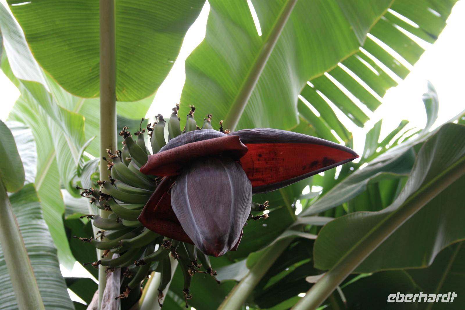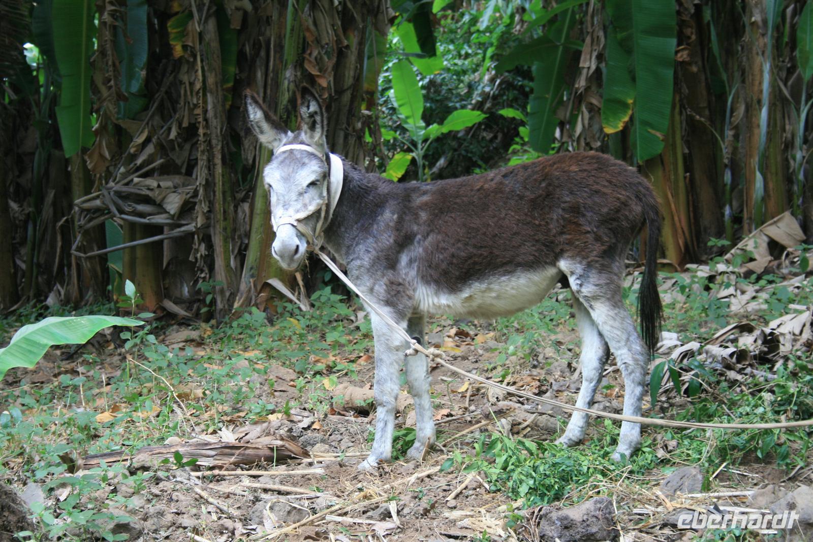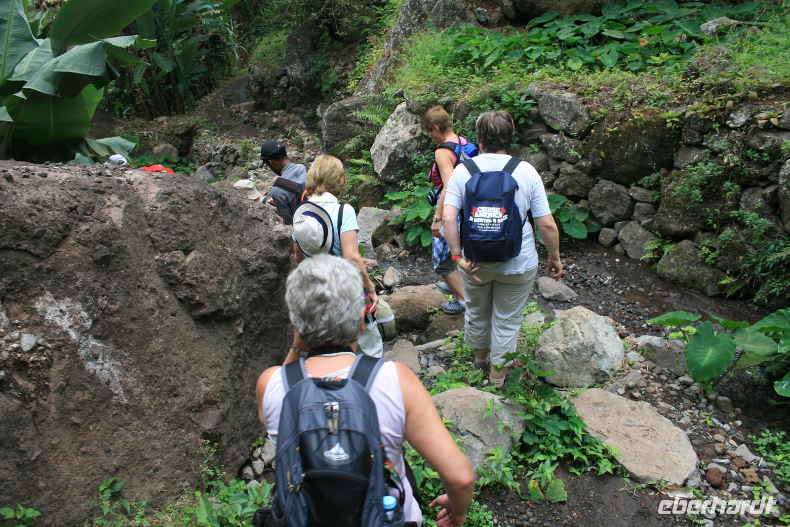 Von der Küste fahren wir bald landeinwärts in das bekannte Paul-Tal. Über eine enge Straße geht es bergauf rechts oberhalb des Tales. Da sich hier an den Berghängen die Wolken stauen und es dadurch feuchter ist, ist das ganze Tal herrlich grün. Überall sieht man exotische Pflanzen und Bäume, Terassenfelder mit Gemüse und kleine Bäche, die die Pflanzen mit Wasser versorgen. Das satte Grün ist eine Wohltat für die Augen!