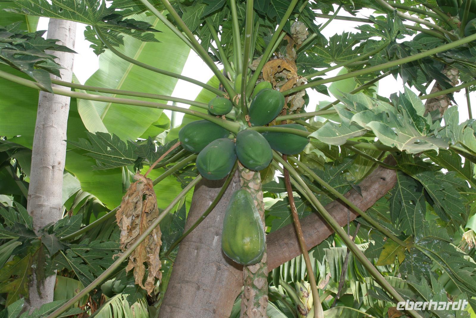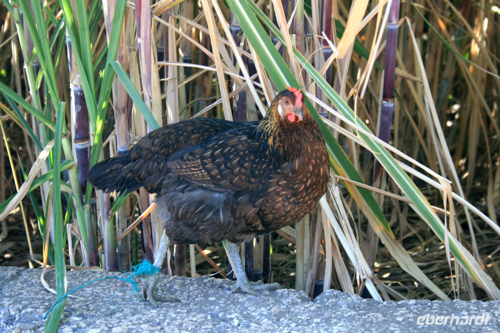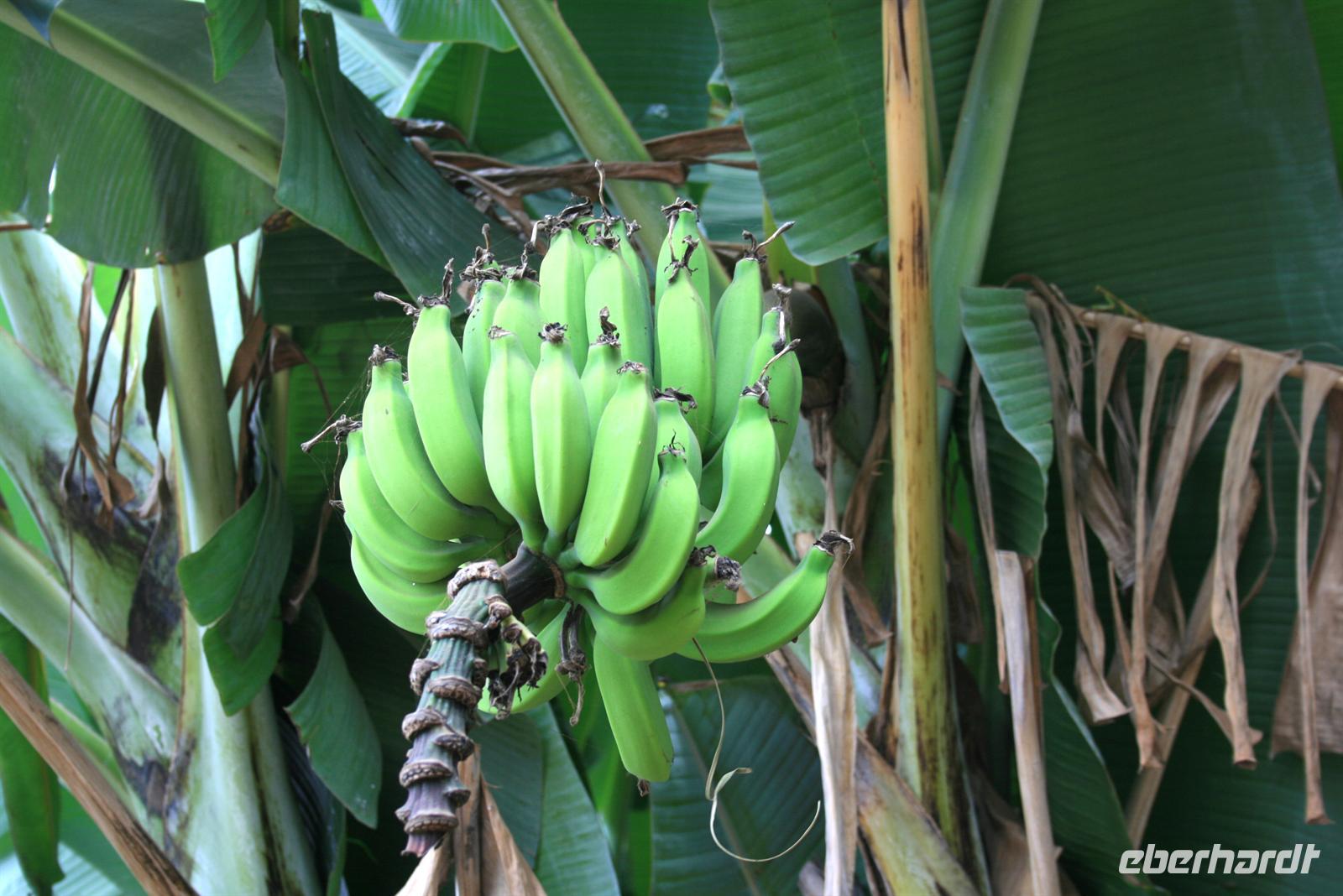 Von der Küste fahren wir bald landeinwärts in das bekannte Paul-Tal. Über eine enge Straße geht es bergauf rechts oberhalb des Tales. Da sich hier an den Berghängen die Wolken stauen und es dadurch feuchter ist, ist das ganze Tal herrlich grün. Überall sieht man exotische Pflanzen und Bäume, Terassenfelder mit Gemüse und kleine Bäche, die die Pflanzen mit Wasser versorgen. Das satte Grün ist eine Wohltat für die Augen!