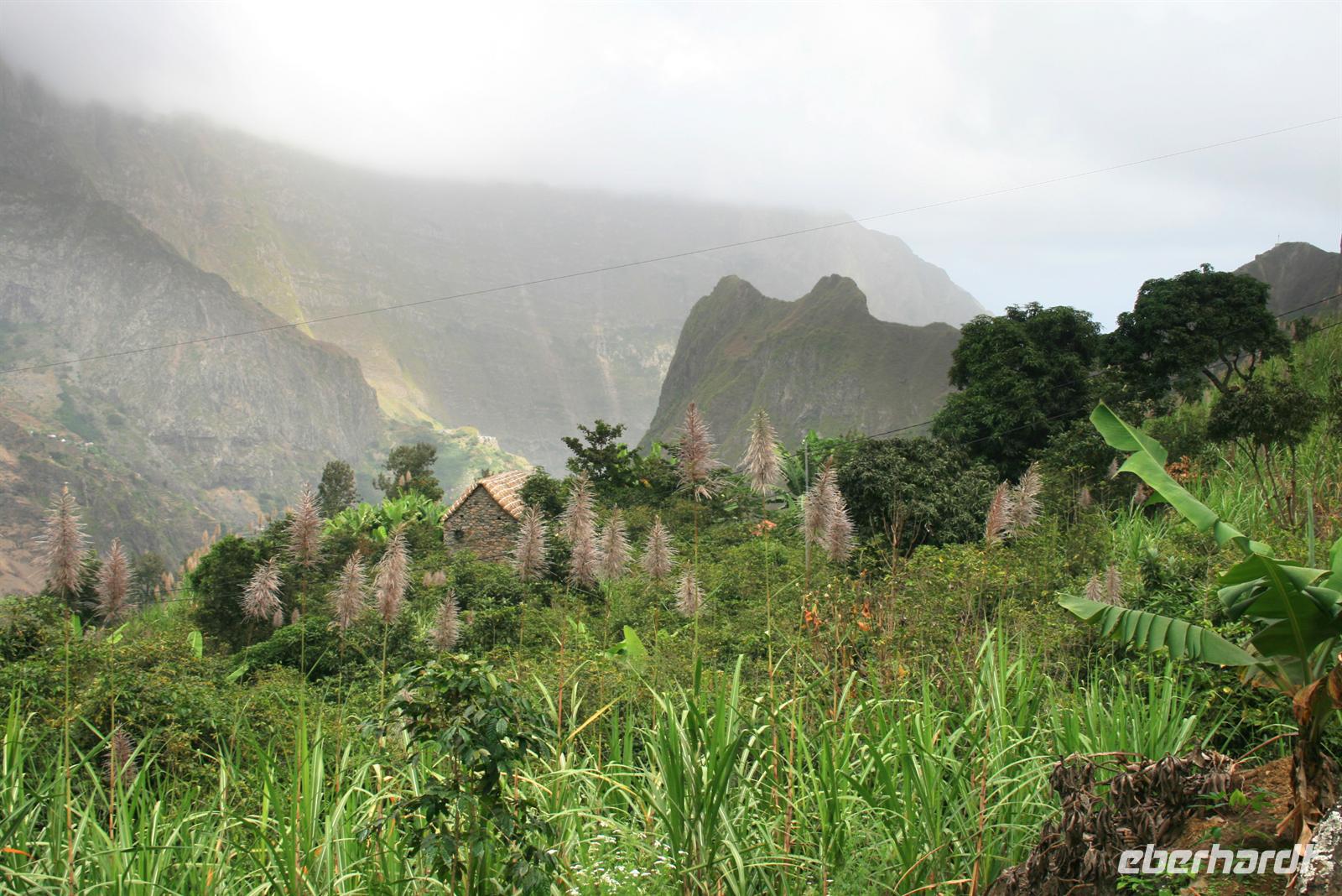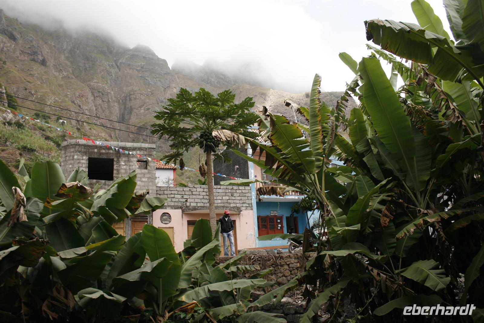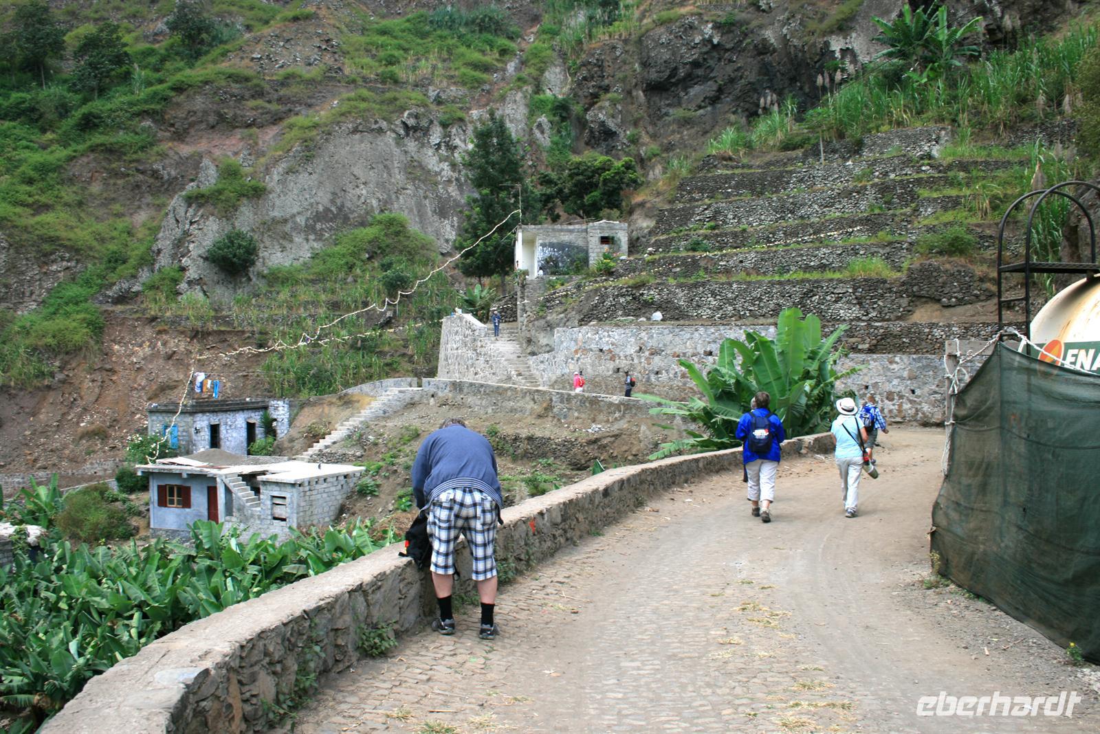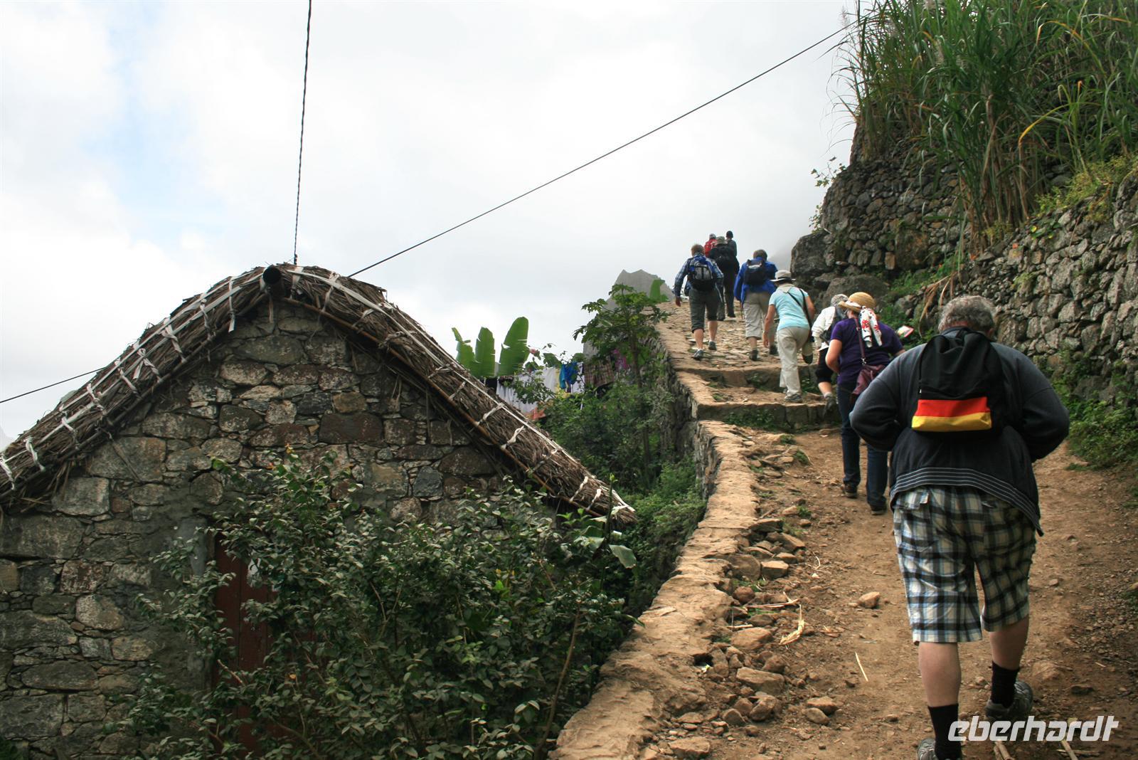 Nach etwa 2 Stunden erreich wir nach der Hälfte des Weges einen kleinen Bauernhof, wo wir zu einem Mittagssnack eingeladen sind. Die Bauern leben sehr einfach und wir bekommen hautnah mit, wie kärglich das Leben hier ist. Es gibt keinen Strom und kein fließendes Wasser. Die Hausfrau kocht an einem Herd mit offenem Feuer. Als Rauchabzug dient kurzerhand ein Loch im Dach des kleinen Hauses. Wir nehmen im Hof an einem Tisch Platz und es gibt eine Art Cachupa mit Bohnen, Reis, Gemüse und Hühnchenfleisch. Wer möchte, kann nach dem Essen für ein paar Escudo auch einen frisch gebrühten Kaffee trinken. Hier treffen wir auch eine andere Wandergruppe, die hier Rast macht.