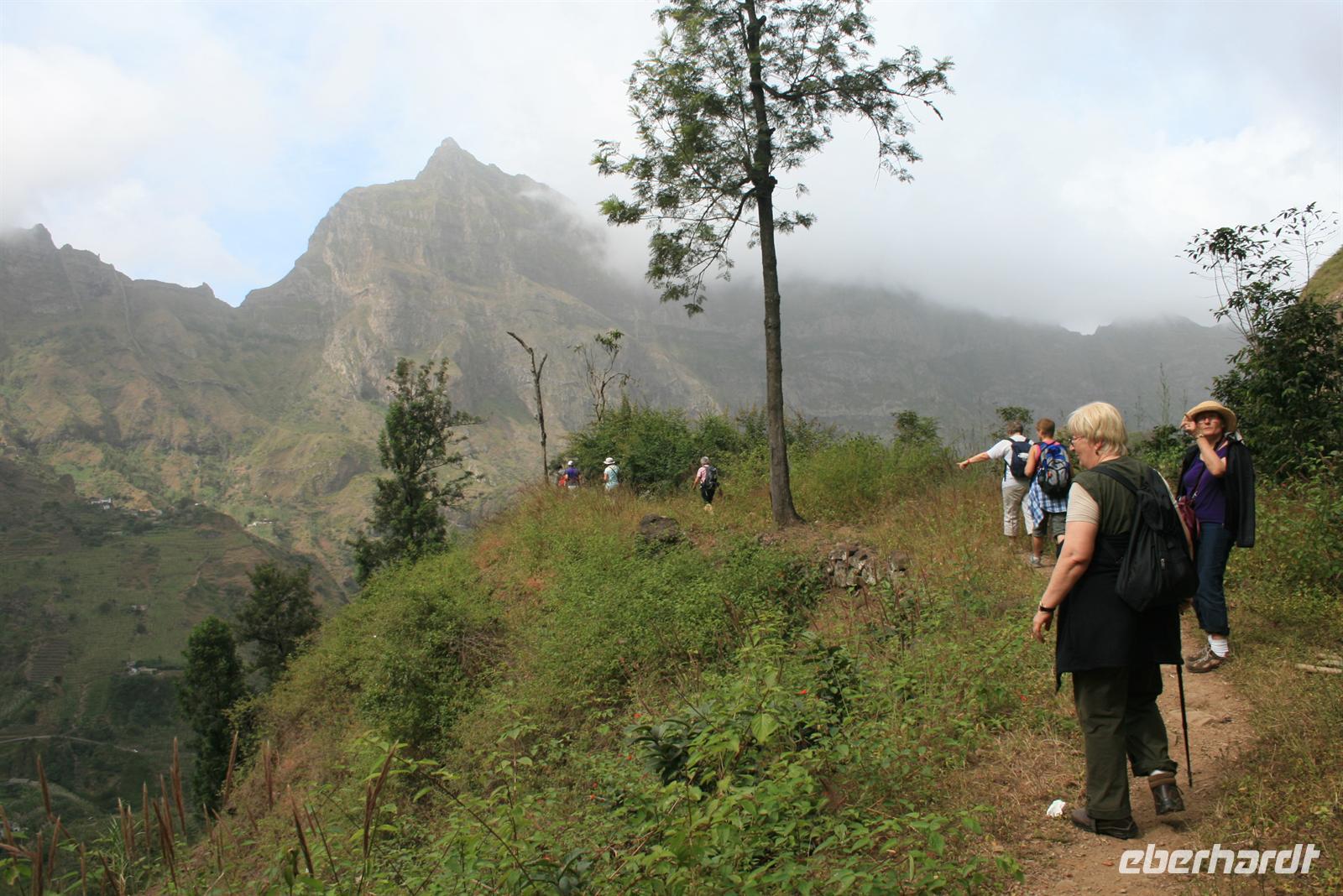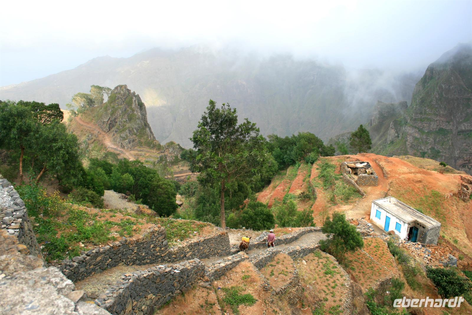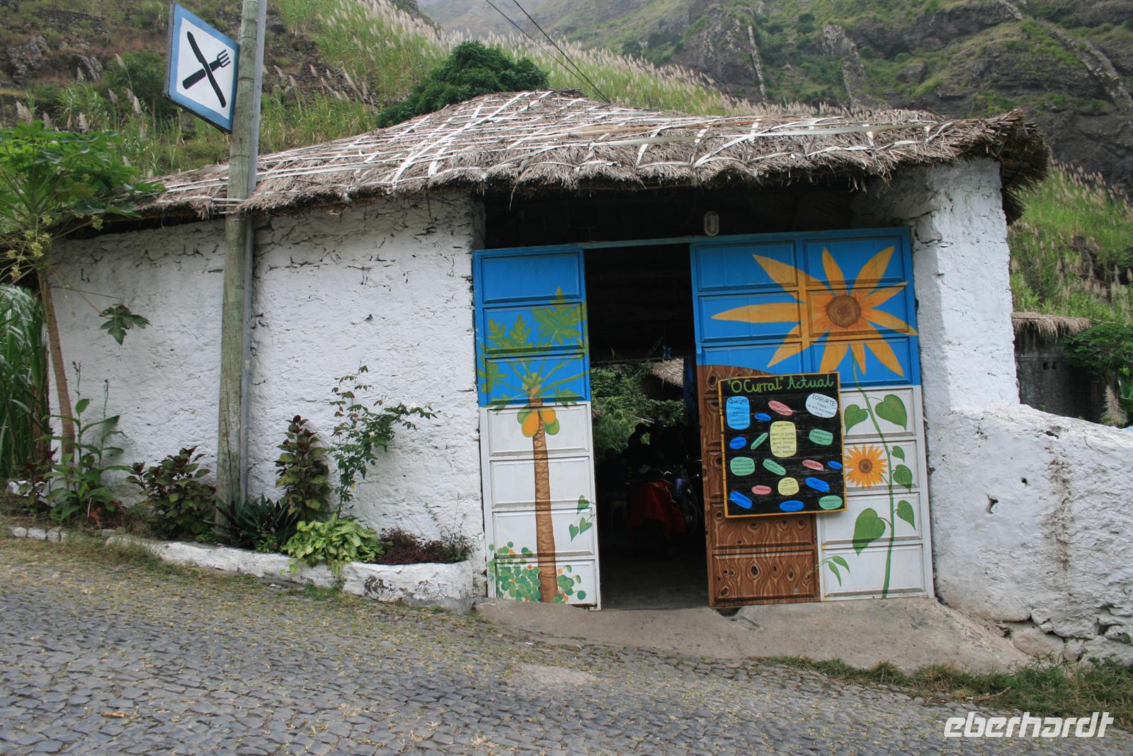 Nach etwa 2 Stunden erreich wir nach der Hälfte des Weges einen kleinen Bauernhof, wo wir zu einem Mittagssnack eingeladen sind. Die Bauern leben sehr einfach und wir bekommen hautnah mit, wie kärglich das Leben hier ist. Es gibt keinen Strom und kein fließendes Wasser. Die Hausfrau kocht an einem Herd mit offenem Feuer. Als Rauchabzug dient kurzerhand ein Loch im Dach des kleinen Hauses. Wir nehmen im Hof an einem Tisch Platz und es gibt eine Art Cachupa mit Bohnen, Reis, Gemüse und Hühnchenfleisch. Wer möchte, kann nach dem Essen für ein paar Escudo auch einen frisch gebrühten Kaffee trinken. Hier treffen wir auch eine andere Wandergruppe, die hier Rast macht.