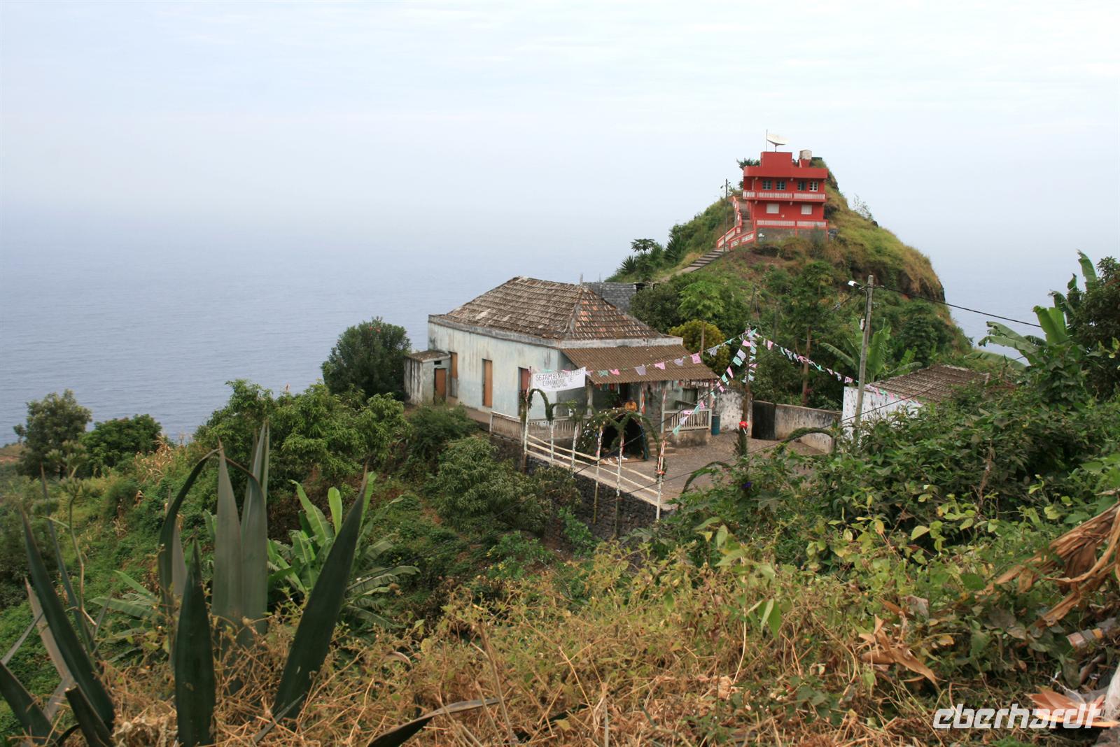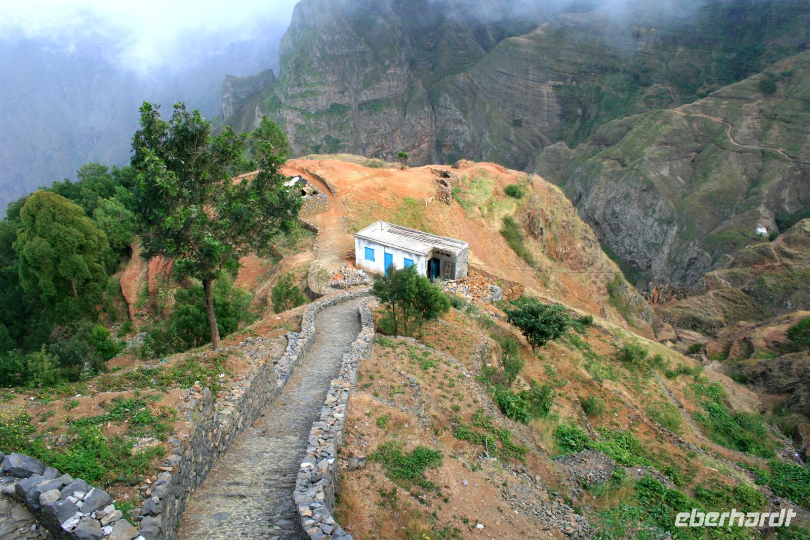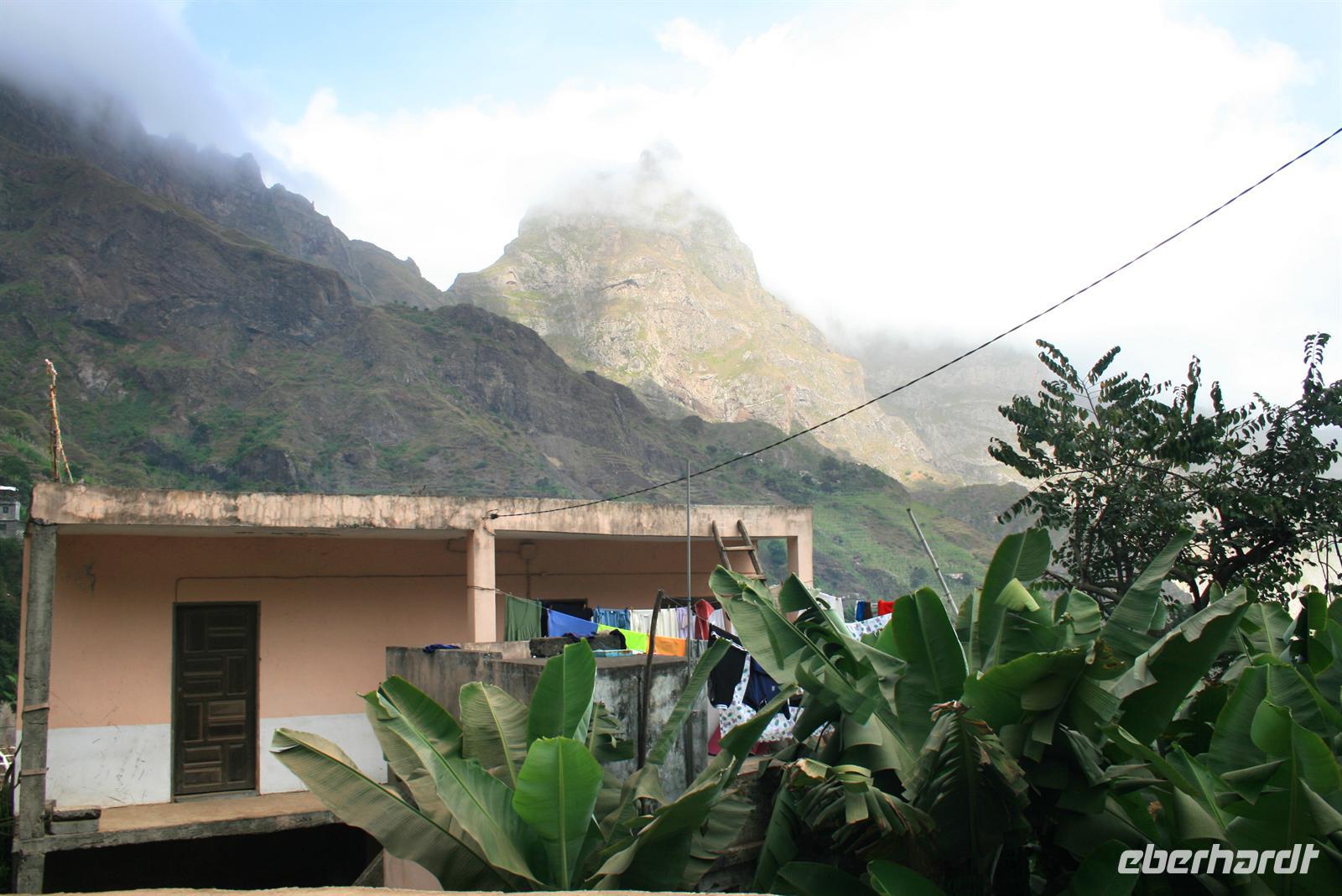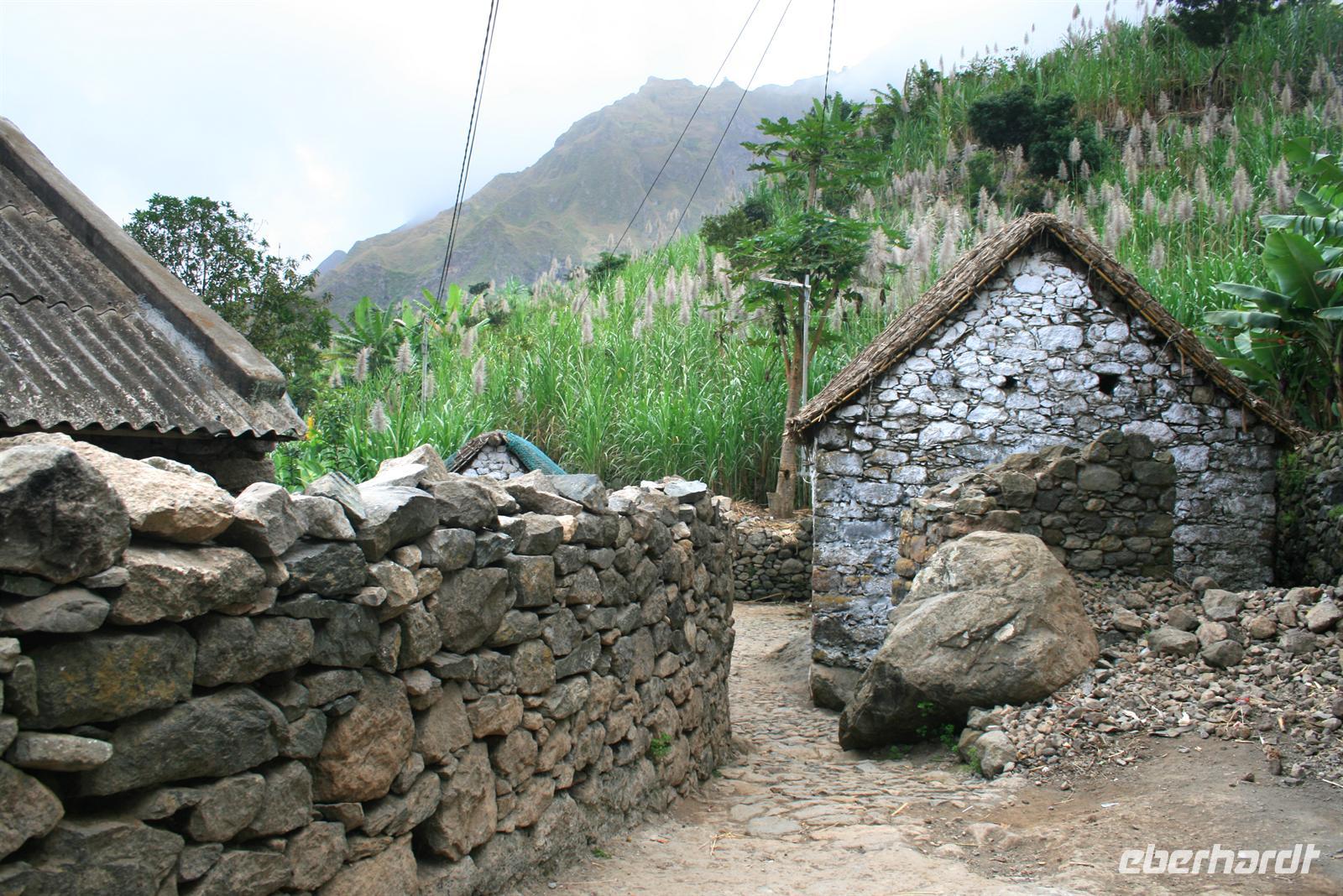 Nach etwa 2 Stunden erreich wir nach der Hälfte des Weges einen kleinen Bauernhof, wo wir zu einem Mittagssnack eingeladen sind. Die Bauern leben sehr einfach und wir bekommen hautnah mit, wie kärglich das Leben hier ist. Es gibt keinen Strom und kein fließendes Wasser. Die Hausfrau kocht an einem Herd mit offenem Feuer. Als Rauchabzug dient kurzerhand ein Loch im Dach des kleinen Hauses. Wir nehmen im Hof an einem Tisch Platz und es gibt eine Art Cachupa mit Bohnen, Reis, Gemüse und Hühnchenfleisch. Wer möchte, kann nach dem Essen für ein paar Escudo auch einen frisch gebrühten Kaffee trinken. Hier treffen wir auch eine andere Wandergruppe, die hier Rast macht.