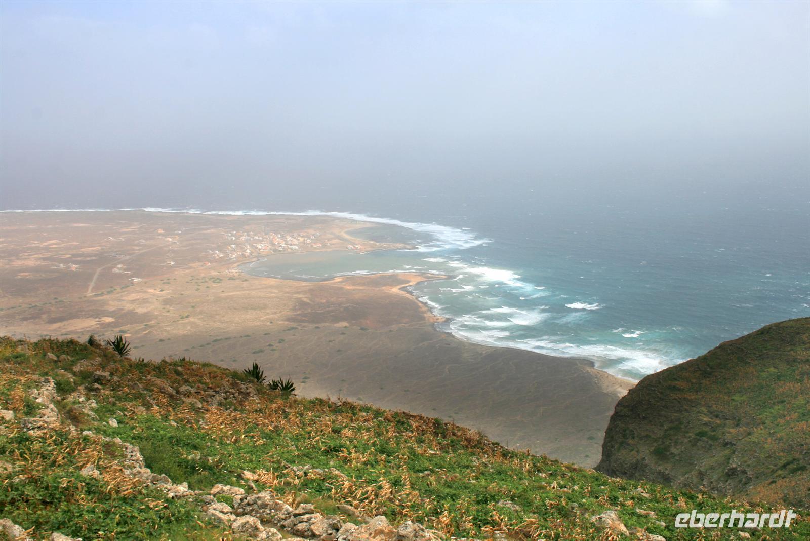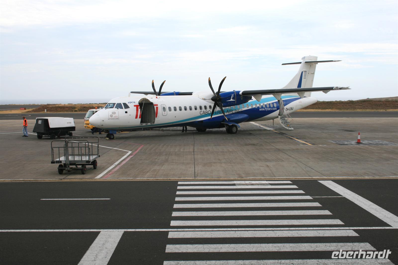 Dann kommt das Flugzeug an und wird erstmal ent- und wieder beladen, betankt und gereinigt. Alles läuft sehr ruhig ab, niemand rennt oder macht Stress. Das ist die kapverdische Mentalität. Auch in der inzwischen voll gewordenen Abflughalle regt sich niemand auf. Das scheint wirklich völlig normal zu sein. Schließlich können wir ins Flugzeug, zu Fuß über die kleine Rollbahn. Es ist eine Propellermaschine mit je vier Sitzen nebeneinander. Das Flugzeug ist modern und es besteht kein Grund zur Sorge bezüglich der Sicherheit. Wir starten mit etwa einer Stunde Verspätung gegen 11.45 Uhr nach Sao Filipe auf die Insel Fogo. Der Flug dauert nur ca. 30 Minuten, Getränke oder Verpflegung gibt es nicht an Bord. Wir landen um 12.15 Uhr auf der "Feuerinsel" Fogo. Bei guter Sicht hat man aus dem Flugzeug schon einen ersten Blick auf den gleichnamigen Vulkan. Bei uns ist es wie so oft etwas diesig.