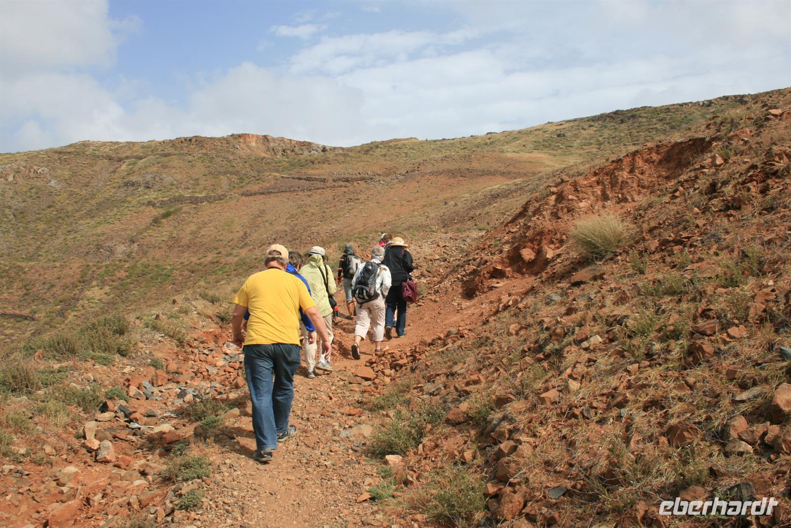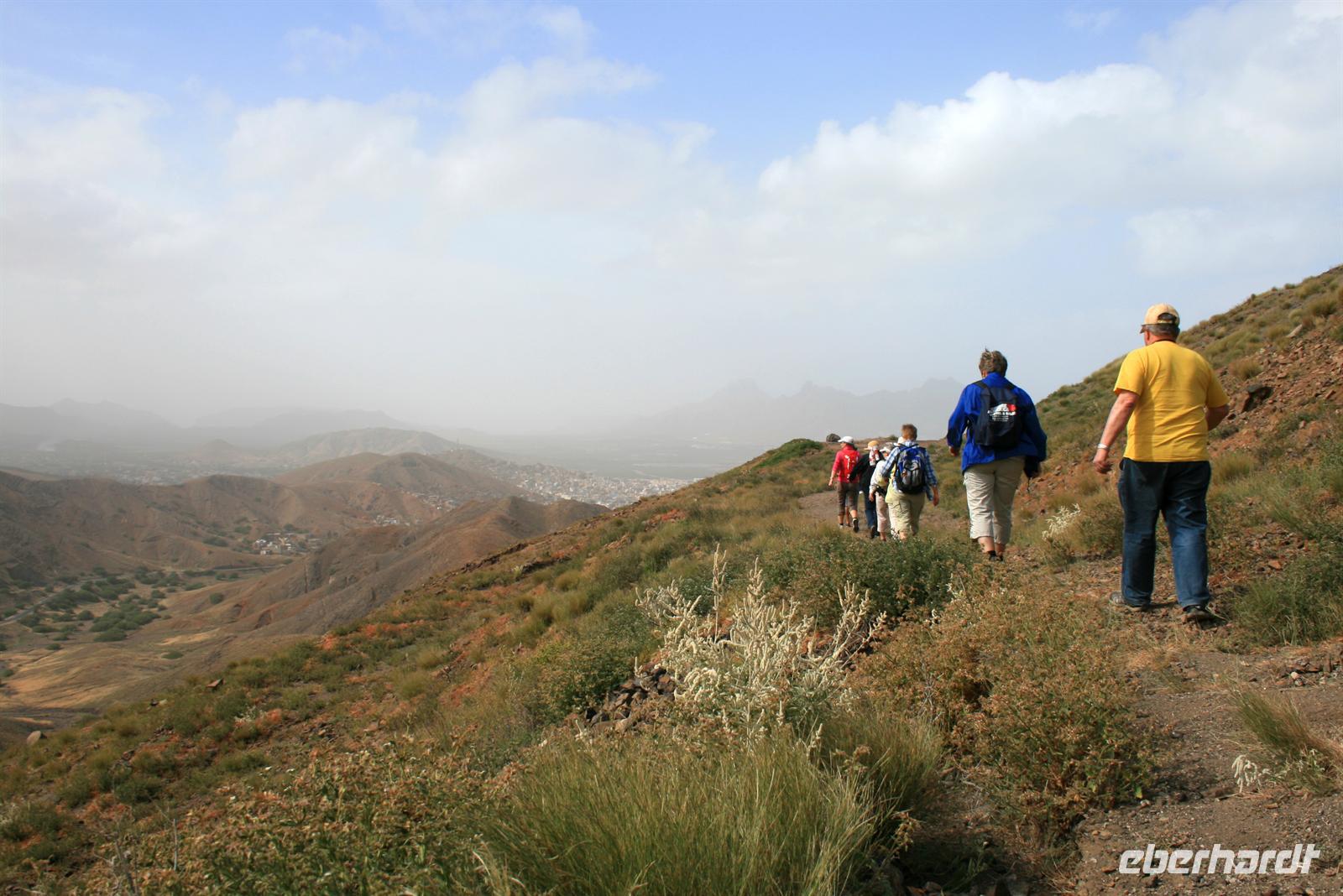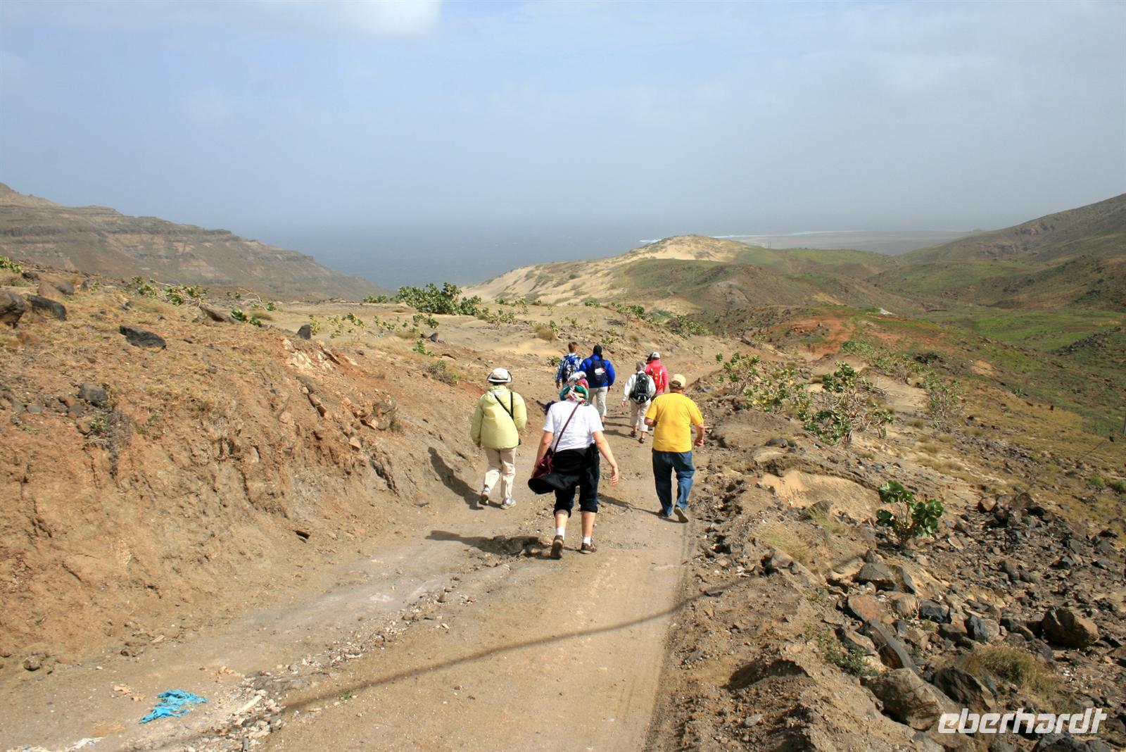 Pünktlich um 8.00 Uhr legen wir ab zur einstündigen Überfahrt nach Santo Antao. Es ist windig, man sollte eine Windjacke dabei haben, aber nicht kalt. Es ist etwas Seegang, aber von uns wird keinem schlecht. Empfindliche Menschen sollten dennoch lieber Reisetabletten dabei haben. Pünktlich um 9.05 Uhr legen wir im Hafen von Porto Novo an. Wir drängeln uns hinunter in den Frachtraum und sichern unsere Koffer. Draußen wartet unser örtlicher Reiseleiter Max mit einem weißen Eberhardt-Schild auf uns. Der Kleinbus durfte nicht in den Hafen fahren. So müssen wir unsere Koffer einen ziemlich langen Weg über Schotter, Sand und Pflastersteine ziehen. Das war echt blöd! Max und der Fahrer helfen zwar, wo sie können, aber es ist ziemlich beschwerlich, durch die Menschenmassen zu kommen.