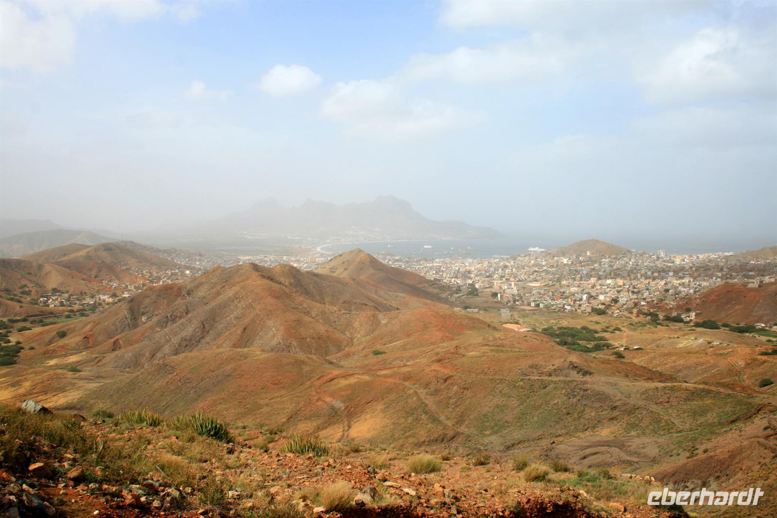 Um 11.40 Uhr sollte unser Flug nach Praia starten. Da wir auf den Kapverden sind, geht es aber nicht ohne Verspätung ab. Irgendwann kommt das Flugzeug und wir starten gegen 12.15 Uhr nach Praia. Hier gehen wir durch die Halle domestic arrivals nebenan in die Halle domestic departures, die wir ja schon von unserem ersten Flug kennen. Davor gibt es einen Kiosk, an dem man sich Getränke, Kuchen und ein Sandwich holen kann. Einige nutzen die Wartezeit zum Mittagssnack. Unser Anschlussflug startet statt 13.35 Uhr auch mit einer halben Stunde Verspätung um 14.10 Uhr. Mittlerweile haben wir uns ein bisschen daran gewöhnt. Der Flug dauert etwa 50 Minuten und wir landen gegen 15.00 Uhr sicher in Sao Vicente am Flughafen Sao Pedro, der etwa 8 km von Mindelo entfernt liegt. Es ist ein kleiner, aber modernerer Flughafen mit "richtigem Kofferband". Wir nehmen unsere Koffer und gehen hinaus (ohne irgendwelche Kontrollen). Dort treffen wir Lori, unsere örtliche, Englisch sprechende Reiseleiterin und unseren Fahrer. Wir haben einen Kleinbus mit 10 Sitzen, das Gepäck passt mit in den Kofferraum.