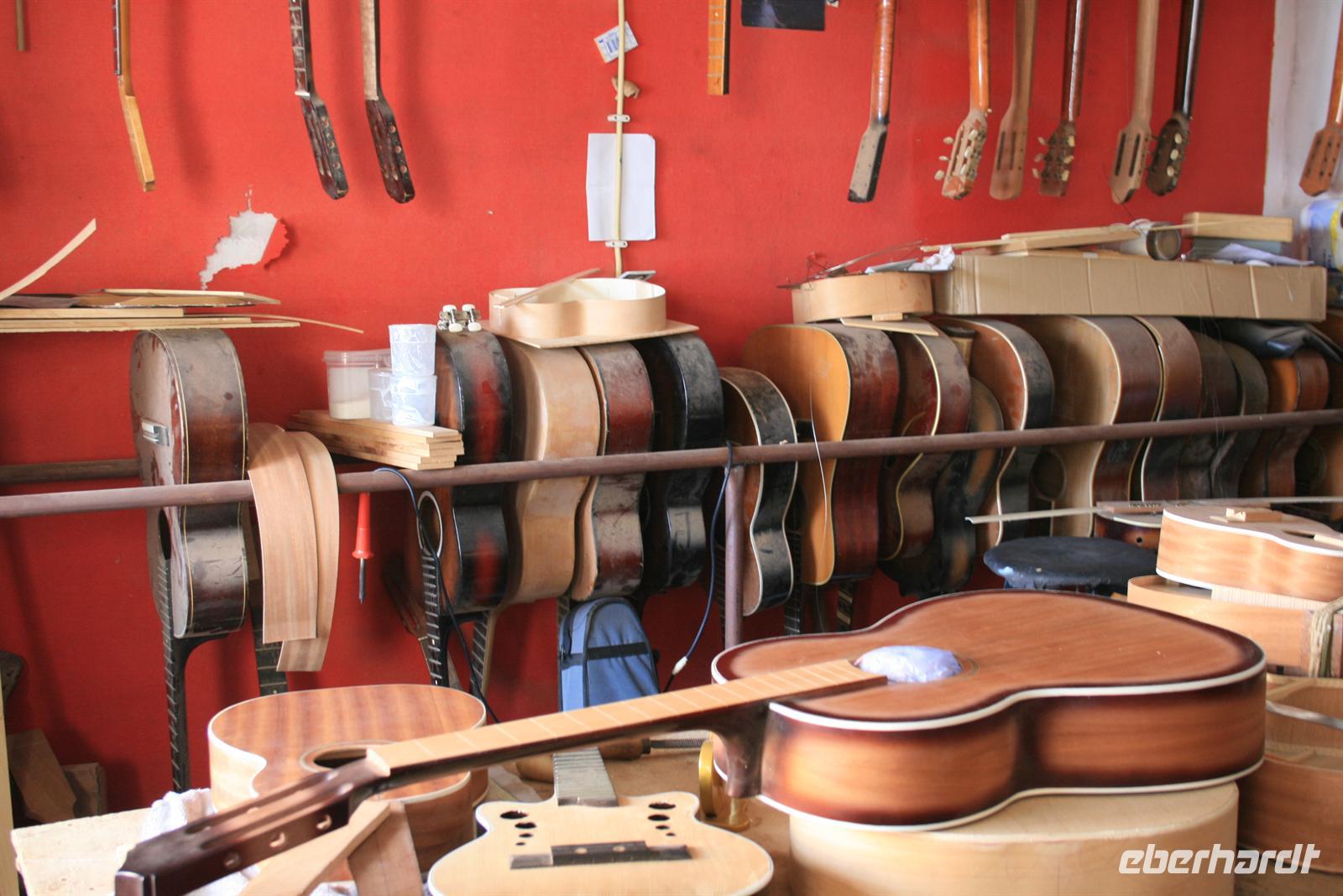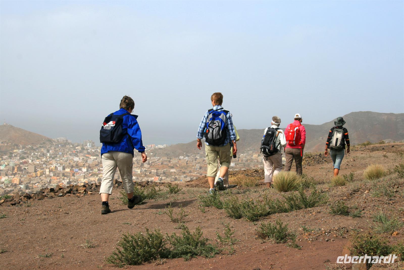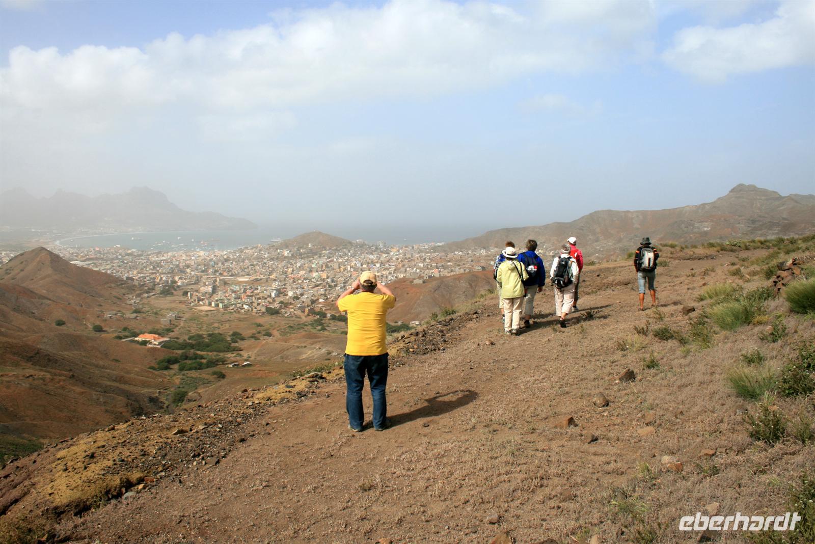 Unser Kleinbus holt uns vor der Markthalle ab, denn wir müssen etwa 10 Minuten fahren, um zu unserem nächsten Besichtigungspunkt zu kommen. Wir besuchen die kleine familiengeführte Gitarrenwerkstatt der Familie Baptista. Der Sohn Luis Baptista hat die Gitarrenherstellung von seinem Vater übernommen und stellt uns die Techniken zur Herstellung heute vor. Danach spielen uns Luis und seine zwei Mitarbeiter einige typische Lieder der Kapverden live vor. Wir bekommen also ein kleines Privatkonzert, das wirklich toll ist. Nach dieser authentischen Begegnung mit den Kapverdianern erklimmen wir mit dem Kleinbus einen Hügel oberhalb der Stadt und genießen einen herrlichen Blick über Mindelo und den Naturhafen Porto Grande.