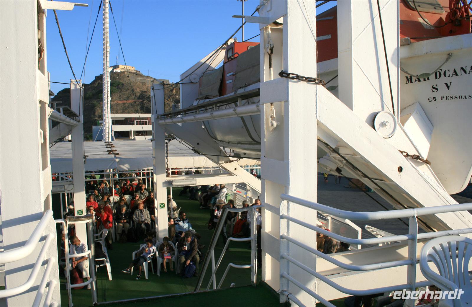 Gegen 9.30 Uhr gehen wir an Bord. Unser Gepäck bleibt wie gewohnt im Frachtraum. Um 10.00 Uhr legt die Fähre ab zurück nach Mindelo. Die See ist etwas bewegt und das Schiff schaukelt unterwegs ziemlich hin und her. Man muss sich gut festhalten, wenn man sich auf der Fähre bewegt.