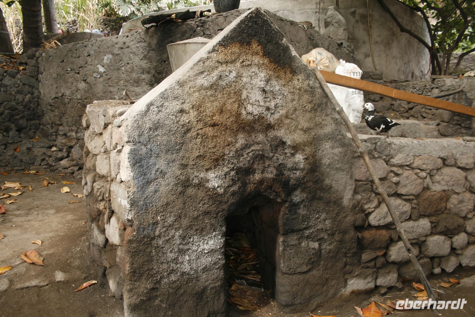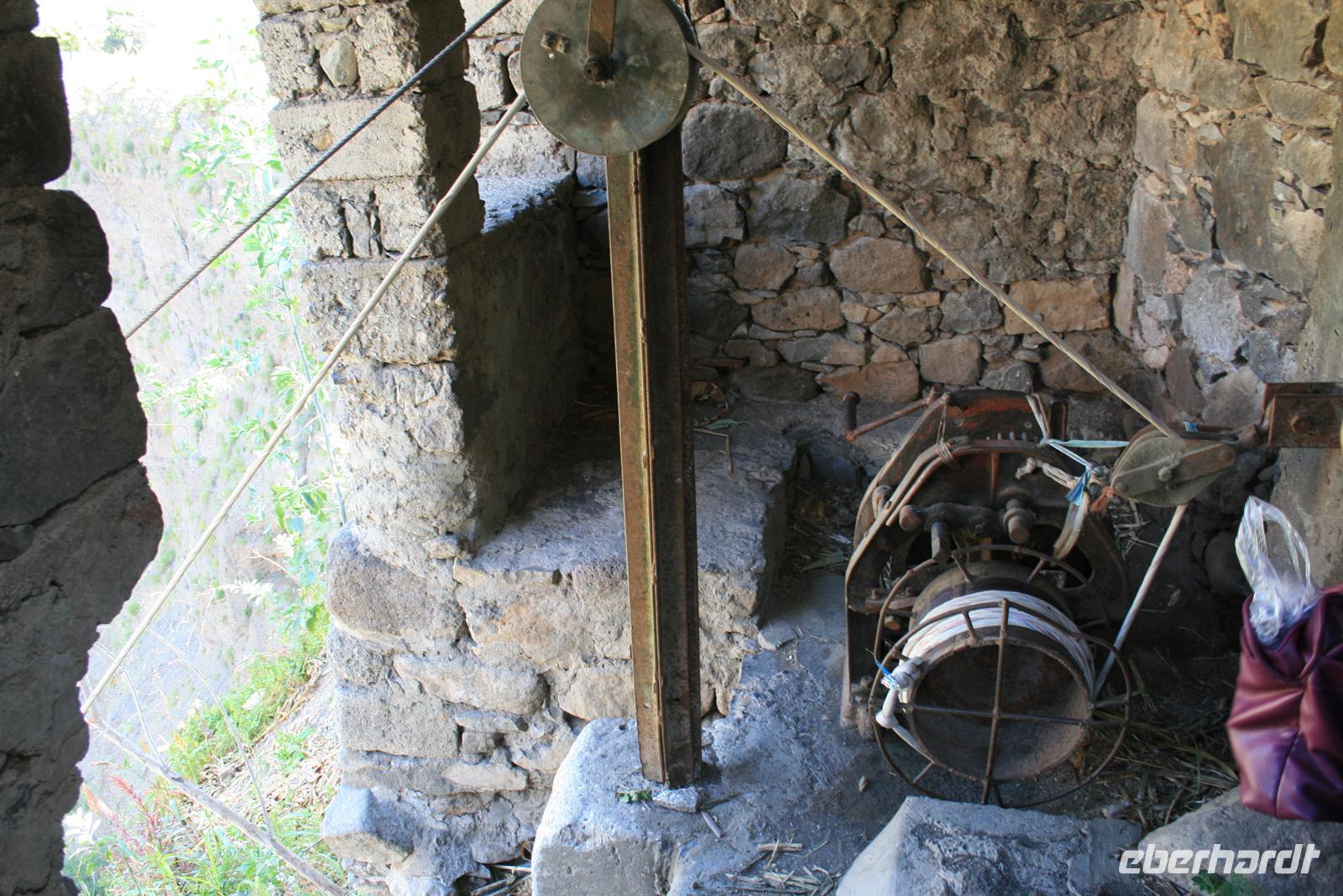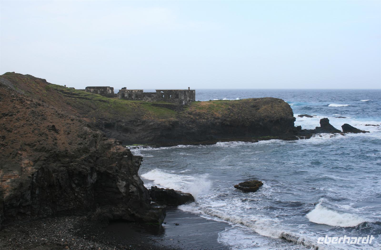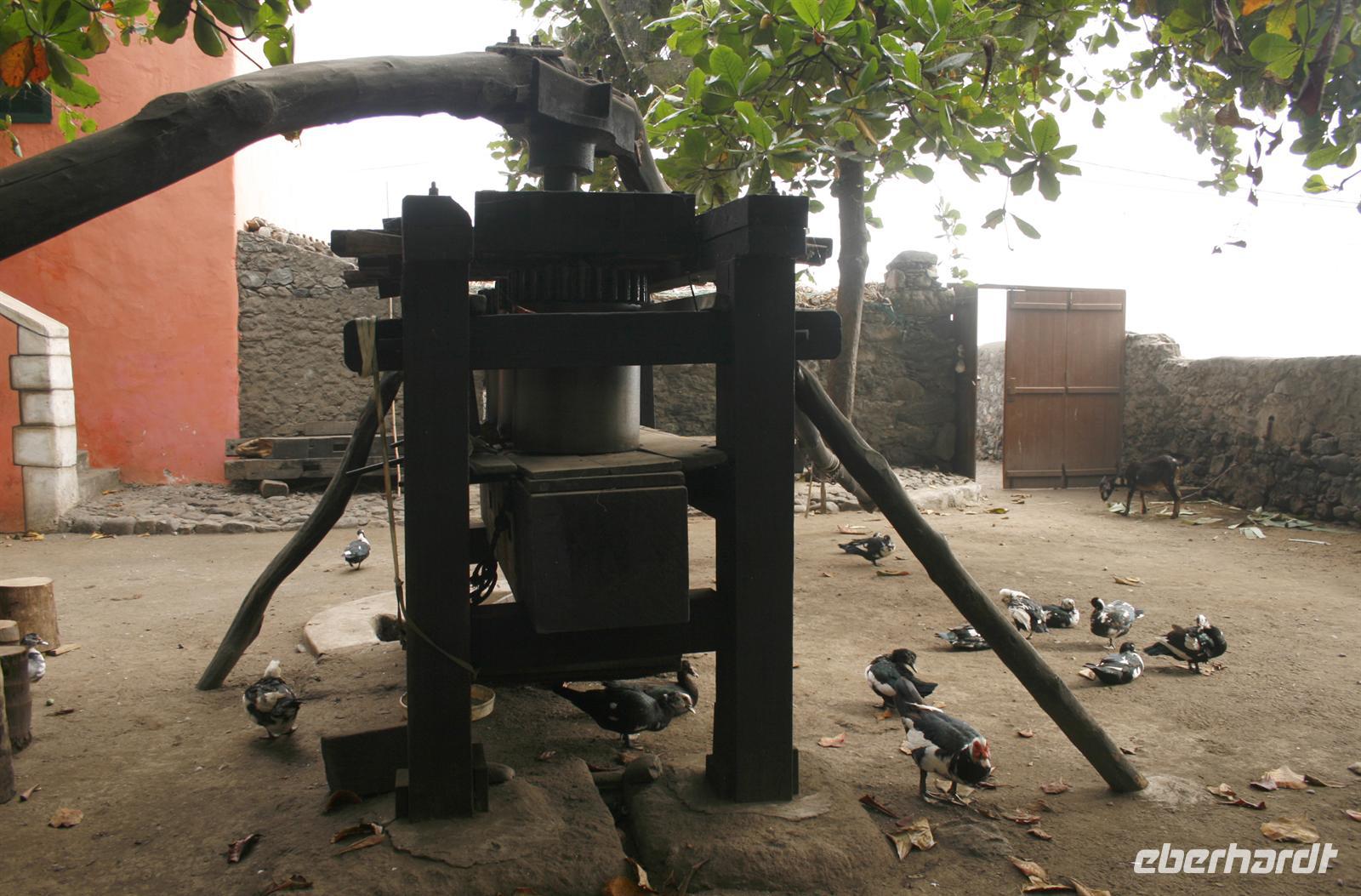 Nach ein paar Fotostopps an der wellenumtosten Küste erreichen wir unser erstes Ziel - eine kleine dörfliche Grogue-Destillerie. Grogue ist die Bezeichnung des hochprozentigen kapverdischen Zuckerrohrschnapses. Wir bestaunen eine urtümliche Zuckerrohr-Mühle (Trapiche), die mit Ochsen angetriebn wird und auch heute noch von der Bauernfamilie verwendet wird. Auch den Ofen und die sonst benötigen Gerätschaften zum Destillieren sehen wir auf dem Bauernhof. Wer möchte, kann den Schnaps auch probieren.