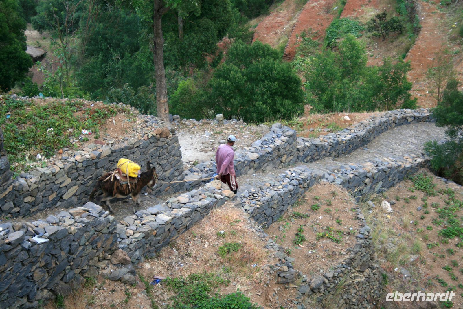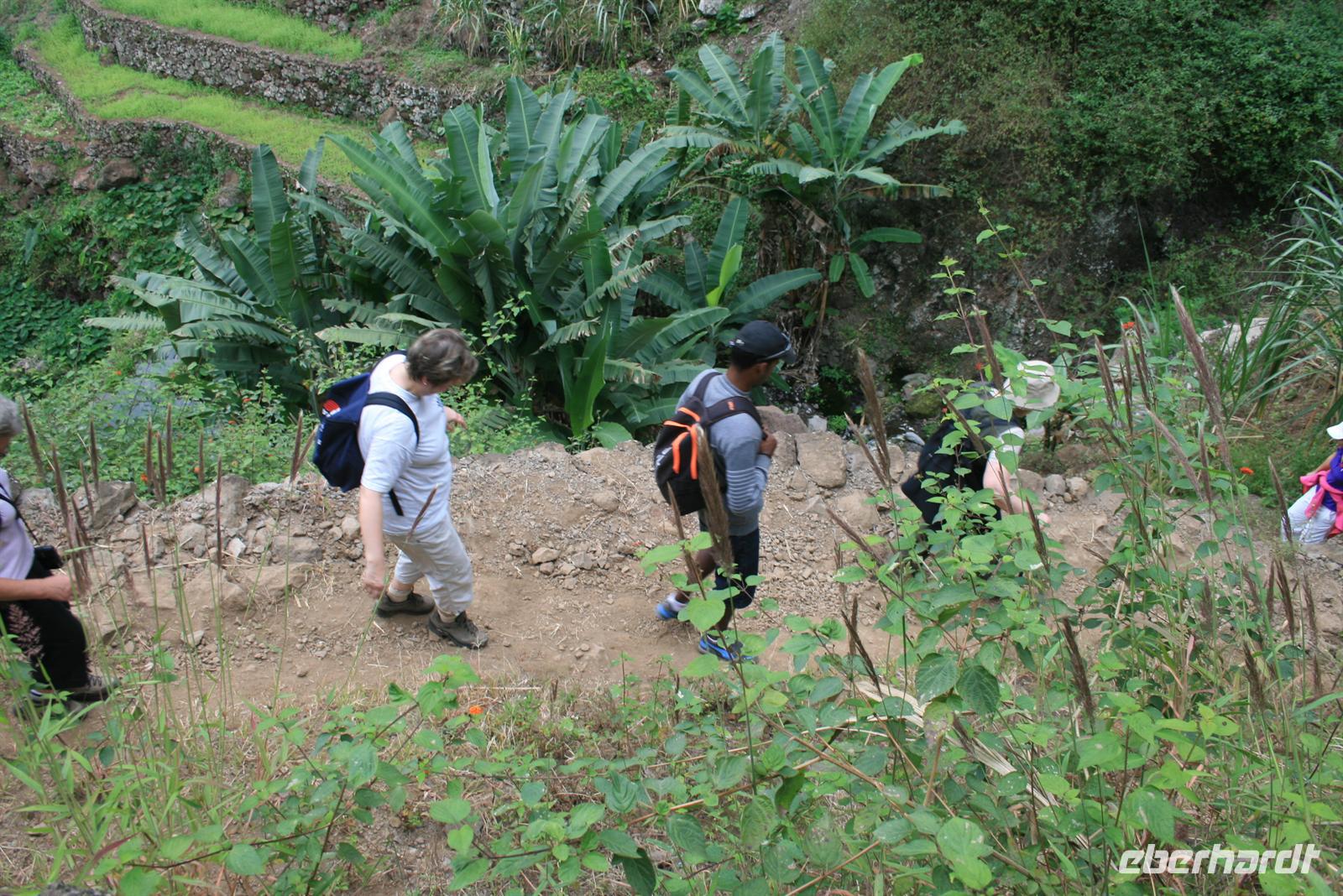 Wir fahren hinauf bis zum Ende der Straße. Von hier startet unsere mehrstündige Wanderung durch das Paul-Tal. Das erste Stück führt entlang befestigter Lehmwege. Dann geht es bergauf und bergab auf schmalen Pfaden entlang der Terassenfelder, Obstplantagen und kleinen Bauernhäuser. Auch ein paar kleine Bäche müssen wir entlang von Felsbrocken überqueren. Hier sllte man unbedingt gute Wanderschuhe haben und eine gewisse Trittsicherheit.