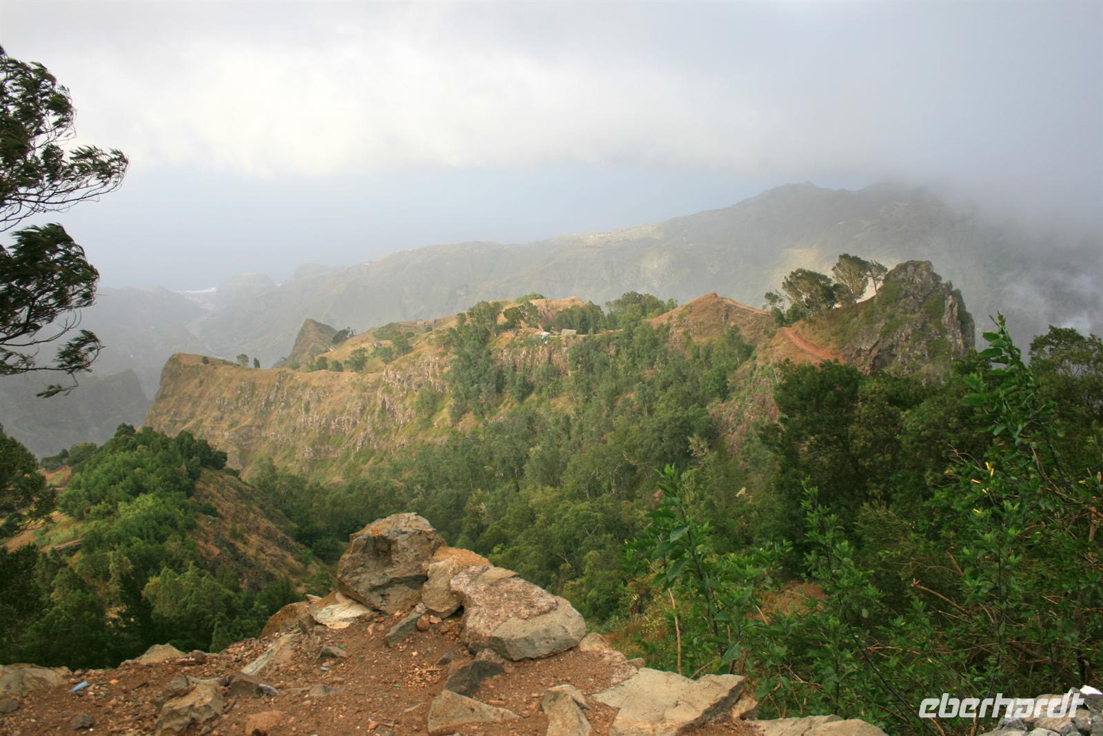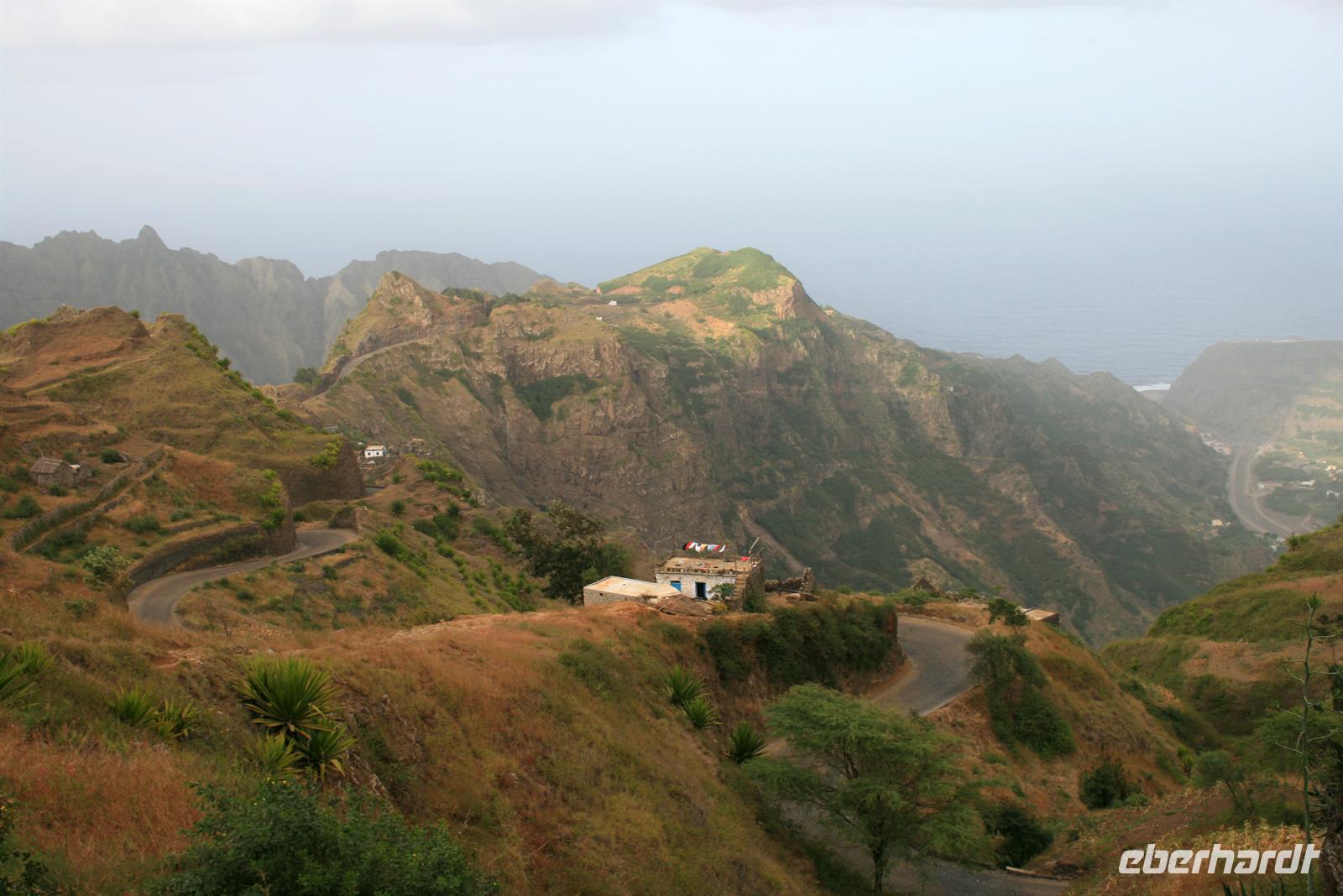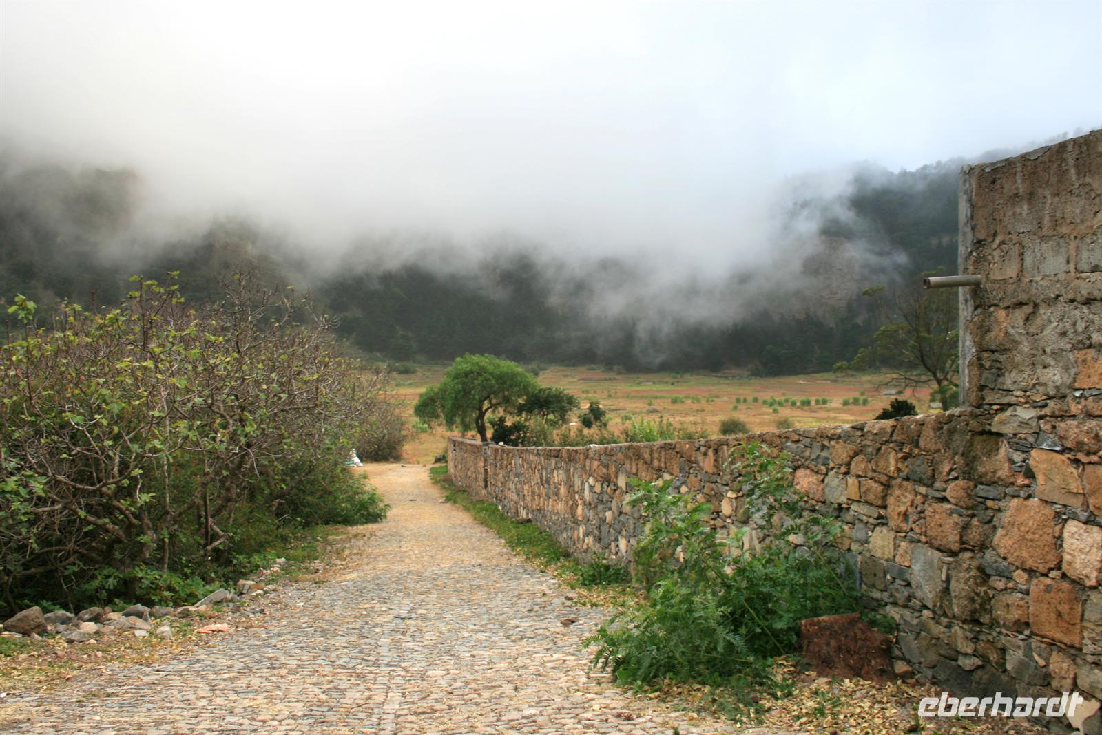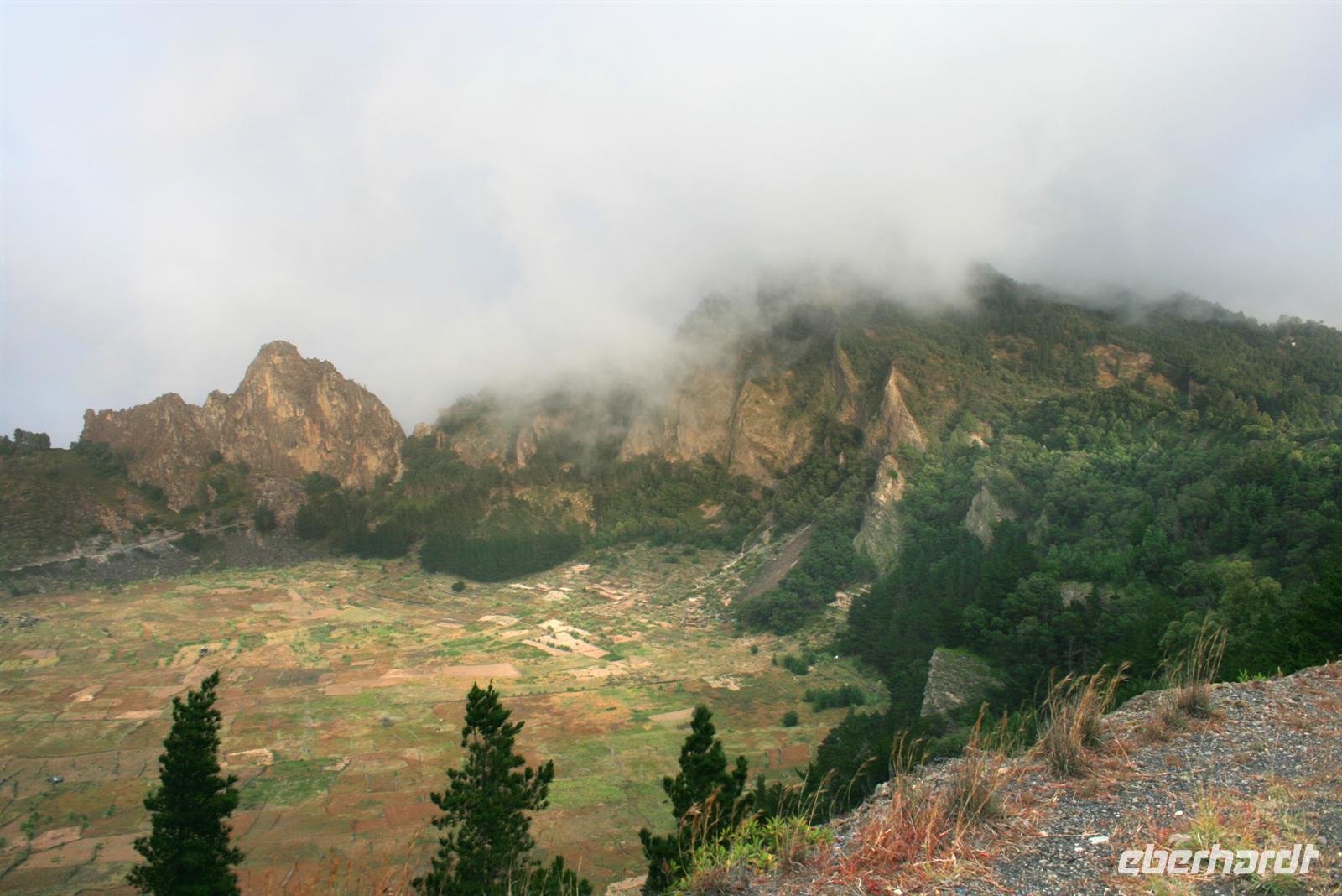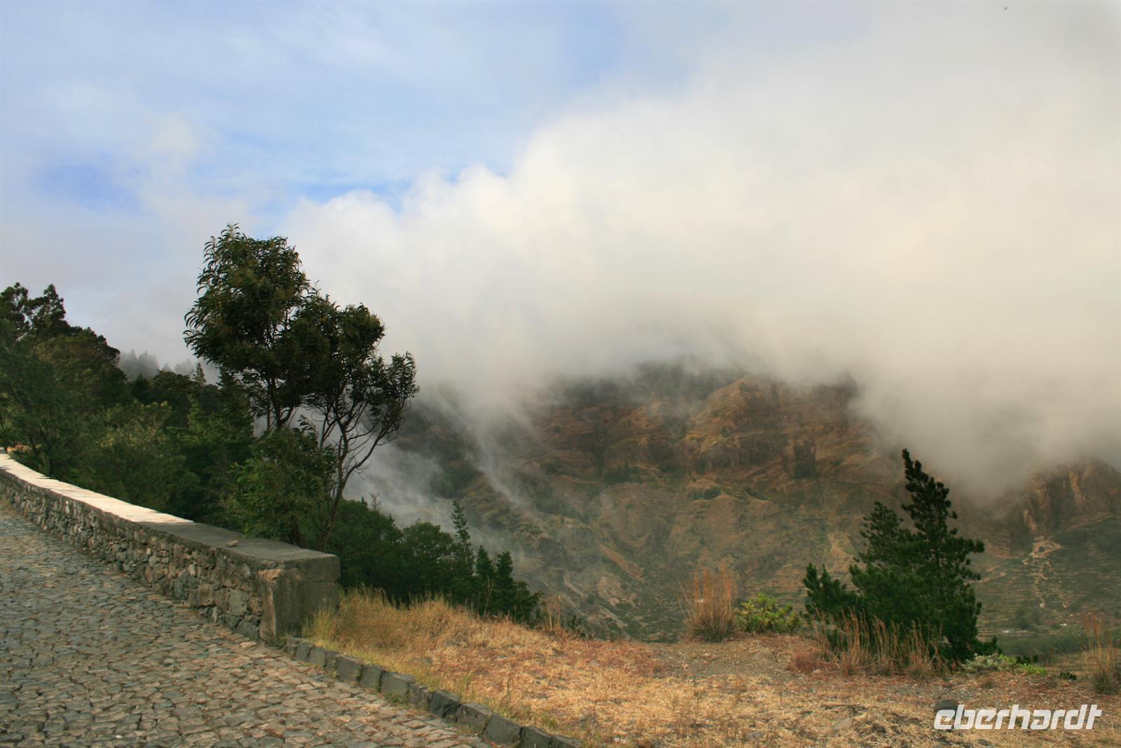 Nach der Erfrischungspause steigen wir wieder in unseren Kleinbus und setzen unsere Inselrundfahrt auf Santo Antao in Richtung Nordküste fort. Wir sehen die Ruinen der jüdischen Synagoge im gleichnamigen Ort Synagoga. Dann verlassen wir die Küstenstraße und fahren landeinwärts und bergauf entlang der Panoramastraße in das Bergland von Santo Antao. Wir fahren hinauf bis auf 2700 Meter. Hier bieten sich uns atemberaubende Blicke in das wolkenverhangene Bergland der Insel. Die Atmosphäre ist richtig mystisch. Draußen ist es nun sehr kühl (etwa 10 °C) und es ist ratsam, eine leichte Jacke dabei zu haben. Nachdem wir den höchsten Pass überquert haben geht es wieder abwärts bis wir den Cova-Krater erreichen.