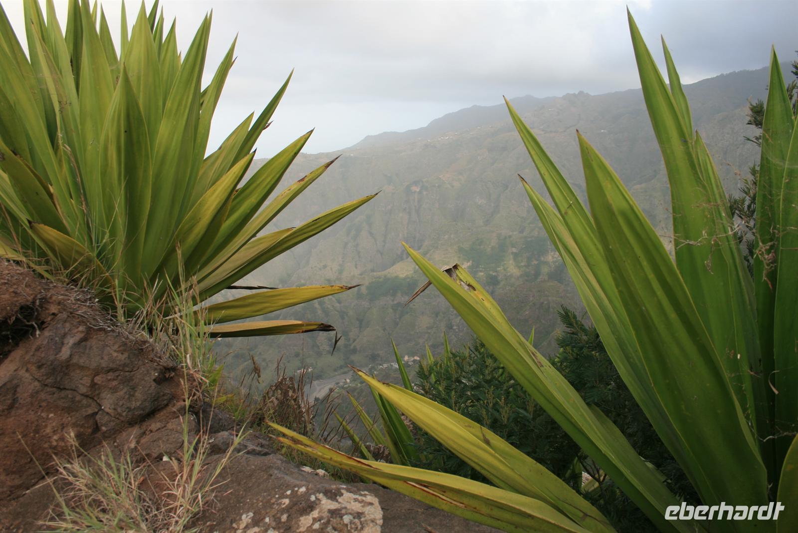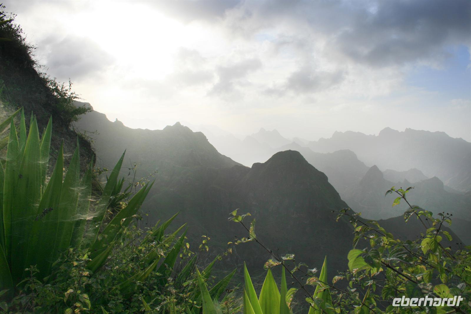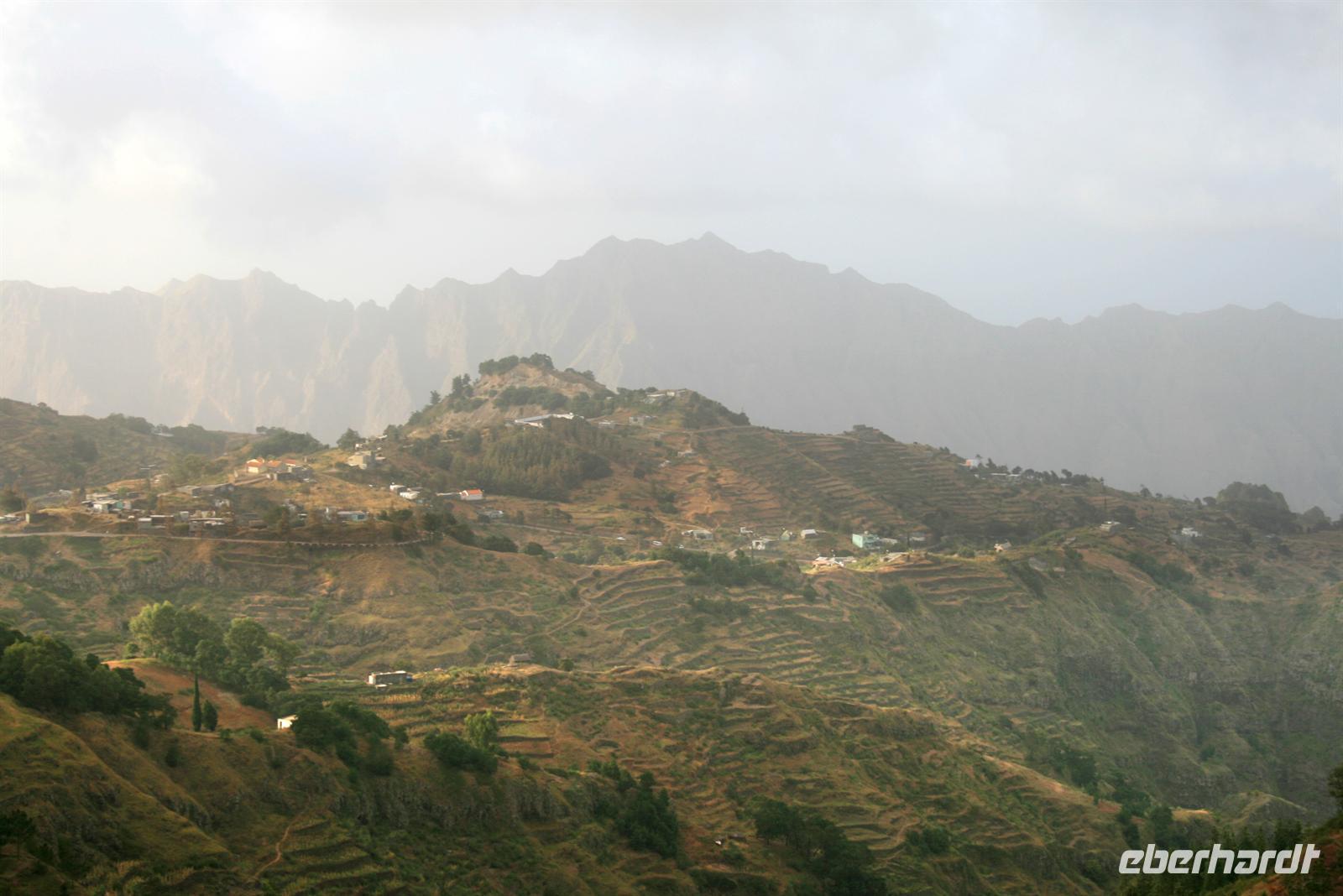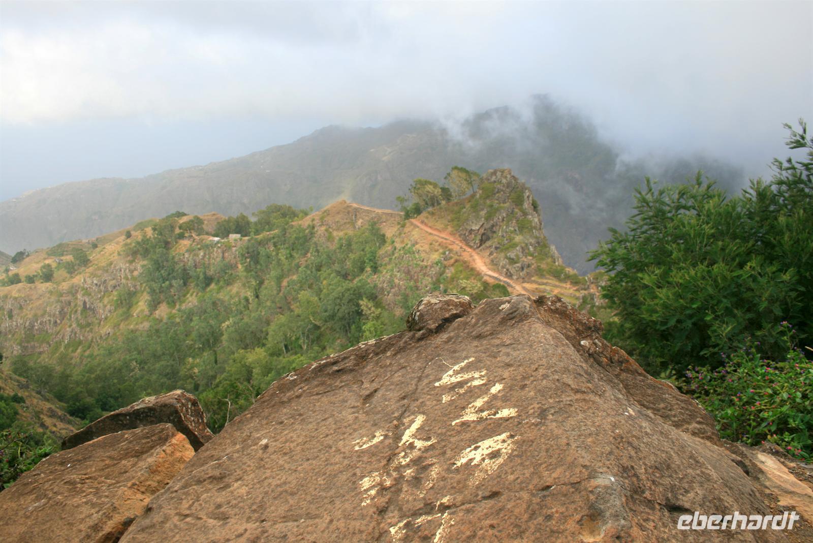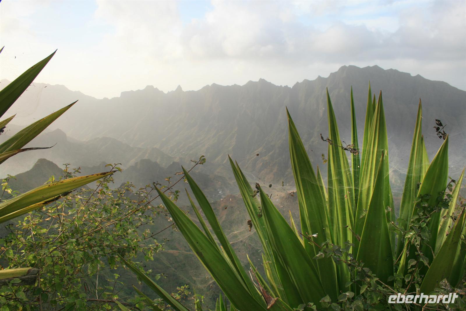Nach der Erfrischungspause steigen wir wieder in unseren Kleinbus und setzen unsere Inselrundfahrt auf Santo Antao in Richtung Nordküste fort. Wir sehen die Ruinen der jüdischen Synagoge im gleichnamigen Ort Synagoga. Dann verlassen wir die Küstenstraße und fahren landeinwärts und bergauf entlang der Panoramastraße in das Bergland von Santo Antao. Wir fahren hinauf bis auf 2700 Meter. Hier bieten sich uns atemberaubende Blicke in das wolkenverhangene Bergland der Insel. Die Atmosphäre ist richtig mystisch. Draußen ist es nun sehr kühl (etwa 10 °C) und es ist ratsam, eine leichte Jacke dabei zu haben. Nachdem wir den höchsten Pass überquert haben geht es wieder abwärts bis wir den Cova-Krater erreichen.