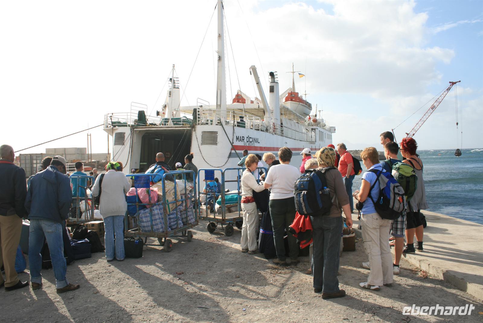 Nach dem Frühstück im Hotelrestaurant werden wir mitsamt unserer Koffer per Pkw am Hotel abgeholt und zum Hafen gefahren. Es sind schon wieder jede Menge Einheimische am Hafen und warten auf die Ankunft der Fähre. Ih organisiere einen Gepäckträger für unsere Koffer, der gegen ein Trinkgeld unsere Koffer mit seinem Gepäckwagen bis zum Schiff bringt. Wir beobachten das Treiben am Hafen. Bevor wir auf das Schiff kommen, muss der Frachtraum natürlich erstmal entladen werden. Da werden ganze Wohnungseinrichtungen von Bord geschleppt und auf Pkws verladen. Das ist das Leben auf Kapverden!
