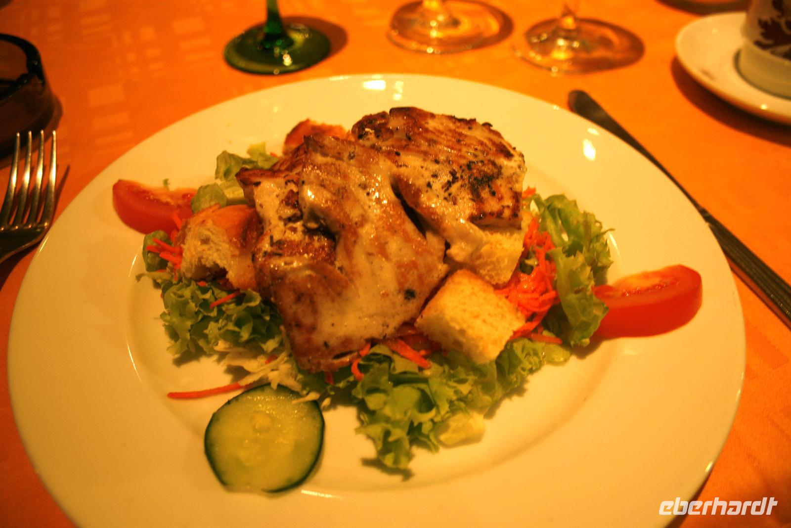 Um 19.00 Uhr treffen wir uns in der Lobby, um zum Restaurant „Pipi’s Bar“ in Sao Filipe zu spazieren. Hier haben wir heute unser Abendessen reserviert. So lernen wir auch die einheimische Küche und das einheimische Nachtleben kennen. Heute ist der 25. Dezember und damit Feiertag auf den Kapverden. Auf einem Platz oberhalb der Küste findet ein großes Fest statt, auf dem sich ganz Sao Filipe trifft. Es gibt Musik, kleine Bars und manche grillen vor Ort. Alles ist voller Menschen, auch viele Kinder, die sich hier treffen und gemeinsam feiern. Wir gehen einmal hindurch durch das Getümmel und wieder stadteinwärts bis zum Restaurant. Hier ist auf der Terrasse draußen schon ein Tisch für uns vorbereitet. Wir bestellen Getränke und einige Minuten später wird das Essen „aufgefahren“. Es gibt gegrilltes Hühnchen, Fischfilets, Reis, Pommes, Gemüsesalat und gekochtes Gemüse mit Zwiebel- oder Erdnusssoße. Alles schmeckt sehr lecker und wir genießen den Abend. Wir sind gegen 22.00 Uhr zurück im Hotel und wünschen eine gute Nacht.