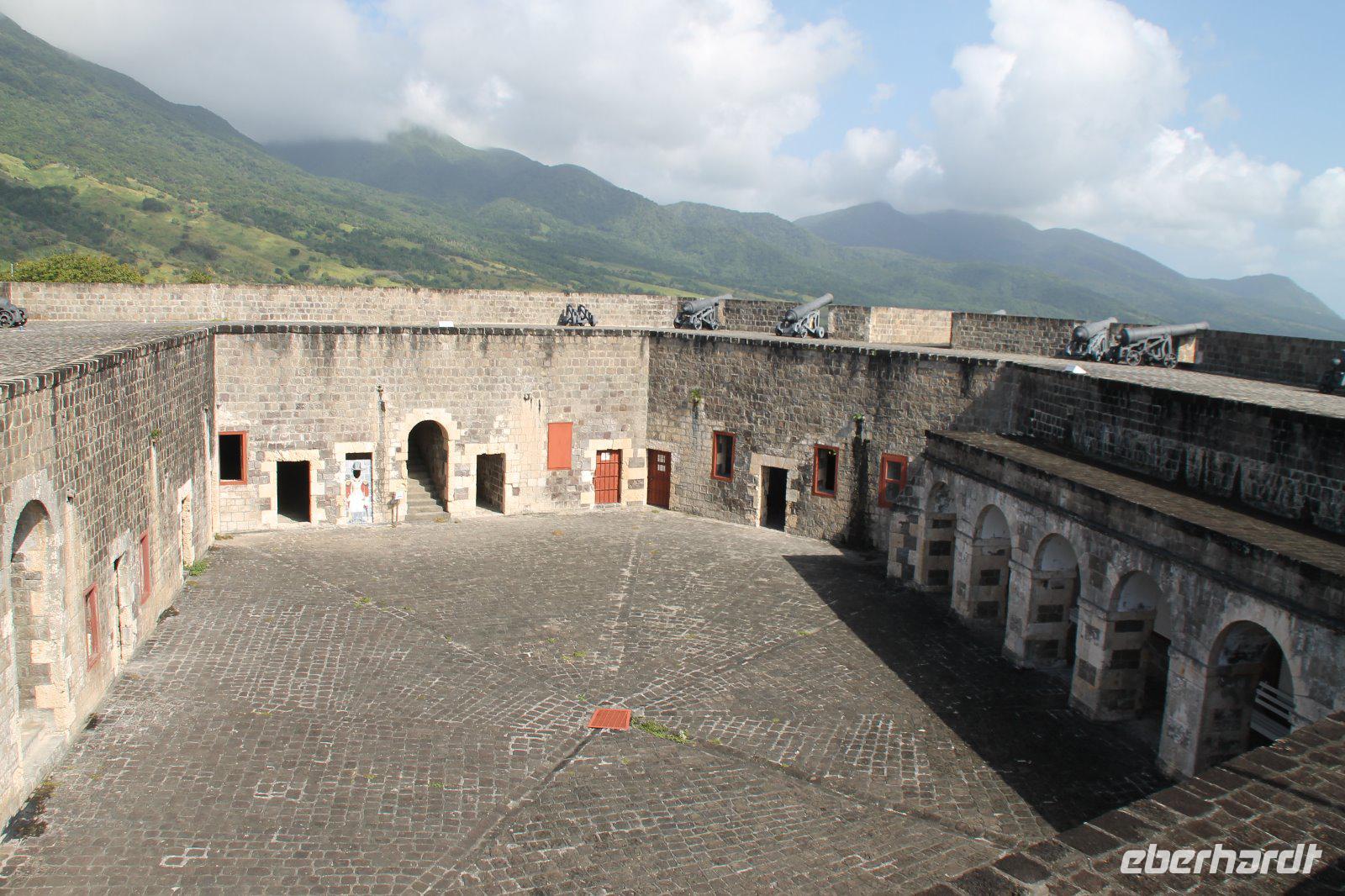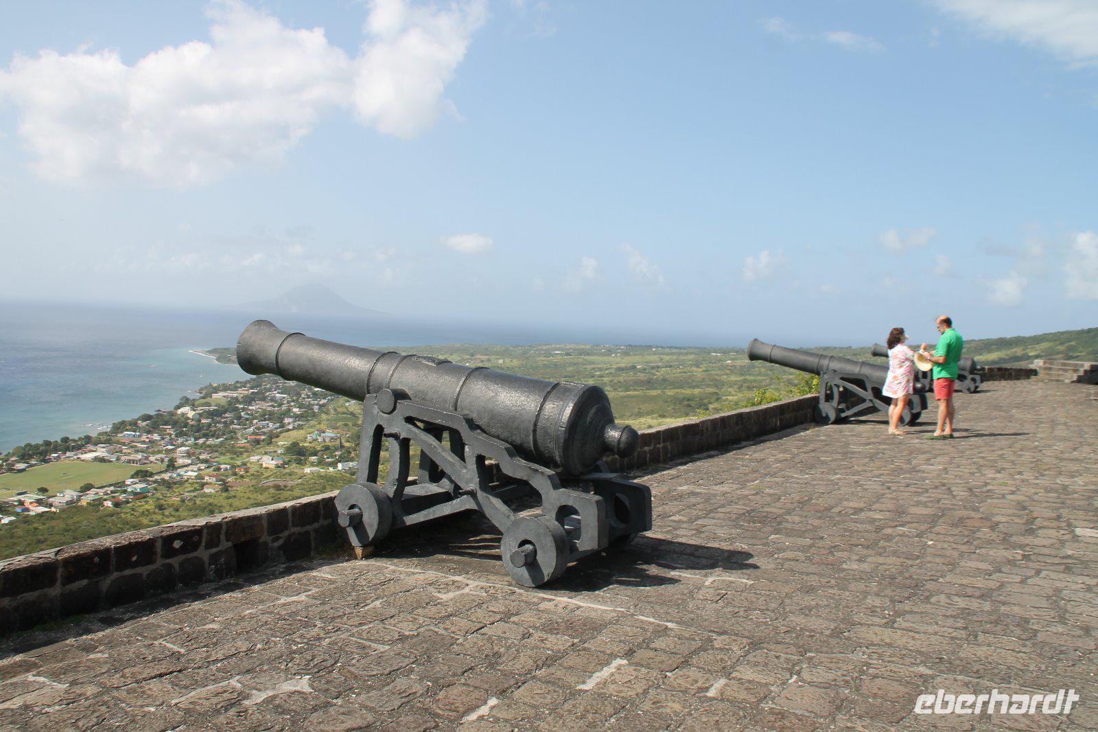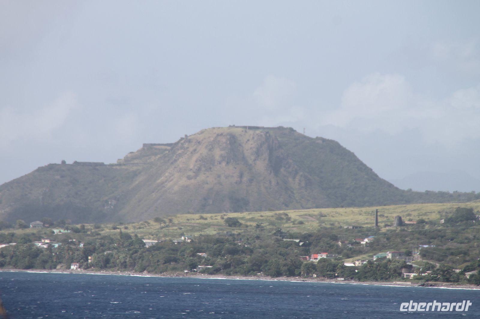 Heute genießen wir die etwas spätere Ankunft im Hafen und verbringen einen entspannten Vormittag an Bord, bevor wir in Basseterre auf der Insel St. Kitts an Land gehen. Einige Gäste haben auch heute wieder verschiedene Ausflüge gebucht, einige wollen nur zu einem Strand fahren und einige unternehmen mit mir eine kleine Inselrundfahrt mit dem Besuch der größten Festungsanlage von den karibischen Antillen - Brimstone Hill. Am Hafen verhandeln wir mit verschiedenen Taxi- und Kleinbusfahrern eine Tagestour für 20$ pro Person aus. Wir fahren etwas 15min. aus der Hauptstadt heraus zu einem kleinen Aussichtspunkt mit einem ersten Blick auf Brimstone Hill. Schon von weitem können wir die gigantischen Ausmaße der Festungsanlage erahnen. Kurze Zeit später fahren wir den Berg hinauf und besichtigen auf eigene Faust die gut erhaltenen Ruinen und Festungsmauern. Gut eine Stunde schauen wir uns alles von innen und außen an. Wie wir erfahren, gab im 18. Jahrhundert eine große Belagerungsschlacht der Franzosen gegen die Briten, bei der die Franzosen über 30 Kriegsschiffe verloren und den größten Teil ihrer Armee einbüßten. Nach einem Monat der Belagerung konnten die Briten vertrieben werden, doch bereits ein Jahr später wurde die Insel wieder an England zurück gegeben, aufgrund eines Abkommens in Paris. Nach der geschichtlichen Zeitreise fahren wir auf den holprigen Straßen zurück in Richtung Basseterre. Vorbei geht es am internationalen Flughafen, einer ehemaligen Zuckerrohrfabrik und an einem mondänen Golfplatz der Schönen und Reichen an der Südwestküste der Insel. Zum Abschluss genießen wir einen Pina Colada oder Rum Punsch in einer Beachbar mit Blick auf das Meer. Besonders lustig sind hier die sog. Grünmeerkatzen anzusehen - eine Affenart der Karibik. Wieder am Hafen angekommen bleibt uns noch ein wenig Zeit die Souvenirläden zu durchstöbern bevor es wieder heißt: Leinen los - auf nach Antigua!