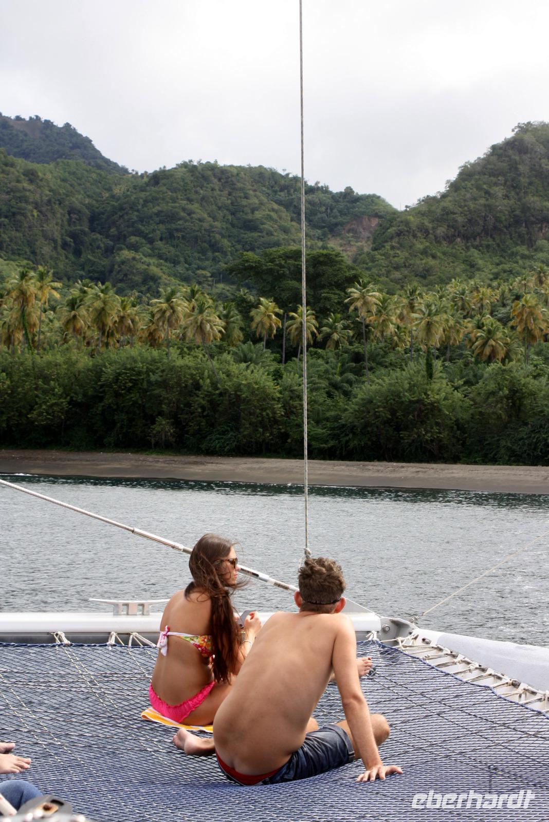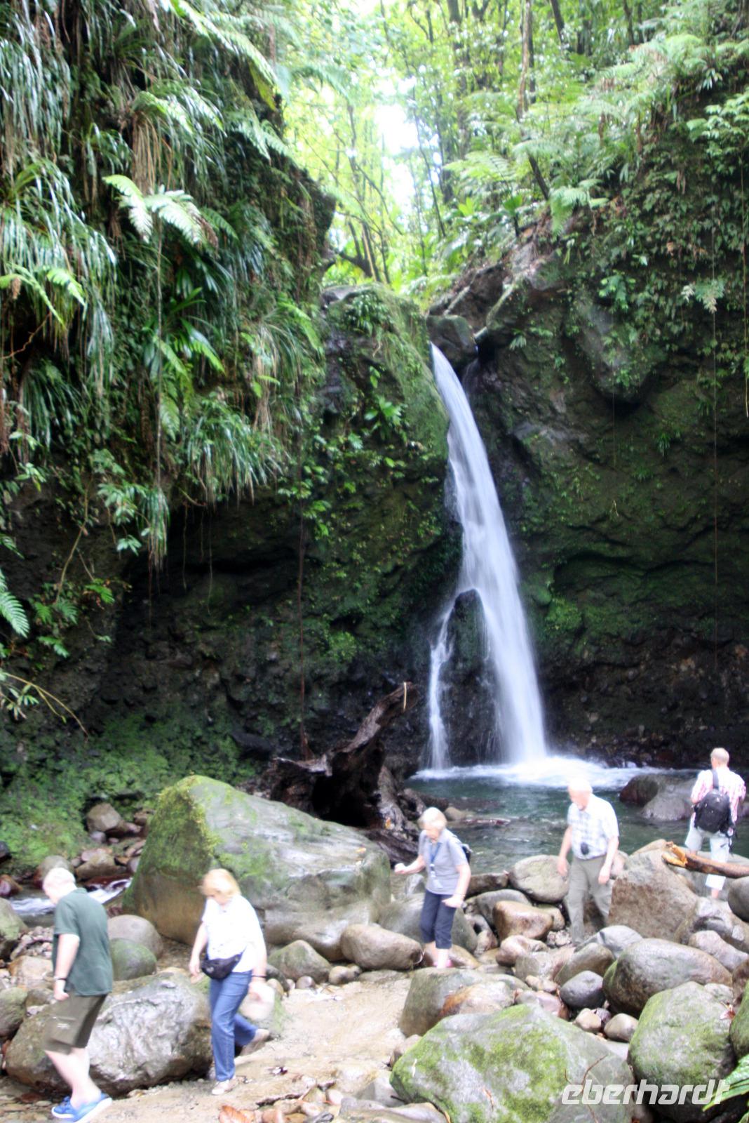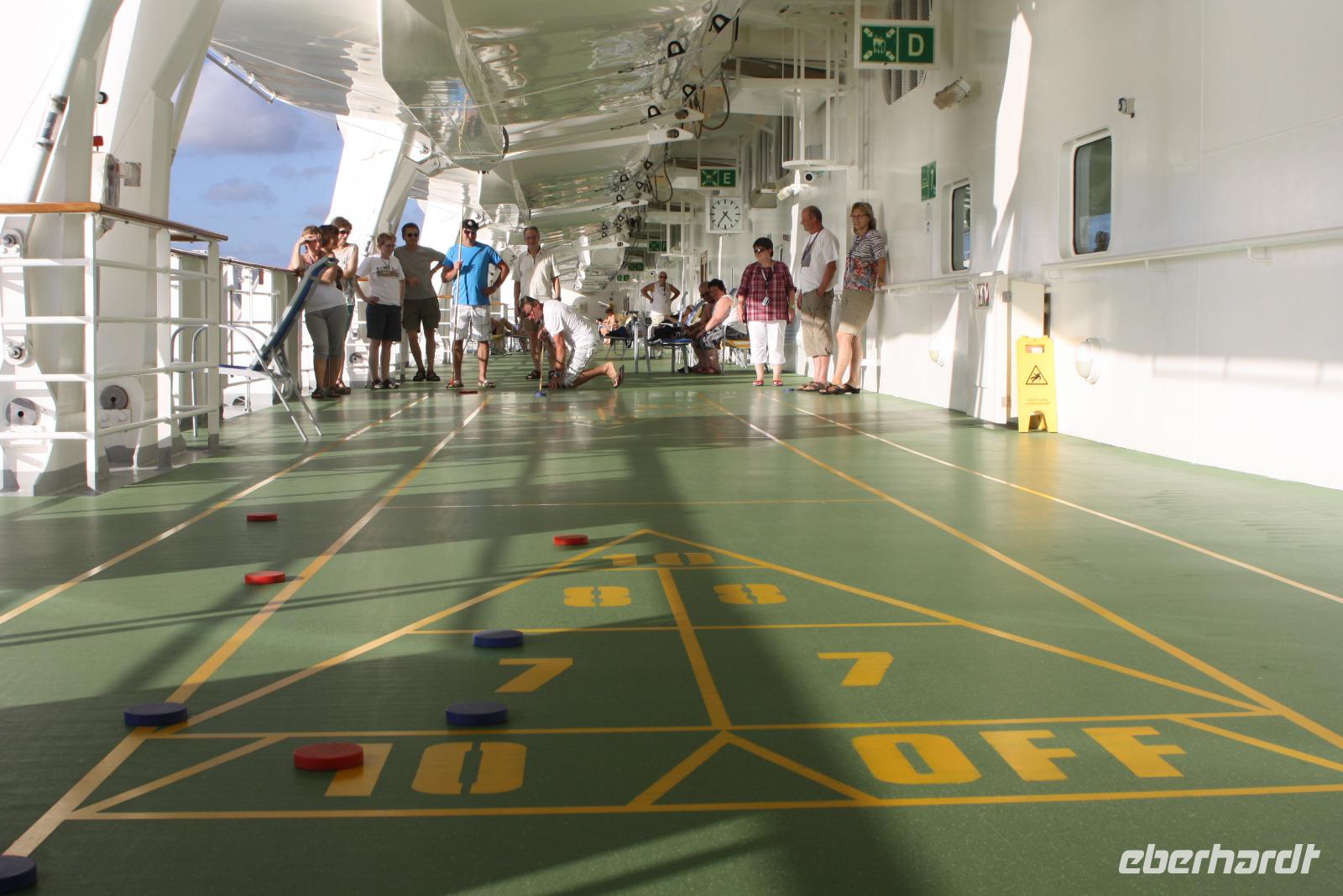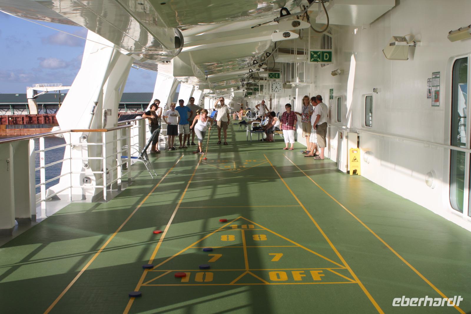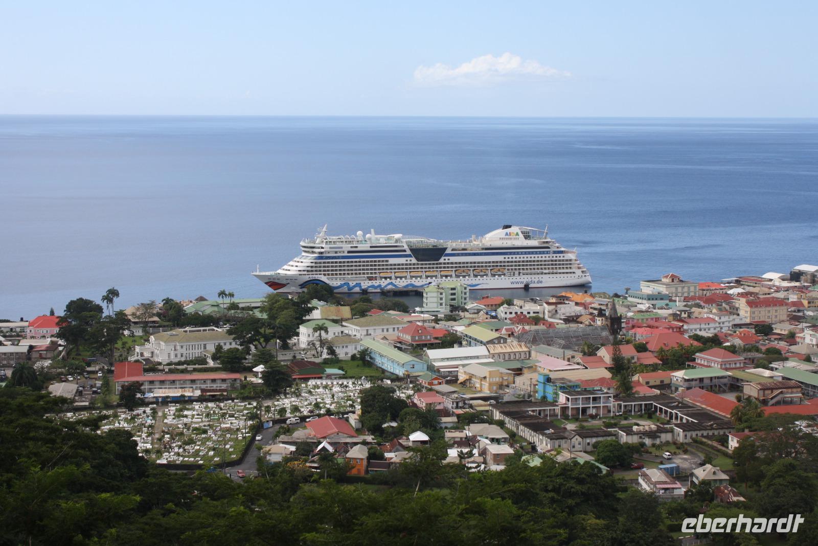 Die kleine Vulkaninsel Dominica geizt nicht mit ihren Reizen: üppig grüner Regenwald, tropische Früchte und farbenfrohe karibische Häuschen. Den Namen erhielt die Insel von dem spanischen Wort „Domingo" (Sonntag), da Kolumbus an einem Sonntag die Insel entdeckte. Ein Teil der Reisegruppe begibt sich mit mir auf den Ausflug „Panoramafahrt für Jedermann". Da heute ausschließlich Englisch sprechende Reiseleiter zur Verfügung stehen, übersetze ich wieder einmal nicht nur für unsere Eberhardt-Gäste - der ganze Bus ist wohl froh darüber. Vom Hafen in Roseau windet sich die Straße hinauf in den Regenwald, wo wir die Hibiskus-Wasserfälle mitten in der grünen Umgebung bestaunen. Eine Kostprobe tropischer Früchte und Rumpunsch steht ebenfalls bereit. Im Botanischen Garten von Roseau entdecken wir neben Pflanzen aus aller Welt auch die flinken Kolibris und Papageien. Abschließend fahren wir noch auf „Morne Bruce", den Hausberg von Roseau, und haben so eine tolle Aussicht auf die Inselhaupstadt. Am Nachmittag lade ich zum Eberhardt-Shuffleboard-Turnier ein - es ist der älteste Schiffssport und bringt jede Menge Spaß! Schließlich erwarten uns die Offiziere der AIDA diva zum Offiziers-Shaken auf dem Pooldeck. So ein kleiner Apero vor dem Abendessen kann ja nicht schaden. Und danach wird es spannend bei "Wer wird Millionär" im Theatrium.