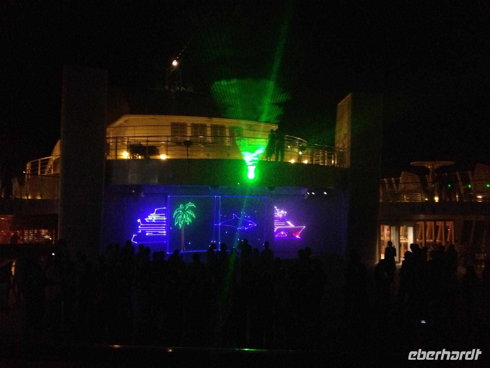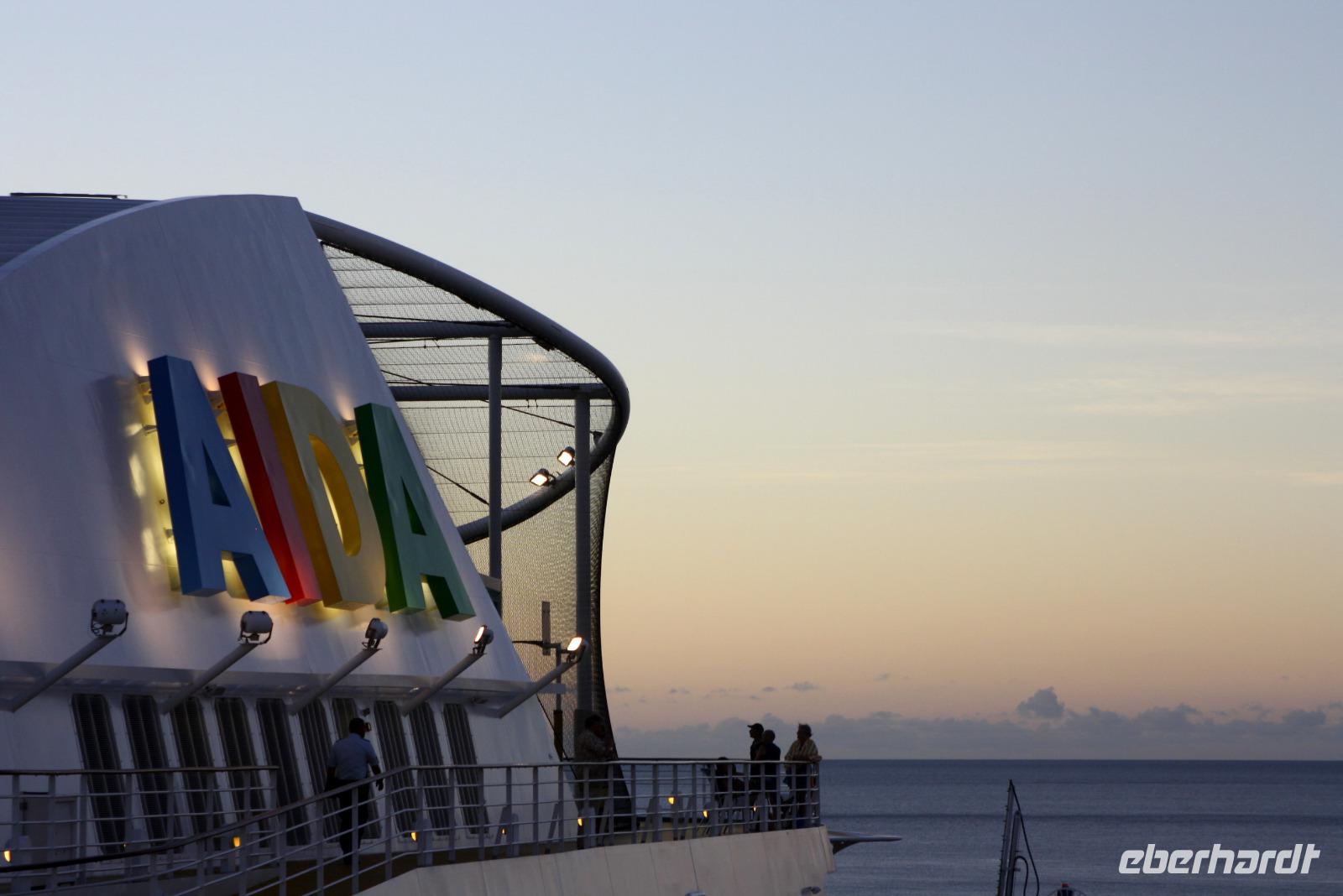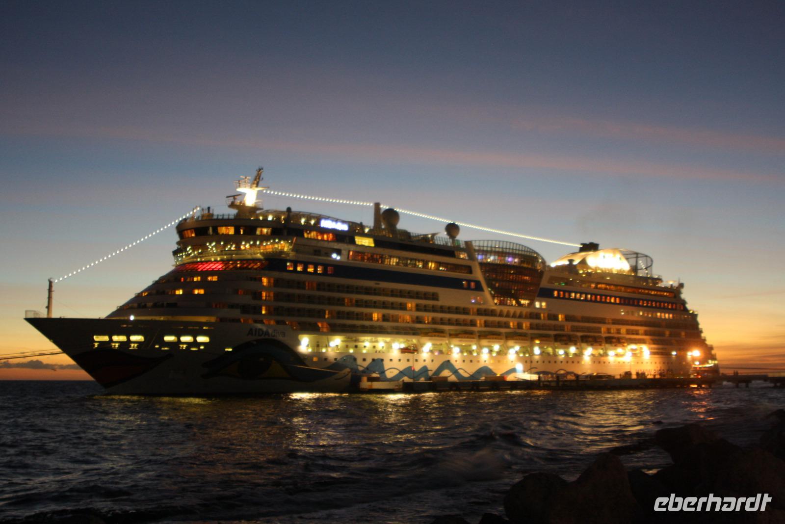 Der Vormittag steht uns zur freien Verfügung, um die Annehmlichkeiten unseres 5-Sterne-Hotels zu genießen: ausgiebig frühstücken, entspannen am Pool oder ab zum Strand! Schließlich geht es gegen Mittag zum Hafen von La Romana, wo wir mit dem schönsten Lächeln auf den Weltmeeren empfangen werden. Nach dem Check In beziehen wir unsere komfortablen Kabinen. Ein Glück, unsere Koffer werden bequem vor die Kabine geliefert, so dass wir uns auf eine erste Erkundungstour begeben können. Mit Treffpunkt in der AIDA Bar nehme ich unsere Eberhardt-Gäste mit zum Schiffsrundgang, um unser schwimmendes Hotel besser kennenzulernen: Restaurants, Bars, Shops, Sport und Wellness, Pooldeck, Theatrium und vieles mehr. Am Abend ist natürlich das wichtigste Ziel das Buffet-Restaurant, wo wir eine riesige Auswahl an Leckereien vorfinden. Um 20.00 Uhr steht nun das einzige Pflichprogramm der Reise auf dem Plan, die Seenotrettungsübung, und bald darauf heißt es schließlich "Leinen los!" und "Sail away!". General Manager Clemens Spangler, Entertainment Manager Martin Bechtel sowie das Barteam begrüßen uns später mit einem Gläschen Sekt - mit einer Lasershow und Poolparty starten wir auf eine fantastische Kreuzfahrt!