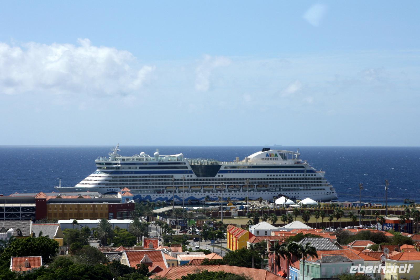 Curacao ist die größte Insel der früheren Niederländischen Antillen und mit ca. 15.0000 Inselbewohnern auch die belebteste der ABC-Inseln. Wie in Holland fühlt man sich mitten in der Karibik in Curacaos Hauptstadt Willemstad mit den farbenprächtigen, stuckverzierten Giebelhäusern. Von den AIDA-Scouts werden wieder verschiedene Ausflüge angeboten, die unsere Reisegäste gern annehmen. Einige entdecken die Unterwasserwelt per U-Boot, andere absolvieren das volle Inselprogramm mit dem Chobolobo Landhaus, wo eine Kostprobe des berühmten Blue Curacao auf dem Programm steht, mit dem Spanish Harbour und dem Maritimen Museum, dem Kunuku-Museum (hier erfahren wir viel Wissenswertes zur Geschichte der Sklaverei und zum Leben in früherer Zeit) sowie den Salinen mit den Flamingos. Natürlich darf ein Spaziergang durch die Hauptstadt Willemstad nicht fehlen, die nicht umsonst den Beinamen „das kleine Amsterdam" trägt. Das farbenfrohe Zentrum gehört zum UNESCO-Kulturerbe und kann über die Königin-Emma-Brücke, die charakteristische Pontonbrücke, erreicht werden - sofern sie nicht für den Schiffsverkehr geöffnet ist - dann pendeln die Fähren zwischen den Stadtteilen Otrabanda und Punda. Im Abendlicht wirken die pastellfarbenen Fassaden besonders malerisch und im Sonnenuntergang spazieren wir durch das Fort Amsterdam zurück zum Schiff.