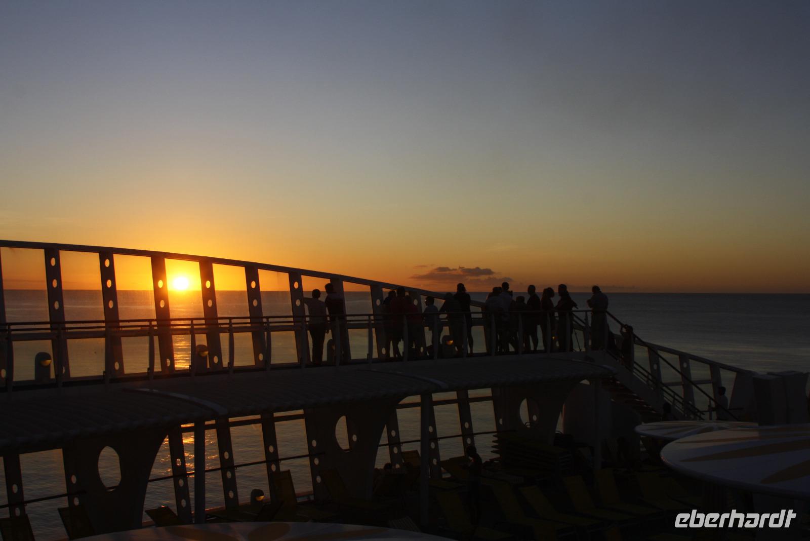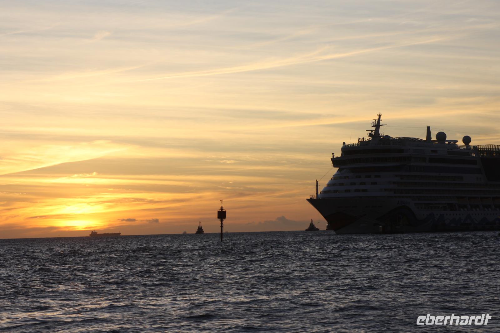 Alle Frühaufsteher können bereits 07.13 Uhr den Sonnenaufgang erleben und langsam erwacht auch das Leben an Bord. Der Tag beginnt mit einem herrlichen Frühstück und Sonnenschein. Bei der Ausflugspräsentation für für die ABC-Inseln können wir uns über die Landausflüge in unseren ersten Häfen informieren. Anschließend lädt Eberhardt TRAVEL zum Sektempfang in die AIDA Bar ein - noch einmal die Gelegenheit, auf eine wunderschöne Reise anzustoßen. Prost! Sogar Kapitän Nikos Nitschai gibt sich die Ehre und schaut bei uns vorbei - wir lassen ihn aber nicht gehen, ohne ein Gruppenfoto gemacht zu haben! Nach dem Mittagessen geht es je nach gusto entspannt oder aktiv weiter. Die AIDA Crew bietet am Seetag viele Aktivitäten an: ob Lesung, Tanzkurs, Workshop oder Volleyball, ich bin sicher, jeder hat seinen Lieblingsplatz an Bord schon gefunden. In Martins Prime Time sehen wir am Abend unseren Kapitän wieder und erfahren interessante Geschichten aus dem Leben des ersten Mannes an Bord. Im Anschluss bringt Comedy-Talent Benni Stark im Theatrium unsere Lachmuskeln in Schwung.
