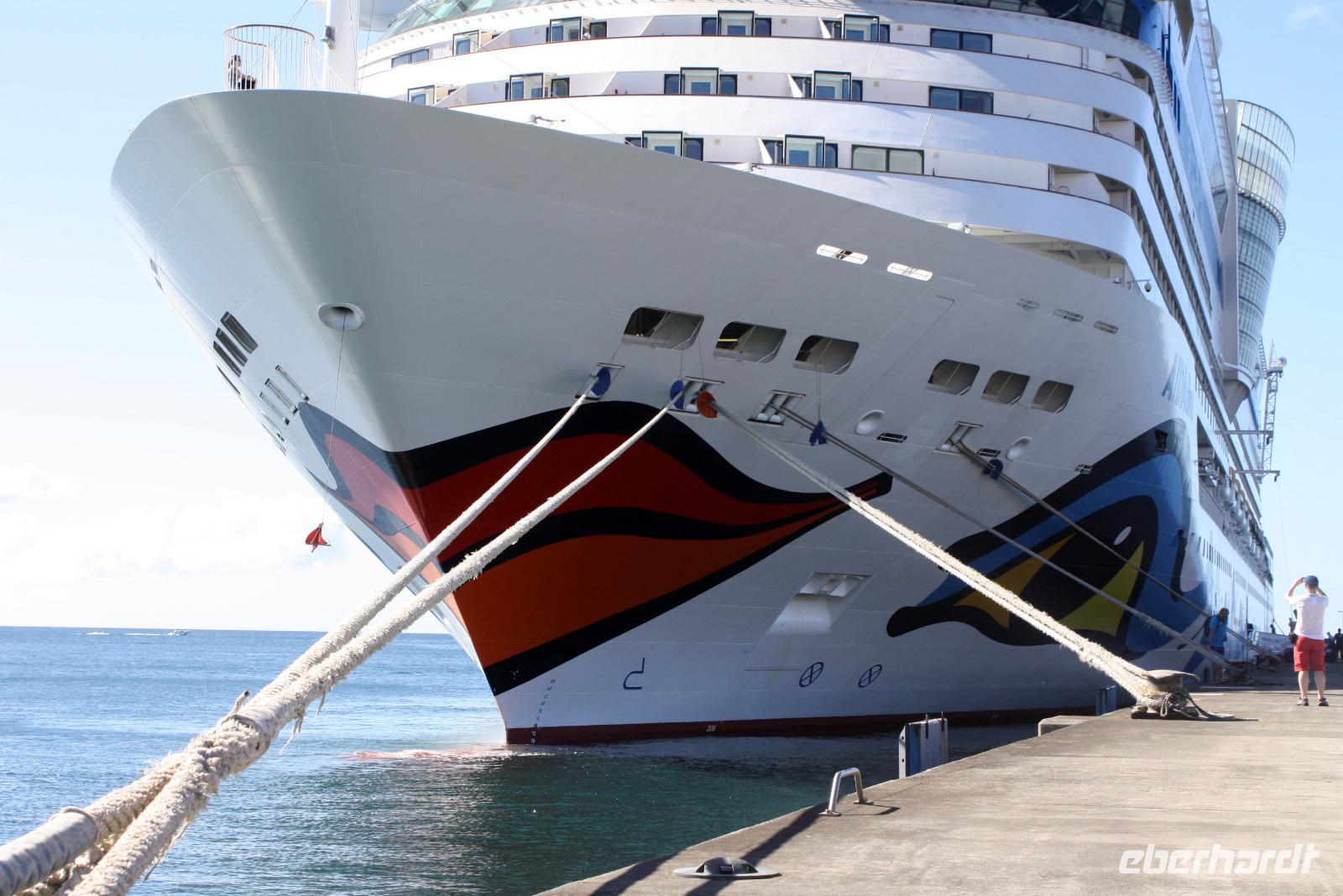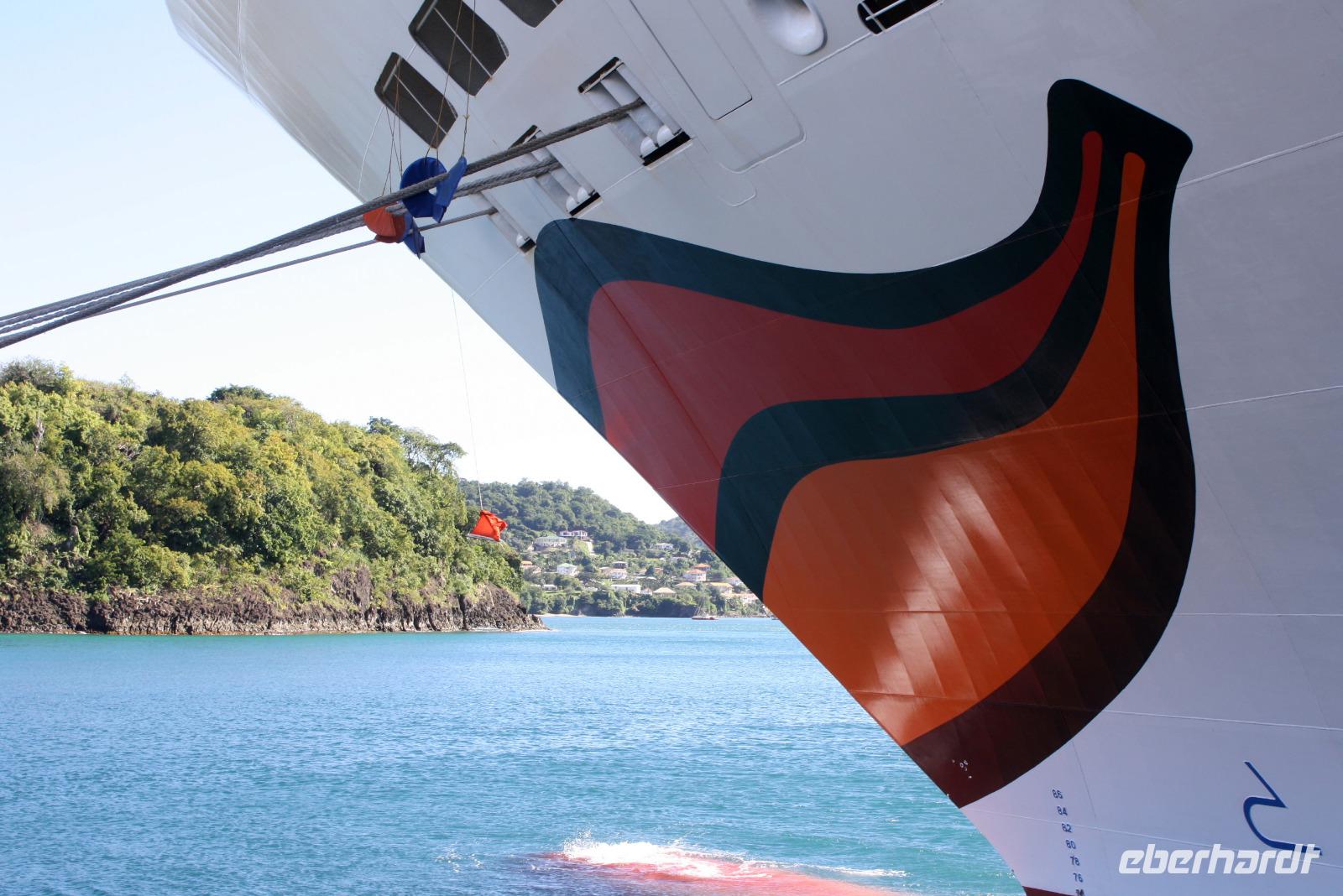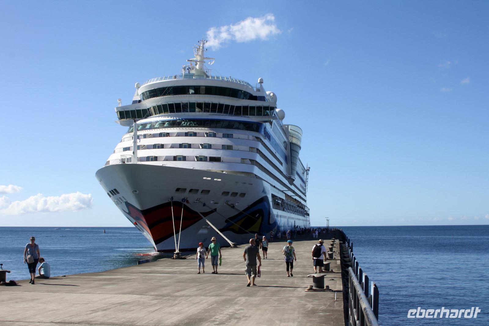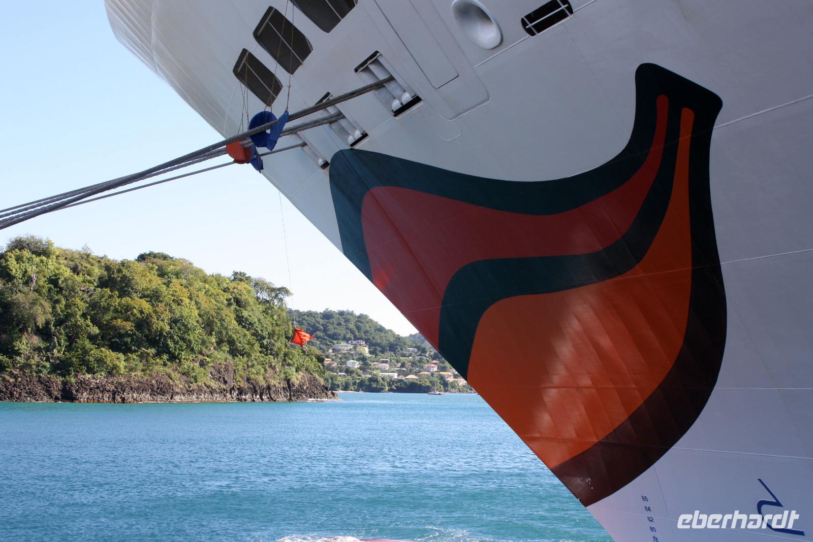 Neuer Morgen - neue Insel. Heute steht wieder einmal ein exklusiver Eberhardt-Ausflug auf dem Programm. Unser örtlicher Reiseleiter erwartete uns bereits an der Pier, um uns seine Wahlheimat näher zu bringen. Der erste Fotostopp bietet uns einen Blick auf Castries und den Hafen, wo unsere AIDA diva lächelt. Der nächste Stopp heißt Marigot Bay, bekannt durch den Film Dr. Doolittle - es ist eine der wohl meist fotografierten Buchten der Karibik! In einer kleinen Bäckerei bekommen wir eine leckere Kostprobe des süßen Gebäcks und auch die exotischen Früchte der Karibik werden genau begutachtet. Die Wahrzeichen von St. Lucia sind die Pitons: die großen grünen Kegel, die auch zum UNESCO Weltnaturerbe gehören, bieten ein tolles Fotomotiv. Haben Sie schon mal etwas von einem "Drive Inn Vulkan" gehört? Auf St. Lucia gibt es ihn! Bei den Sulphur Springs kann man die vulkanischen Aktivitäten sehen und riechen. Wir wollen die Insel aber nicht nur zu Land, sondern auch auf und im Wasser erleben. Somit geht es im Hafen von Soufriere (mit etwas Verspätung) auf ein Motorboot. Das kreolische Mittagessen ist zwar eine etwas wackelige Angelegenheit, aber durchaus schmackhaft. Dann beginnt unsere Seefahrt entlang der Westküste mit Blick auf die üppig grüne Landschaft, kleine Villen und malerische Buchten. Zwischendurch legen wir eine Badepause ein, die einige auch nutzen, um die Unterwasserwelt St. Lucias per Schnorchel kennenzulernen. Nach einem seeseitigen Abstecher in die Marigot Bay - welch eine tolle Kulisse - schippern wir mit Rumpunsch "bewaffnet" langsam aber sicher in Richtung AIDA zurück. Wieder am Hafen angekommen, verabschiedeten wir uns von der Crew und lassen beim gemeinsamen Abendessen den erlebnisreichen Tag Revue passieren. Im Theatrium begeistert uns heute noch einmal Comedian Benni Stark - ein echter Angriff auf die Lachmuskeln.