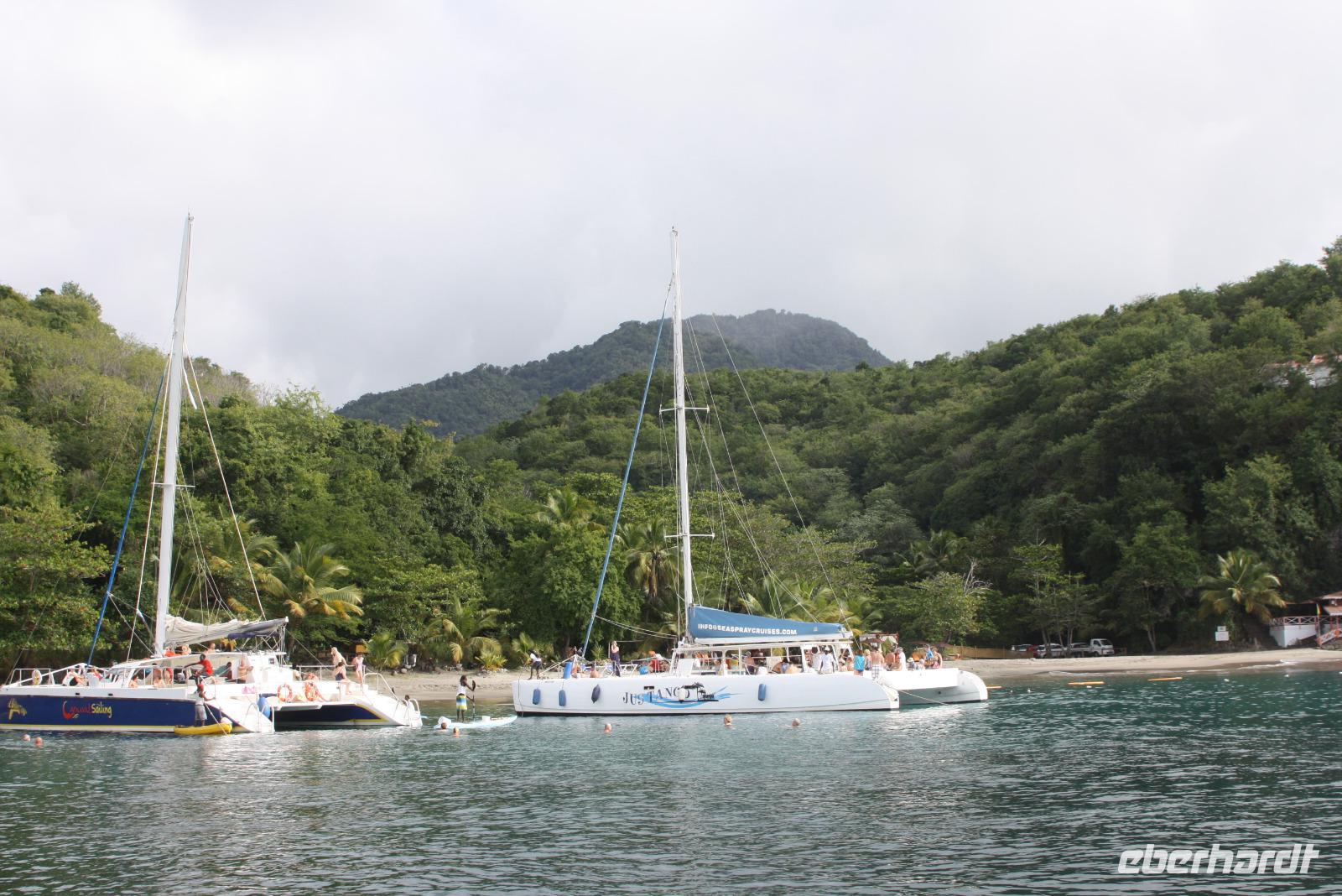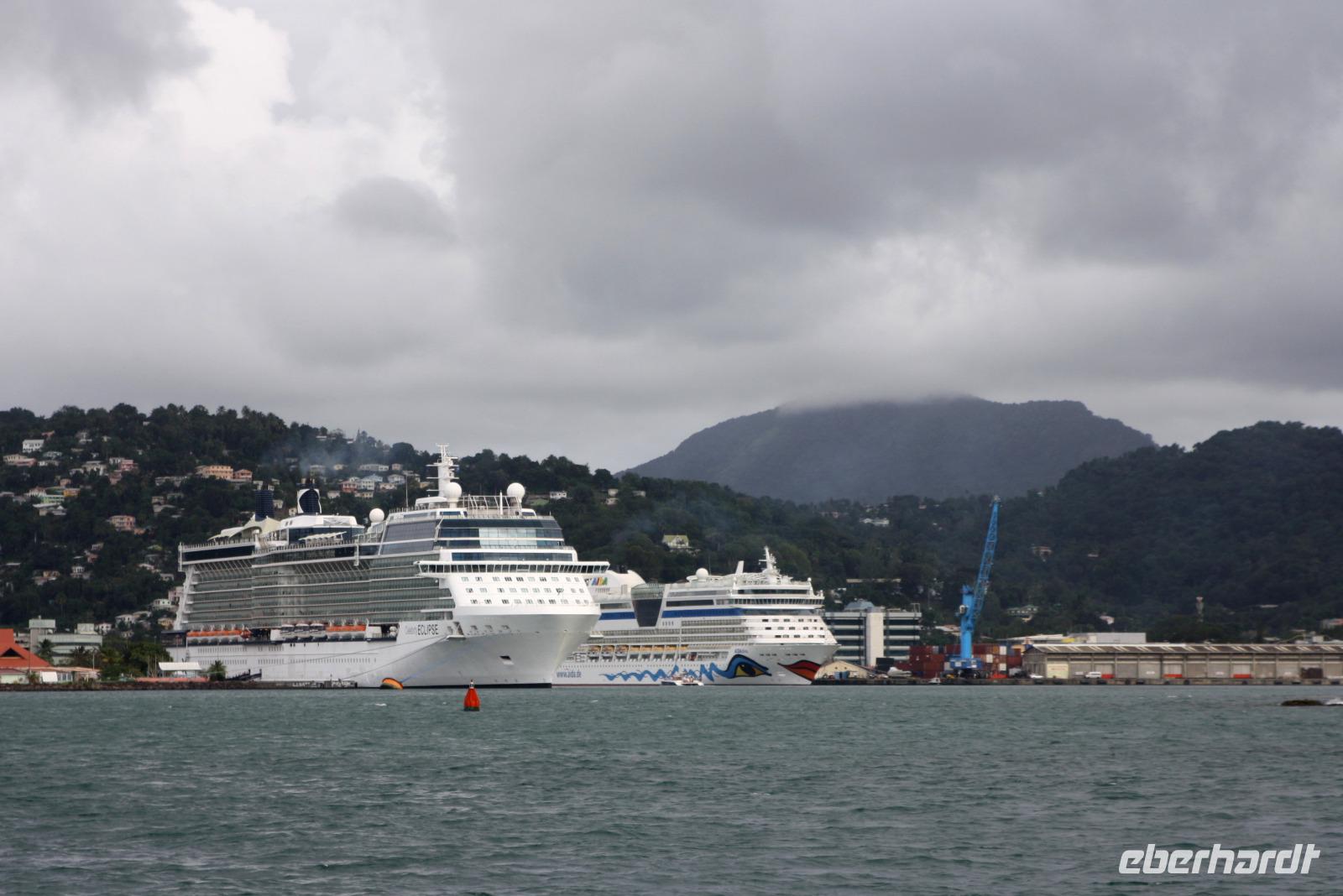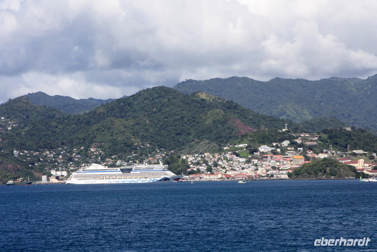 Neuer Morgen - neue Insel. Heute steht wieder einmal ein exklusiver Eberhardt-Ausflug auf dem Programm. Unser örtlicher Reiseleiter erwartete uns bereits an der Pier, um uns seine Wahlheimat näher zu bringen. Der erste Fotostopp bietet uns einen Blick auf Castries und den Hafen, wo unsere AIDA diva lächelt. Der nächste Stopp heißt Marigot Bay, bekannt durch den Film Dr. Doolittle - es ist eine der wohl meist fotografierten Buchten der Karibik! In einer kleinen Bäckerei bekommen wir eine leckere Kostprobe des süßen Gebäcks und auch die exotischen Früchte der Karibik werden genau begutachtet. Die Wahrzeichen von St. Lucia sind die Pitons: die großen grünen Kegel, die auch zum UNESCO Weltnaturerbe gehören, bieten ein tolles Fotomotiv. Haben Sie schon mal etwas von einem "Drive Inn Vulkan" gehört? Auf St. Lucia gibt es ihn! Bei den Sulphur Springs kann man die vulkanischen Aktivitäten sehen und riechen. Wir wollen die Insel aber nicht nur zu Land, sondern auch auf und im Wasser erleben. Somit geht es im Hafen von Soufriere (mit etwas Verspätung) auf ein Motorboot. Das kreolische Mittagessen ist zwar eine etwas wackelige Angelegenheit, aber durchaus schmackhaft. Dann beginnt unsere Seefahrt entlang der Westküste mit Blick auf die üppig grüne Landschaft, kleine Villen und malerische Buchten. Zwischendurch legen wir eine Badepause ein, die einige auch nutzen, um die Unterwasserwelt St. Lucias per Schnorchel kennenzulernen. Nach einem seeseitigen Abstecher in die Marigot Bay - welch eine tolle Kulisse - schippern wir mit Rumpunsch "bewaffnet" langsam aber sicher in Richtung AIDA zurück. Wieder am Hafen angekommen, verabschiedeten wir uns von der Crew und lassen beim gemeinsamen Abendessen den erlebnisreichen Tag Revue passieren. Im Theatrium begeistert uns heute noch einmal Comedian Benni Stark - ein echter Angriff auf die Lachmuskeln.