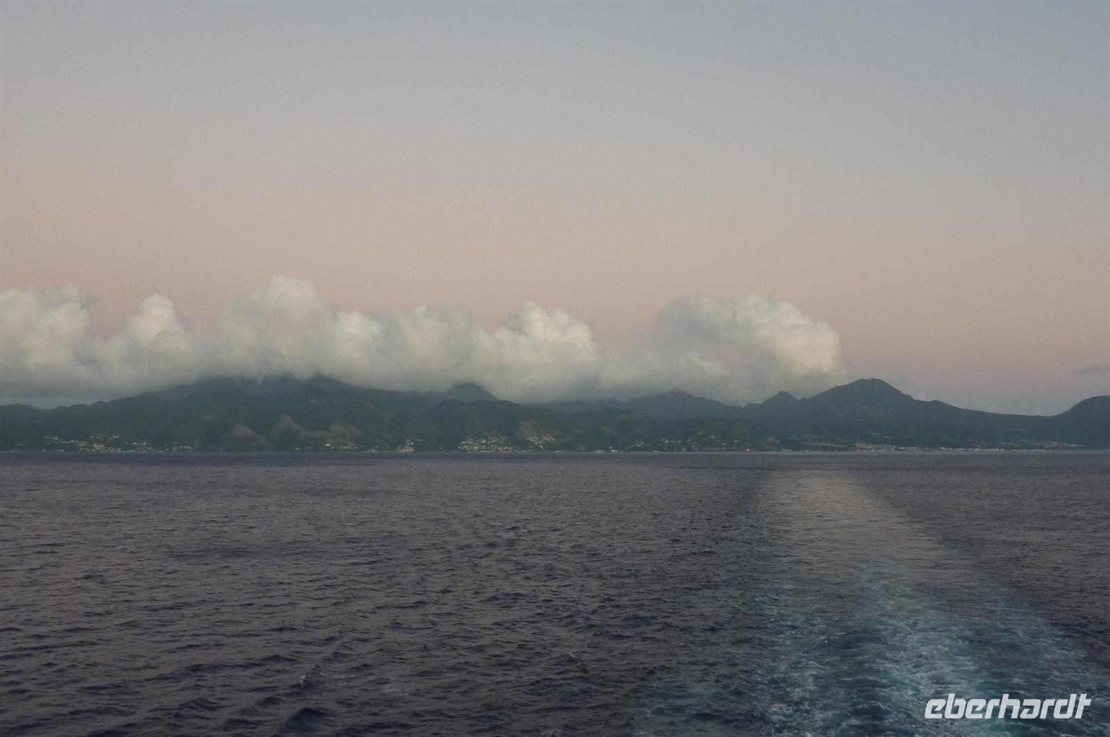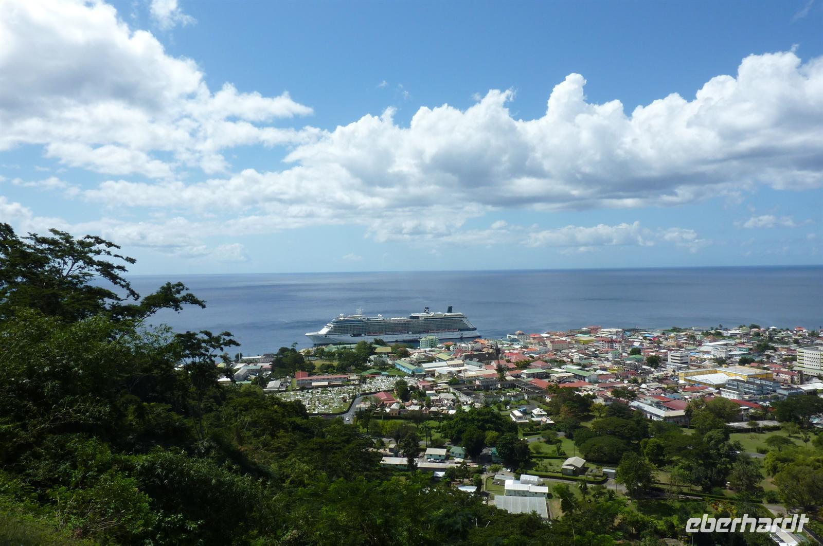Karibik bevor wir zurück nach La Romana schippern. Die kleine Vulkaninsel Dominica geizt nicht mit ihren Reizen: üppig grüner Regenwald, tropische Früchte und farbenfrohe karibische Häuschen. Wir dürfen wieder als erste Gäste von Bord und "entern" den Bus der Tour 01. Da heute ausschließlich Englisch sprechende Reiseleiter zur Verfügung stehen, übersetze ich nicht nur für unsere Eberhardt-Gäste - der ganze Bus ist wohl froh darüber. Vom Hafen in Roseau windet sich die Straße hinauf in den Regenwald, wo unsere kurze Wanderung zu den Emerald Pools beginnt. Am Ziel finden wir einen malerischen Wasserfall und einen Pool mit glasklarem Wasser mitten in der grünen Umgebung. Im Anschluss machen wir eine Erfrischungspause mit Rumpunsch oder einem kühlen Softgetränk, bevor es weiter geht zu den höchsten Wasserfällen der Insel.Wiederum führt uns ein Pfad mitten durch den Regenwald über viele Stufen zur Aussichtsplattform. Abschließend fahren wir noch auf den Hausberg von Roseau und haben so eine tolle Aussicht auf die Inselhaupstadt. Am Nachmittag erwarten uns die Offiziere der AIDAvita zum Offiziers-Shaken auf dem Pooldeck. So ein kleiner Apero vor dem Abendessen kann ja nicht schaden .