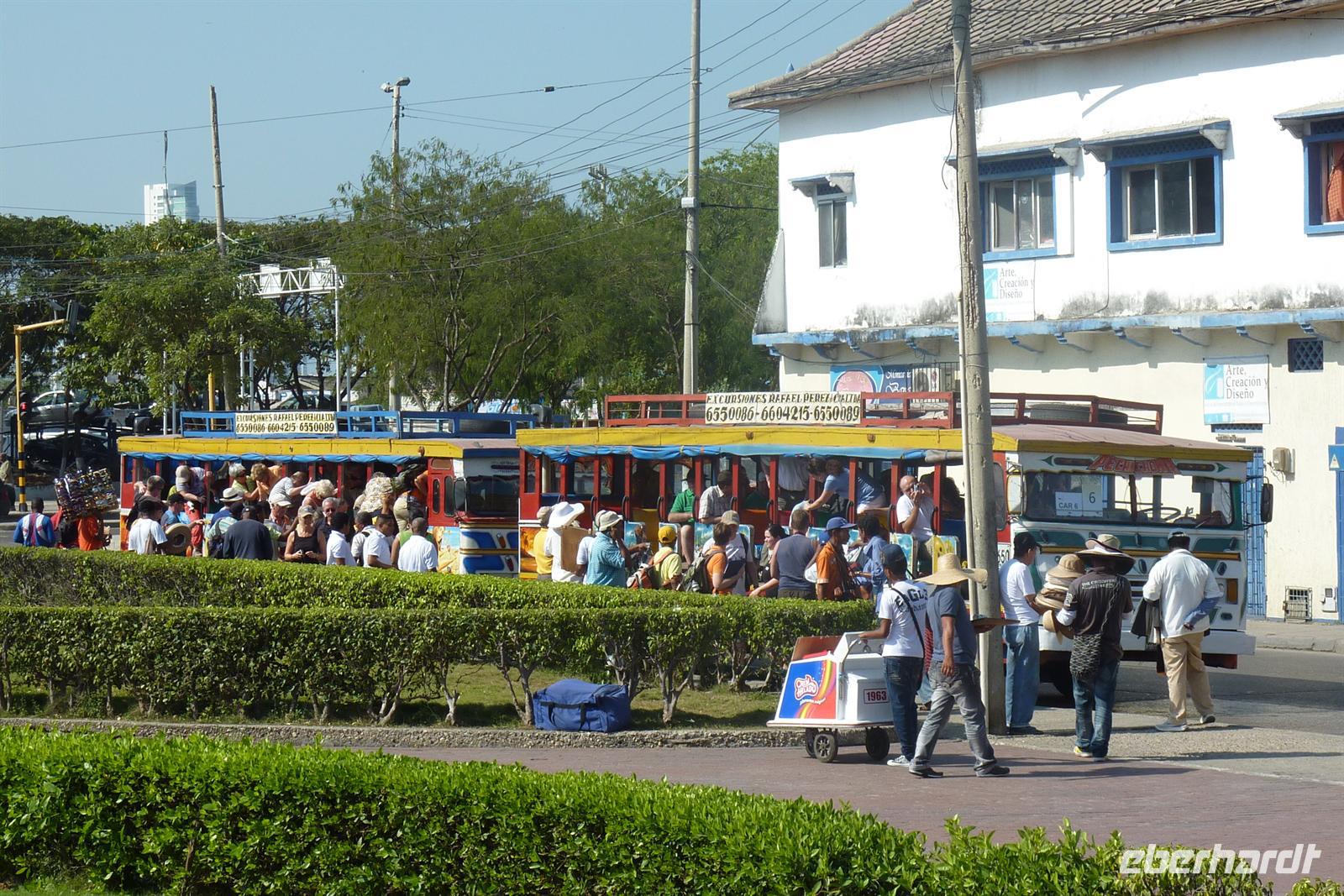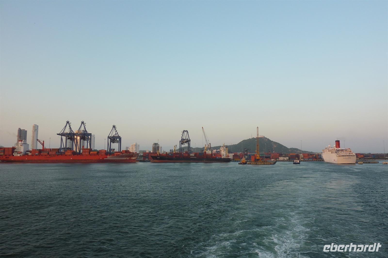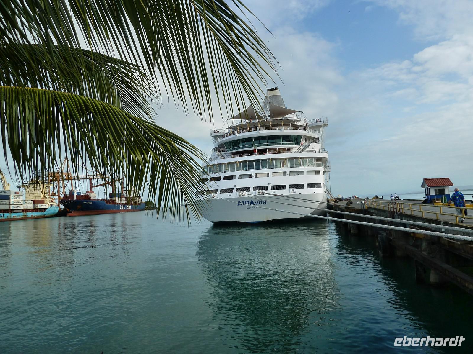 Cartagena gehört zweifelsohne zu einem der Höhepunkte unserer Reise. Die ?schönste Stadt Mittelamerikas? soll es sein und wir können dem nur zustimmen. Der Großteil der Gruppe entscheidet sich für den AIDA-Ausflug "Typisch Cartagena" wobei wir im landestypischen Chiva-Bus eine Stadtrundfahrt unternehmen. Wir dürfen bereits als erste Gruppe zu den Bussen, wo uns unser Deutsch sprechender Reiseleiter Cesar begrüßt. Sitzplätze in den ersten Reihen für unsere Eberhardt-Gäste - perfekt, es kann los gehen! Trotz dem Samstag ist, herrscht reges Treiben auf den Straßen. Zunächst führt uns die Tour auf den Hausberg der Stadt zum Kloster der Jungfrau Candelaria. Von hier bietet sich ein fantastisches Panorama auf die gesamte Stadt und den Hafen, wo auch unsere AIDAvita liegt. Im malerischen Innenhof des Klosters leuchten Bouganvilla und auf dem Platz bieten fliegende Händler ihre Waren an. Anschließend fahren wir zum Fort San Felipe de Barajas. Die kolumbianische Flagge weht stolz am Mast und wir werden mit Trompeten-Musik eines Straßenkünstlers begrüßt. In den Souvenirläden des ehemaligen Munitionslagers herrscht rege Betriebsamkeit, denn es liegen gleich drei Kreuzfahrtschiffe im Hafen von Cartagena. Nach diesem Trubel tut die Erfrischungspause auf der Terrasse des "Café del Mar" besonders gut - garniert mit lateinamerikanischer Musik und Tänzen! Nun möchten wir endlich die malerische Altstadt entdecken. Bei einem Spaziergang durch die engen Gassen und über die schönen Plätze bestaunen wir die hübschen Fassaden mit ihren schmucken Balkonen. Nach dem Besuch der Jesuitenkirche San Pedro Claver haben wir etwas Freizeit, um die Stadt auf eigene Faust zu entdecken. Zum Mittagessen sind wir zurück am Hafen und zurück an Bord. Das "Sail away" aus Cartagena lässt sich am besten bei einem Sundowner an der schönen Ocean Bar auf Deck 7 genießen. Die Skyline der Neustadt verschwindet langsam am Horizont und die Sonne taucht als glutroter Feuerball ins Meer. Beim Abendessen ist leichter Seegang zu spüren, aber so lässt es sich später leichter zur Poolparty schunkeln. Die legendären "Schlagertörtchen" spielen live und in Farbe - es darf getanzt werden!
