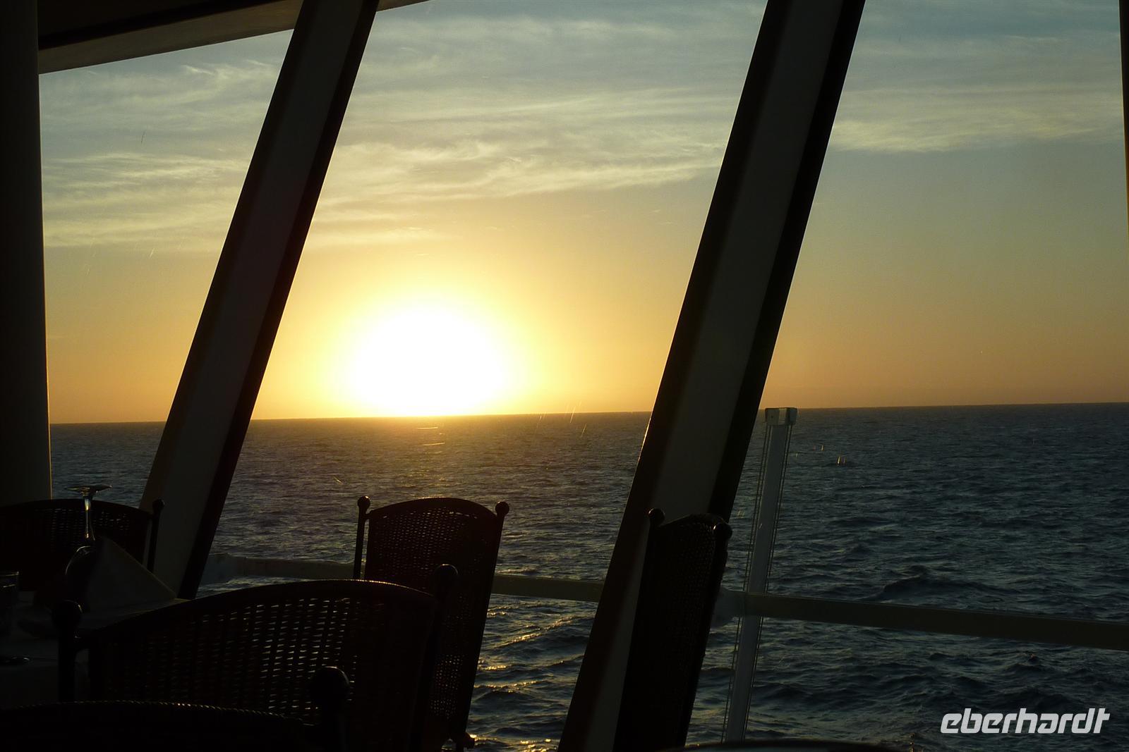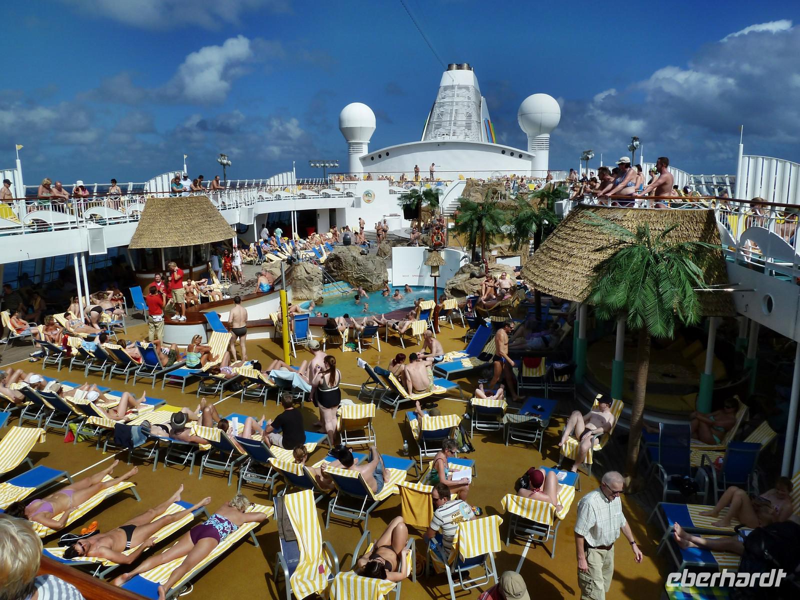 Mittlerweile hat jeder seinen persönlichen Lieblingsplatz an Bord gefunden. Bei ruhiger See und Sonnenschein bedeutet ein Seetag auf AIDAvita Erholung pur. Auf dem Pooldeck gibt es Unterhaltung durch das Entertainment-Team oder wer es etwas ruhiger mag, zieht sich in die Hemingway-Lounge zurück. Fast rund um die Uhr werden wir mit kulinarischen Köstlichkeiten verwöhnt ? da ist wohl für jeden Geschmack etwas dabei. Spiel und Spaß gibt es beim Bingo am Abend ? es ist die beliebteste Ballsportart an Bord! Im Theater begeistert uns heute die Travestiekünstlerin Elke Winter. Ein echter Angriff auf die Lachmuskeln.