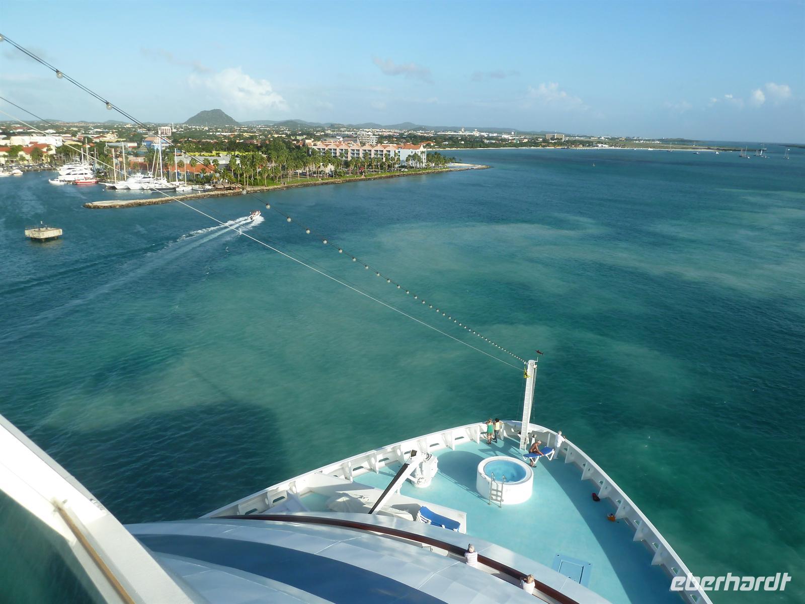 Alle Frühaufsteher können bereits 07.11 Uhr den Sonnenaufgang erleben und langsam erwacht auch das Leben an Bord. Der Tag beginnt mit einem herrlichen Frühstück und Sonneschein. Bei der Ausflugspräsentation für Aruba können wir uns über die Landausflüge in unserem ersten Hafen informieren. Um 10.20 Uhr steht dann die obligatorische Seenotrettungsübung an und wir begeben uns mit unseren Rettungswesten zu den Musterstationen. Sicherheit wird an Bord schließlich groß geschrieben! Danach heißt es entspannen auf dem Sonnendeck. Die Entertainment-Crew sorgt für Unterhaltung und die Küchen- und Bar-Crew für unser leibliches Wohl. Nach dem Mittagessen treffen wir uns mit Entertainment Managerin Jana zum Sektempfang und lernen unser schwimmendes Hotel bei einem Rundgang genauer kennen. Mit viel Charme und Begeisterung erfahren wir, was es wann und wo zu erleben gibt - inklusiver einiger Geheimtipps für unsere Reise. Ein bisschen stolz sind wir schon, dass wir von einem der Offiziere höchstpersönlich geführt werden! Am Abend heißt es im Theater "Vorhang auf" zur "Welcome Show". Unser Kapitän Sven Gärtner stellt seine Offiziere vor und das Showensemble entführt uns musikalisch und tänzerisch in die Welt der Seefahrt. In der gemütlichen Atmosphäre der Nightfly Bar kann man dem musikalischen Duo "Seabiscuit" lauschen - ein herrlicher Ausklang für einen entspannten Tag an Bord.