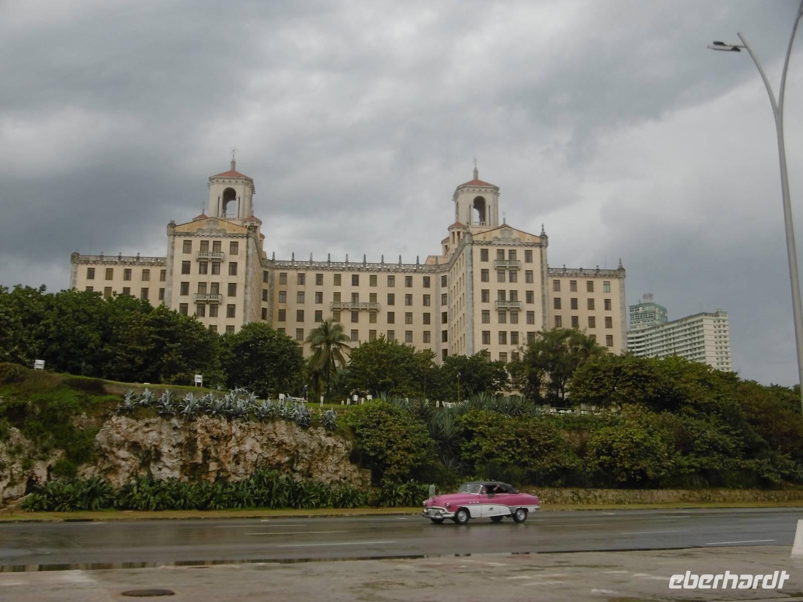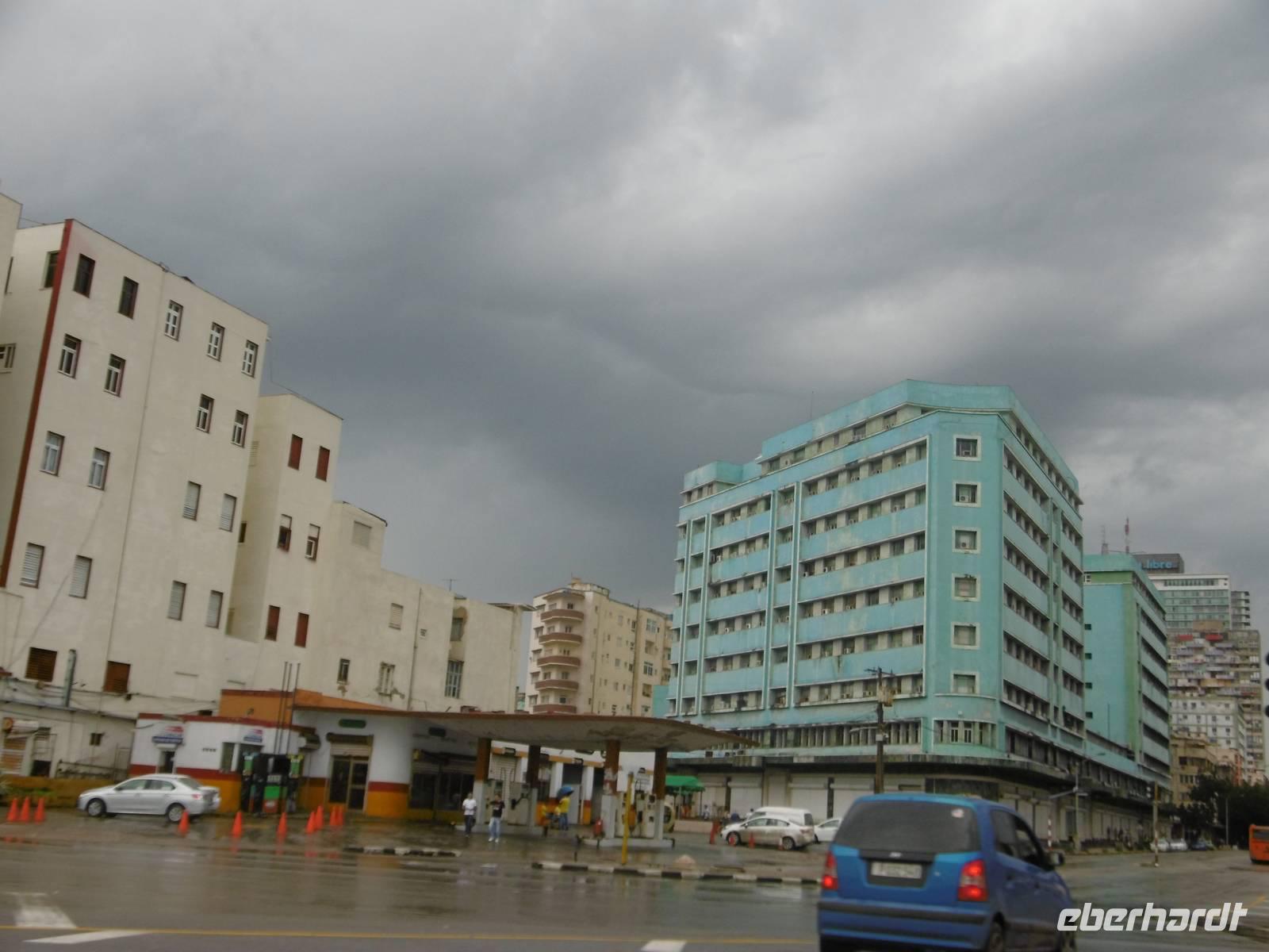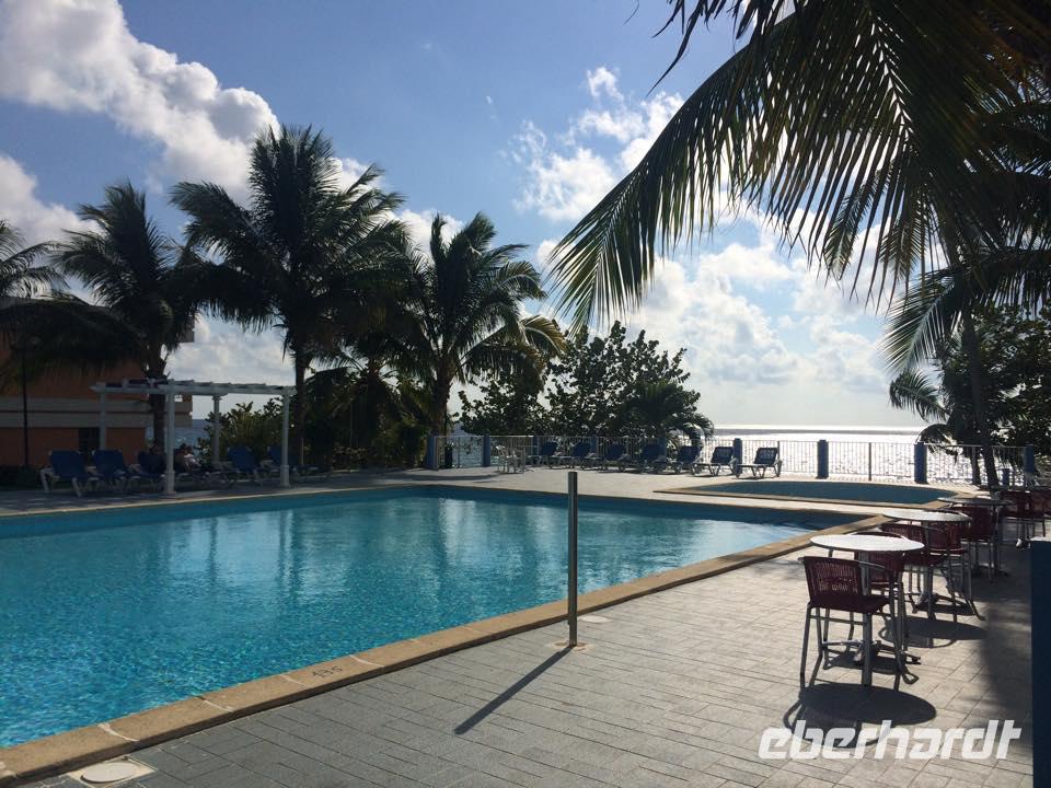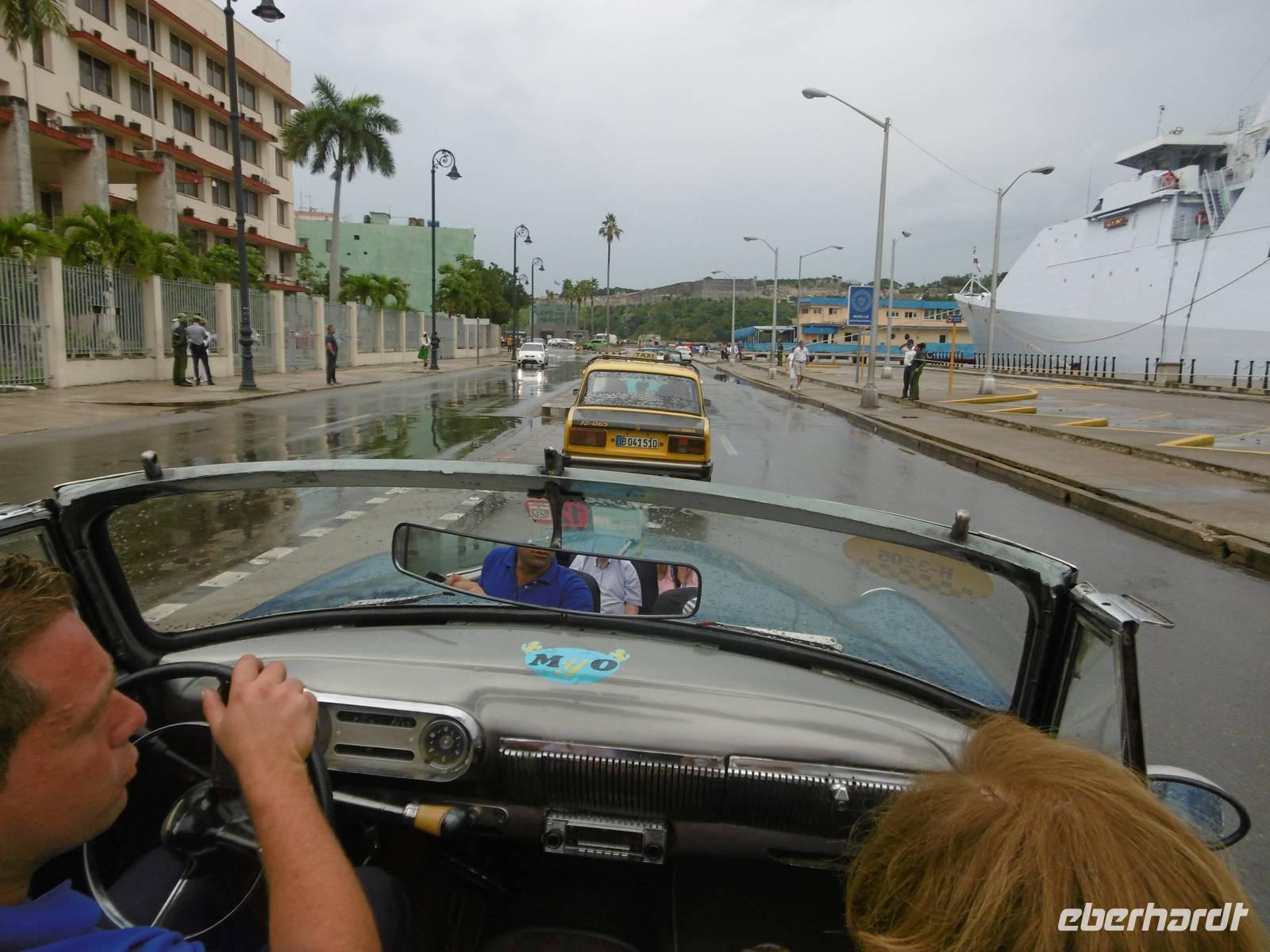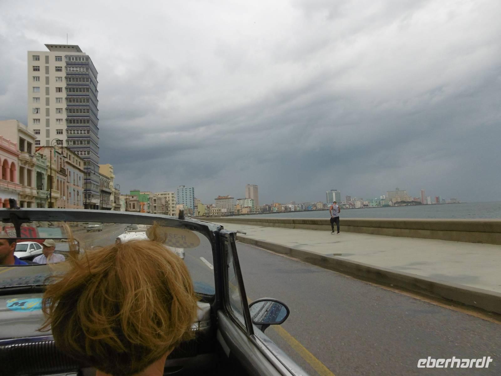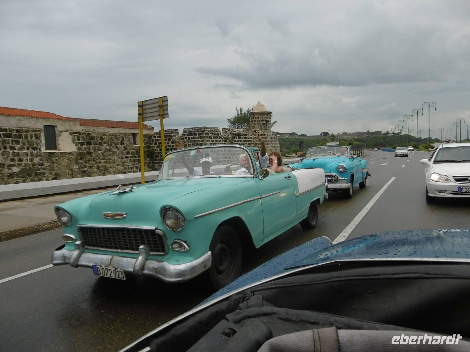Nach dem Frühstück fahren wir zurück nach Havanna. Unsere Reise neigt sich dem Ende entgegen, doch noch haben wir einige tolle Sachen für die Hauptstadt geplant. Wir fahren an der größten Erdölraffinerie Kubas vorbei und halten auch nochmal an unserer Lieblings Pina Colada Bar. Dann begrüßt uns schon die Hauptstadt und wir spazieren in die Alstadt, wo wir im Restaurant La Moneda Kubana zu Mittag essen. Dabei werden wir auf der Terrasse von einem heftigen Regenschauer überrascht wie er hier in der Karibik üblich ist. Dieses Regenwetter hält den übrigen Tag an, denn über Westkuba zieht gerade eine Kältefront. Marcos war so lieb und hat uns Eintritt ins Hemingway Zimmer im Hotel Ambos Mundos beschafft, da dieses ja am Neujahrstag geschlossen gewesen war. Nach dem Besuch gibt es auf der Dachterrasse noch einen Mojito für alle. Weiter geht es zu Fuß zum Havana Club Rummuseum. Hier zeigt und erklärt uns eine deutschsprachige Führerin die Geschichte, den Anbau und die Produktion von Zuckerrohr und die verschiedenen Havana Club Rumsorten. Im Anschluss daran probieren wir den 7-jährigen Rum und haben im Souvenirshop die Möglichkeit die Flaschen zu einem unschlagbaren Preis zu kaufen. Unsere Oldtimer für die nachmittägliche Rundfahrt erwarten uns schon am Ausgang des Museums. Vier tolle Cabrios! So starten wir gen Malecon und fahren dann durch die damaligen Reichenviertel Vedado und Miramar. Mitten drin werden wir wieder vom Regen überrascht, doch gottseidank haben unsere Cabrios ein Regendach. :) Den Abend lassen wir aufgrund des schlechten Wetters gemütlich im Hotel ausklingen.