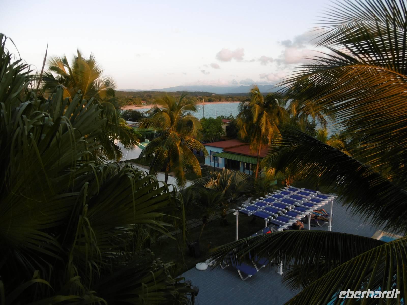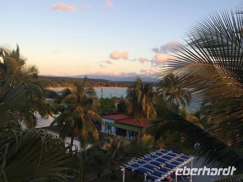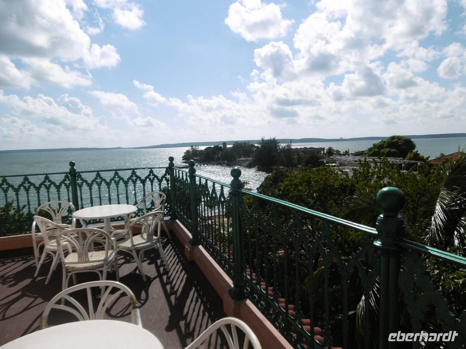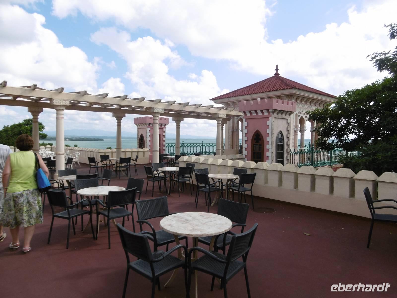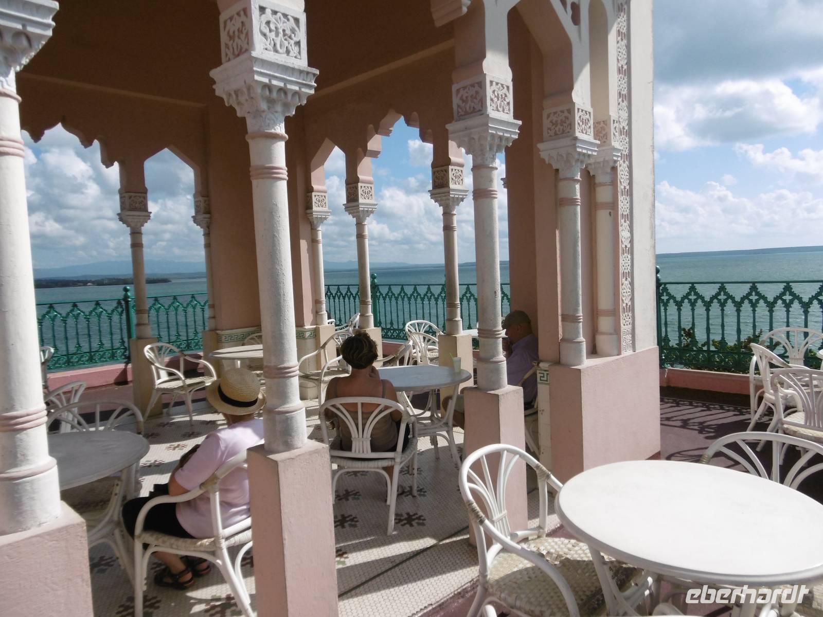 Und wieder haben wir Glück mit dem Wetter - die Sonne strahlt und wir frühstücken heute auf der Terrasse des Hotels Faro Luna mit Blick aufs Meer. Dann brechen wir auf in Richtung Stadt Cienfuegos. Auf halber Höhe befindet sich der Botanische Garten. Diesen hat ein Amerikaner entworfen und Gewächse aus aller Welt gesammelt und gezüchtet. 97 Hektar umfasst der Garten, doch wir schauen uns nur einen kleinen Teil der Anlage an. Da wir kurz vor neun Uhr da sind, sind wir die einzigen Touristen und können die morgendliche Stimmung im Garten in Ruhe aufnehmen. Eine Botanikerin erklärt uns die ulkigsten Gewächse und Marcos übersetzt. So sehen wir zum Beispiel einen Kanonenkugelbaum, Mahagonibaum, Leberwurstbaum, Paranussbaum, Bambus, verschiedene Palmenarten, wunderschöne Fikusbäume und eine vielfältige Blütenpracht. Nach dem Spaziergang geht es weiter in Richtung Cienfuegos - wieder mit einem Quiz und kleinen Santiago Rum Chupitos als Belohnung für die richtigen Antworten. In Cienfuegos besuchen wir zunächst das Teatro Terry - ein wichtiger Schauplatz Kubas Tanz- und Gesangstalente. Hier findet gerade eine Probe für die abendliche Vorstellung statt. Dann erklärt uns Marcos den Hauptplatz. Wir haben Zeit selbst durch die Straßen zu schlendern. Auf dem Boulevard bieten sich typische Szenen. So entdecken wir zum Beispiel einen rustikalen Friseursalon, eine Zahnarztpraxis, riesige Schlangen vor den Lebensmittelläden (heute gibt es Eier) und in den Haushaltwarenläden. Am Samstag ist Cienfuegos voller kauflustiger Kubaner. Das Mittagessen nehmen wir heute in einem unscheinbaren Paladar am Prado mit ausgezeichnetem Essen und herzlichen Service ein. Am Malecon entlang geht es zurück in Richtung Hotel und Überraschung: wir halten am schönsten Gebäude Cienfuegos - dem Palacio del Valle. Marrokanische Baukunst trifft hier auf französiches Flair. Oben auf der Dachterrasse bietet sich ein traumhafter Ausblick über die Bahia de Cienfuegos und wir stoßen mit einem Cocktail an. Anschließend geht es zurück zum Hotel, wo wir bei viel Sonne den Rest des Tages am Strand ausklingen lassen.