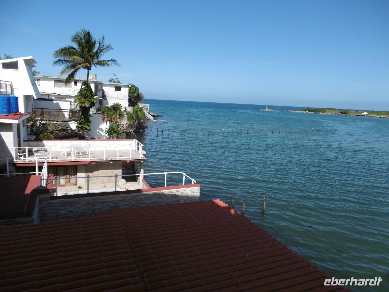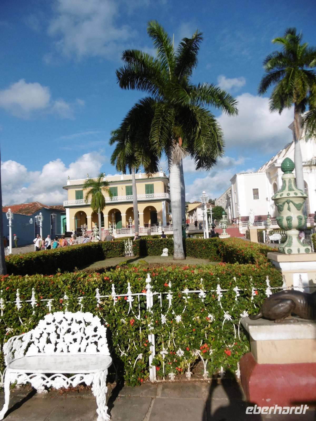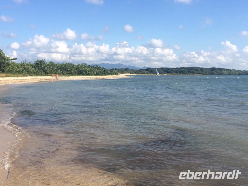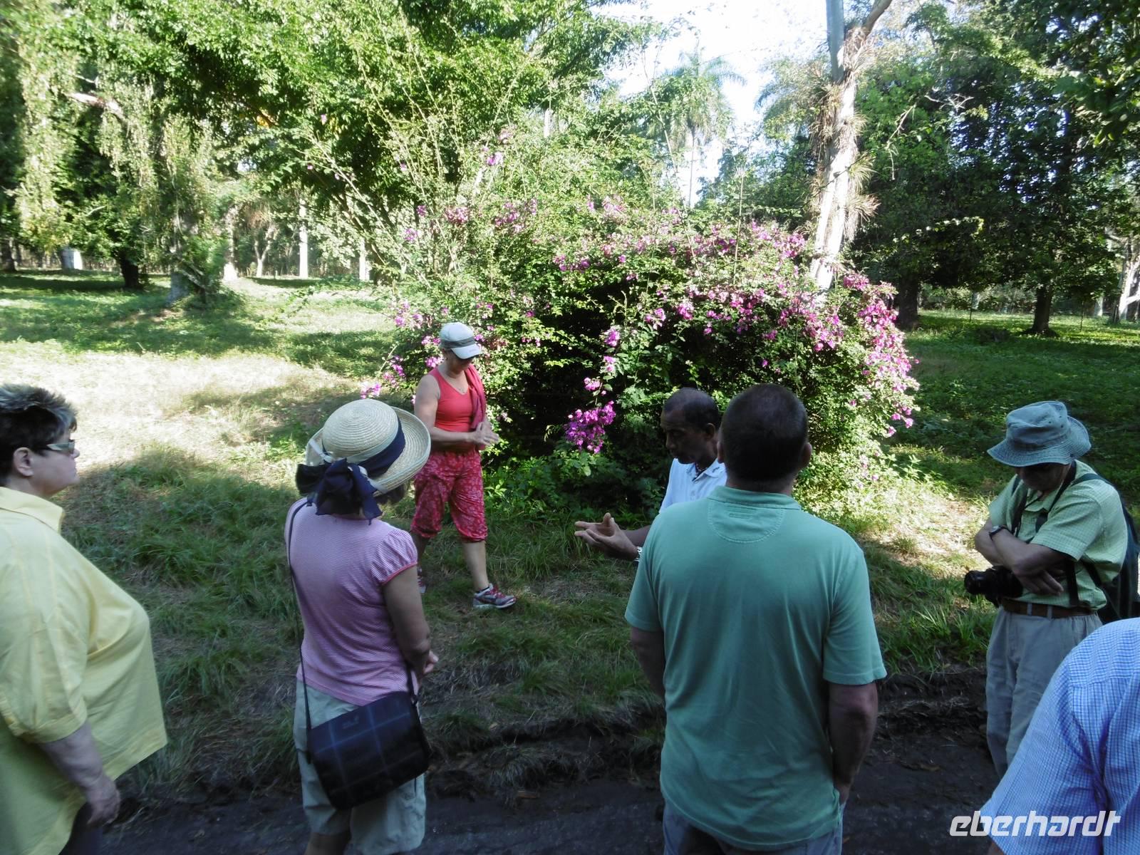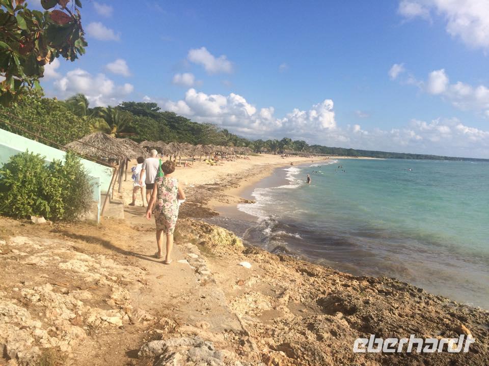 Und wieder haben wir Glück mit dem Wetter - die Sonne strahlt und wir frühstücken heute auf der Terrasse des Hotels Faro Luna mit Blick aufs Meer. Dann brechen wir auf in Richtung Stadt Cienfuegos. Auf halber Höhe befindet sich der Botanische Garten. Diesen hat ein Amerikaner entworfen und Gewächse aus aller Welt gesammelt und gezüchtet. 97 Hektar umfasst der Garten, doch wir schauen uns nur einen kleinen Teil der Anlage an. Da wir kurz vor neun Uhr da sind, sind wir die einzigen Touristen und können die morgendliche Stimmung im Garten in Ruhe aufnehmen. Eine Botanikerin erklärt uns die ulkigsten Gewächse und Marcos übersetzt. So sehen wir zum Beispiel einen Kanonenkugelbaum, Mahagonibaum, Leberwurstbaum, Paranussbaum, Bambus, verschiedene Palmenarten, wunderschöne Fikusbäume und eine vielfältige Blütenpracht. Nach dem Spaziergang geht es weiter in Richtung Cienfuegos - wieder mit einem Quiz und kleinen Santiago Rum Chupitos als Belohnung für die richtigen Antworten. In Cienfuegos besuchen wir zunächst das Teatro Terry - ein wichtiger Schauplatz Kubas Tanz- und Gesangstalente. Hier findet gerade eine Probe für die abendliche Vorstellung statt. Dann erklärt uns Marcos den Hauptplatz. Wir haben Zeit selbst durch die Straßen zu schlendern. Auf dem Boulevard bieten sich typische Szenen. So entdecken wir zum Beispiel einen rustikalen Friseursalon, eine Zahnarztpraxis, riesige Schlangen vor den Lebensmittelläden (heute gibt es Eier) und in den Haushaltwarenläden. Am Samstag ist Cienfuegos voller kauflustiger Kubaner. Das Mittagessen nehmen wir heute in einem unscheinbaren Paladar am Prado mit ausgezeichnetem Essen und herzlichen Service ein. Am Malecon entlang geht es zurück in Richtung Hotel und Überraschung: wir halten am schönsten Gebäude Cienfuegos - dem Palacio del Valle. Marrokanische Baukunst trifft hier auf französiches Flair. Oben auf der Dachterrasse bietet sich ein traumhafter Ausblick über die Bahia de Cienfuegos und wir stoßen mit einem Cocktail an. Anschließend geht es zurück zum Hotel, wo wir bei viel Sonne den Rest des Tages am Strand ausklingen lassen.